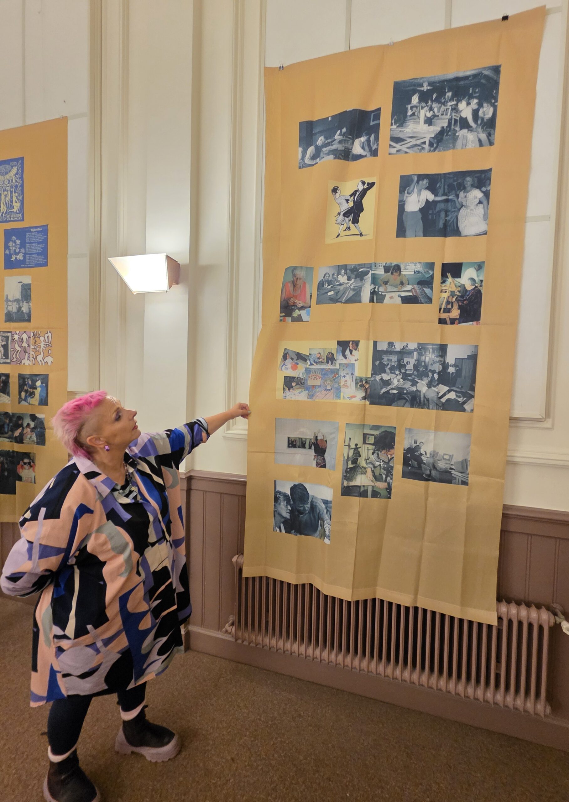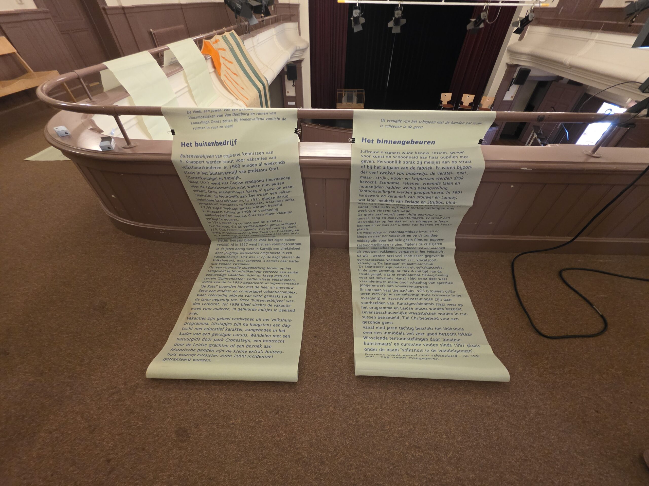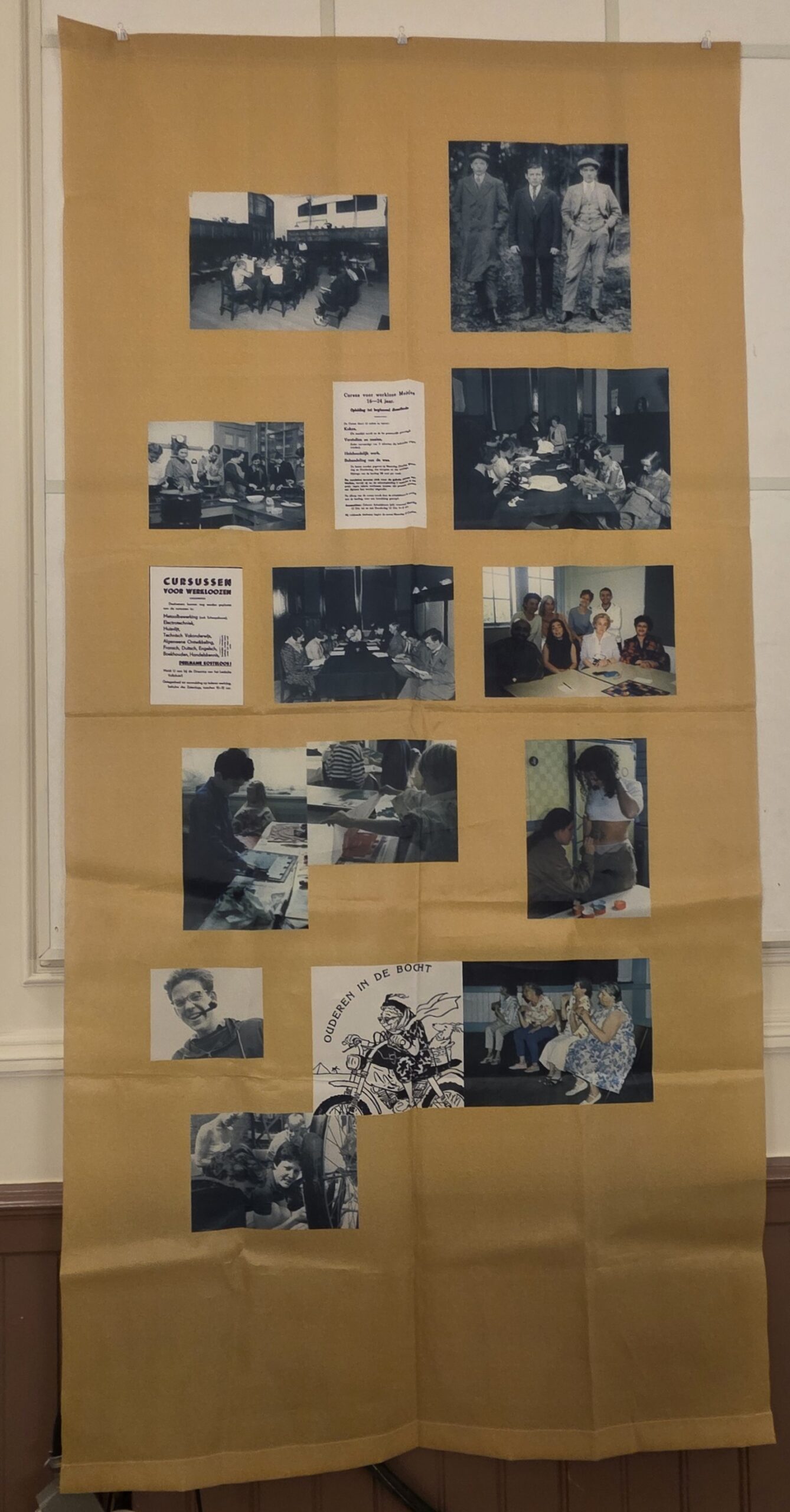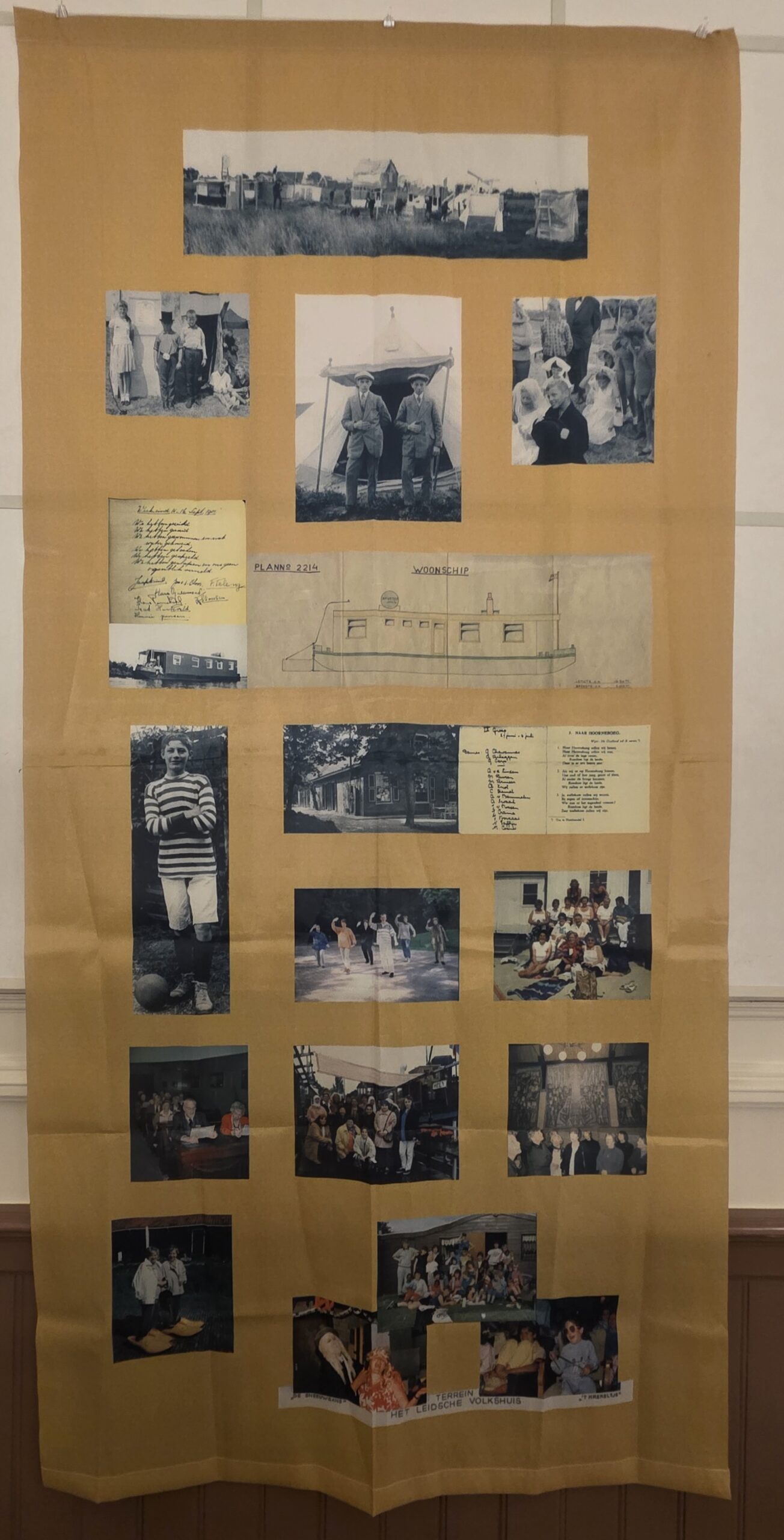In het gebouw hangen foto’s, vlaggen en allerlei herinneringen uit het verleden van het Leidse Volkshuis.