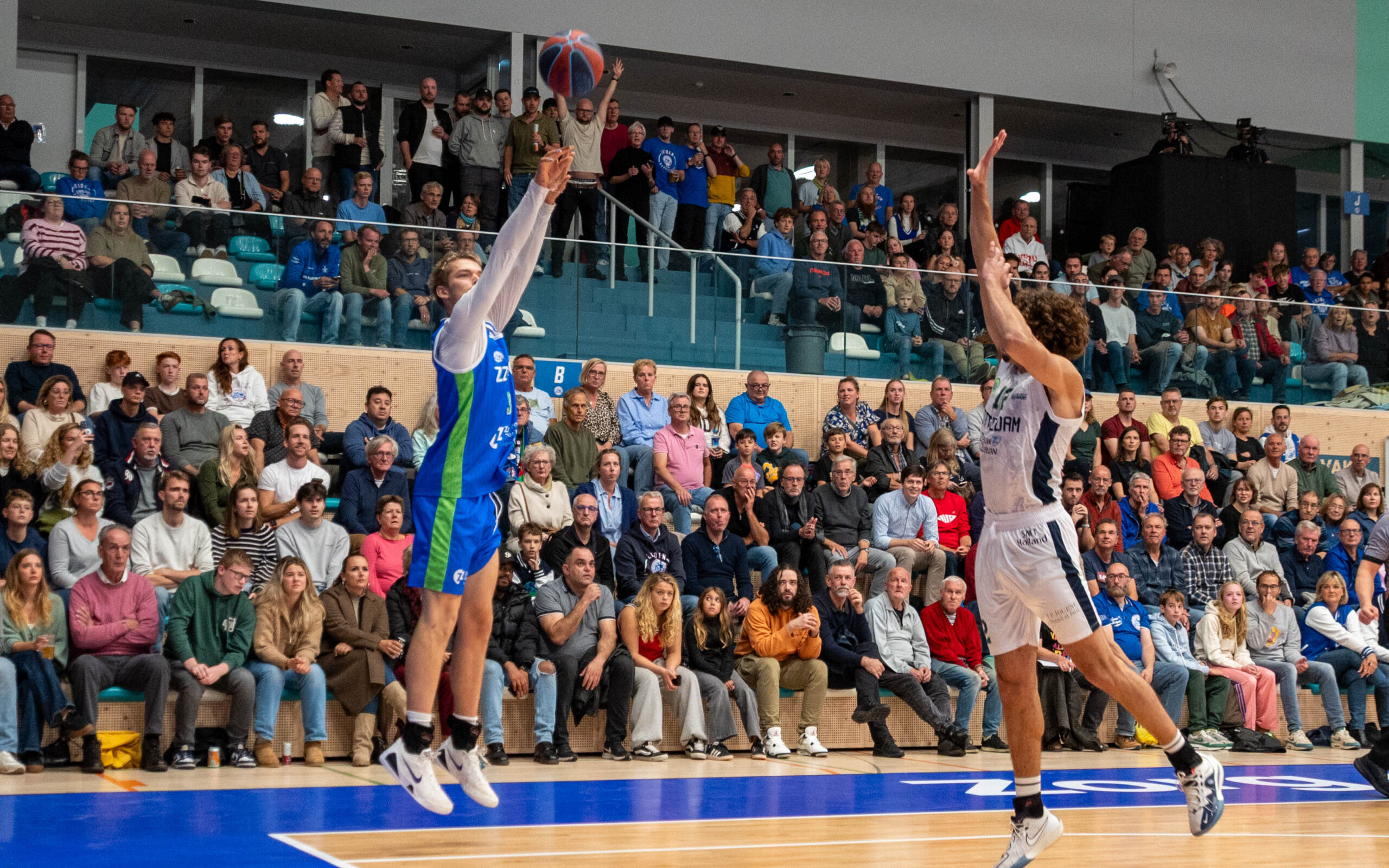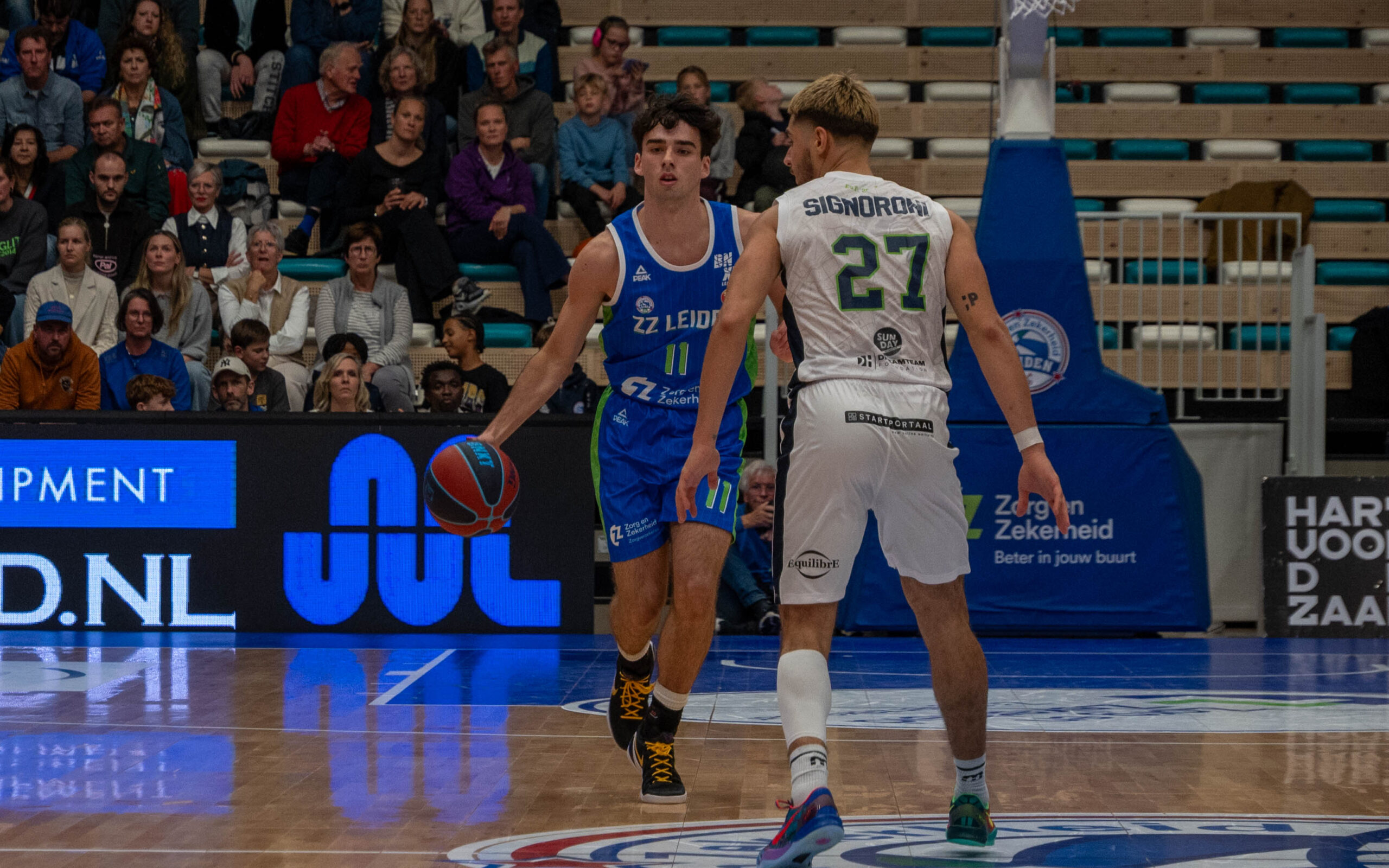 Ook van afstand werd er met scherp geschoten door Javian McCollum en Lucas Kruithof. Via 24-11 snelde ZZ Leiden door naar 30-15, wat de eindstand van het eerste kwart leek te worden. Totdat Dimitri Maconda met nog één seconde op de klok vanaf de middenlijn raak schoot: 33-15.