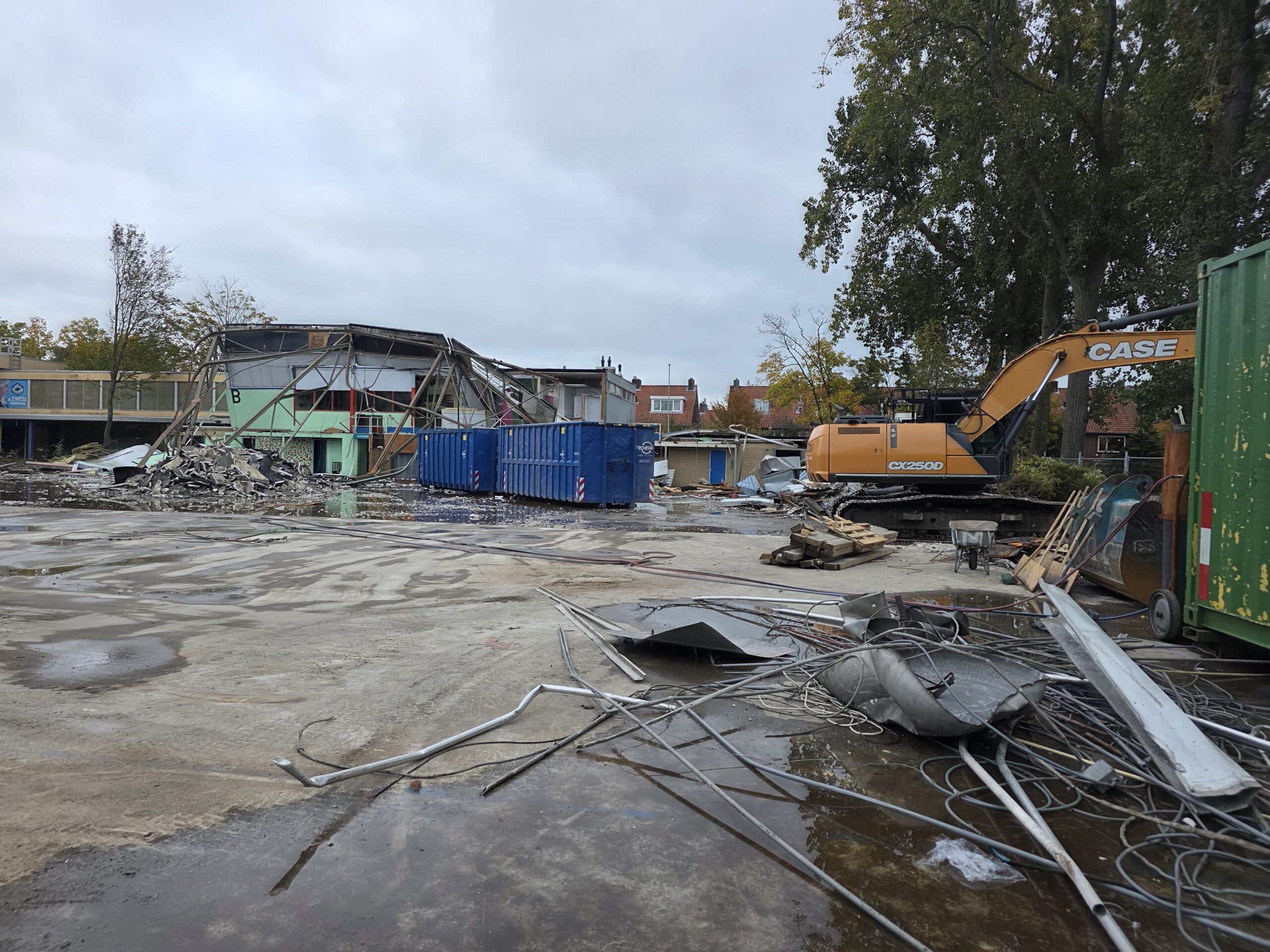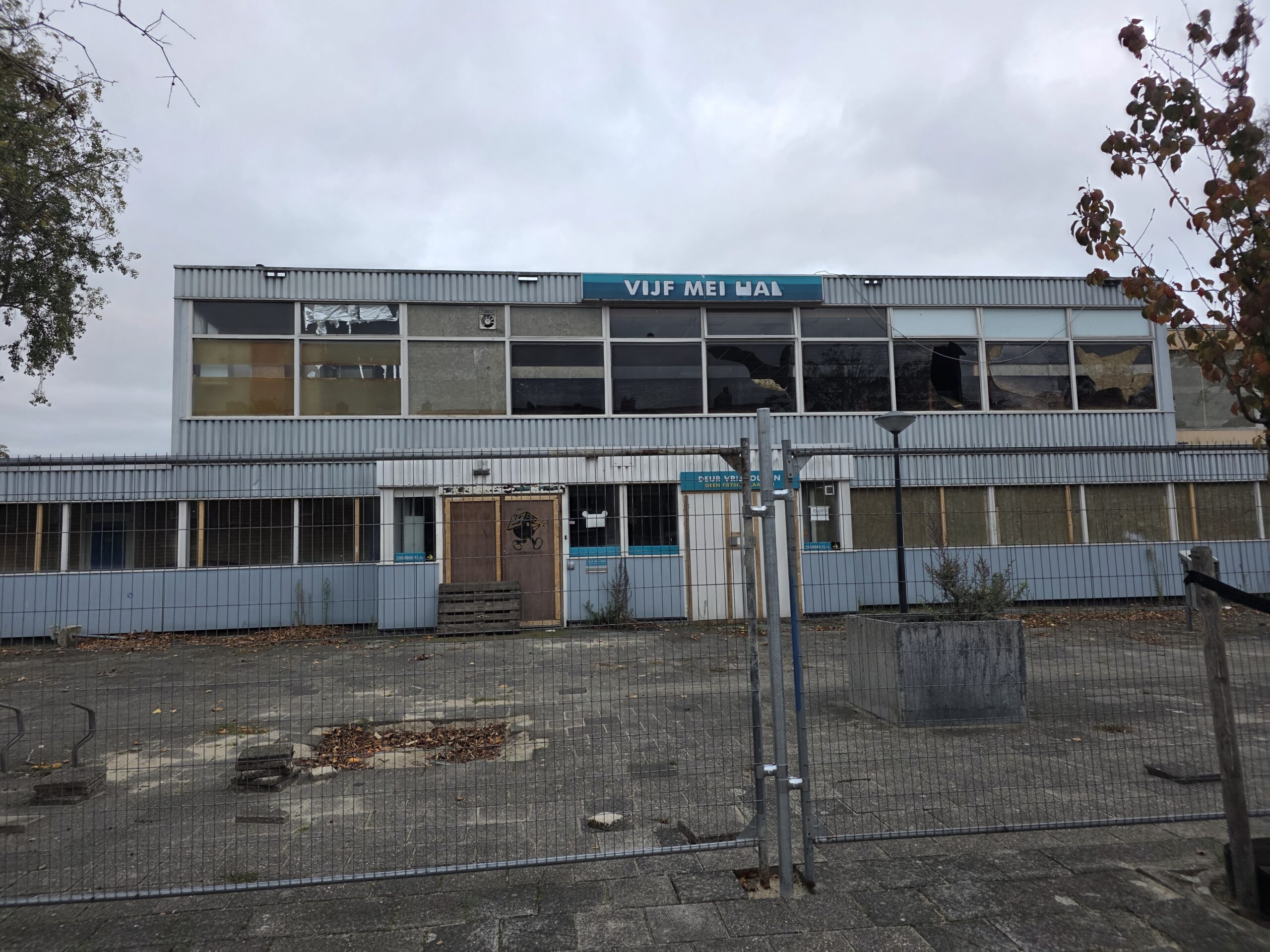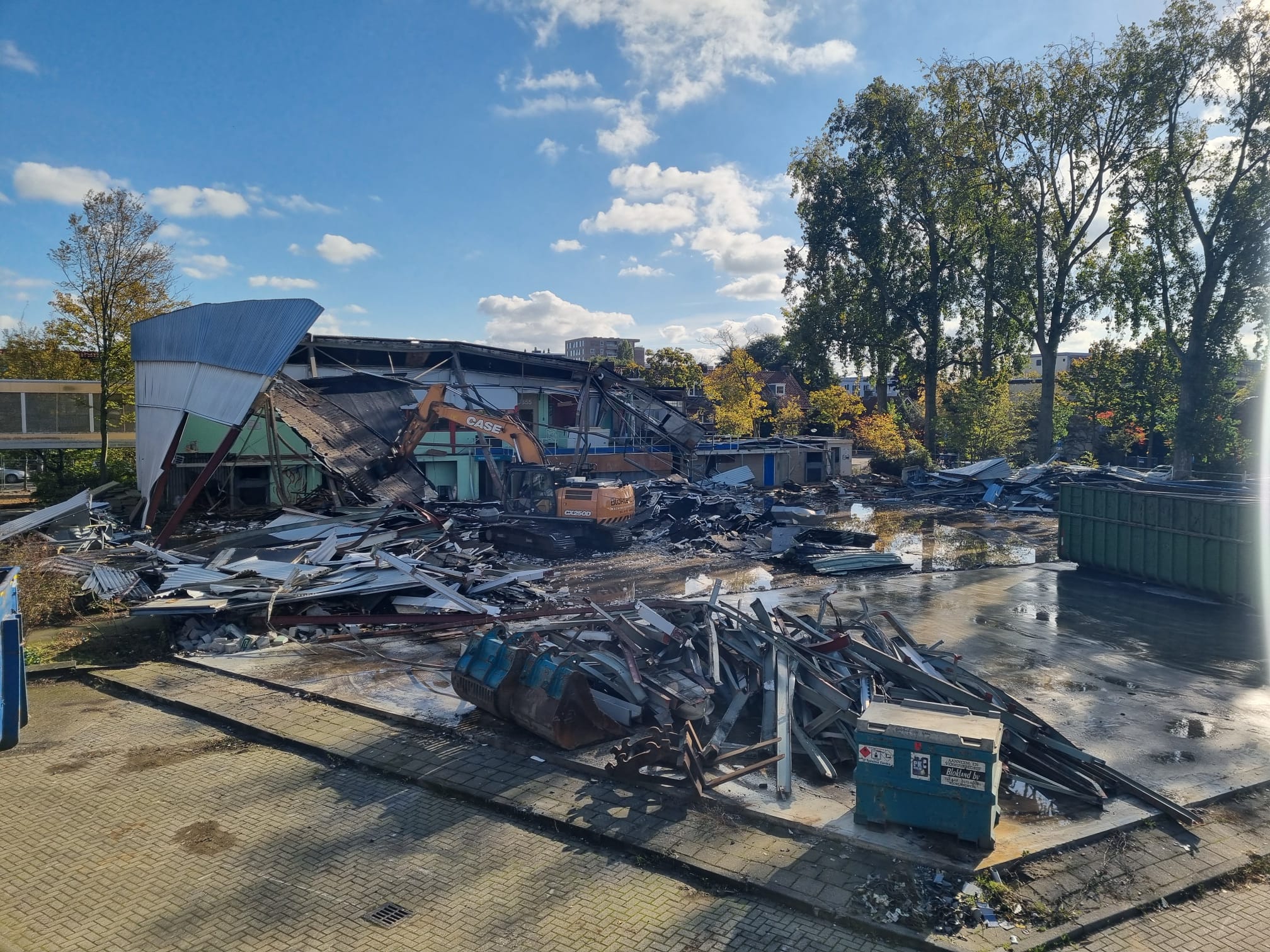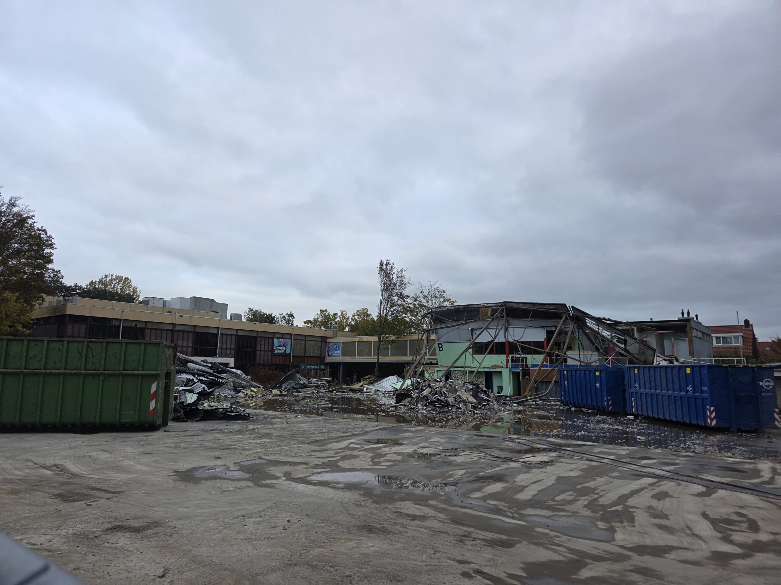 Begin juli werd begonnen met de sloop van de Vijf Meihal aan de Boshuizerlaan in Leiden Zuidwest. De eerste maanden was er nog niet zoveel te zien en ook nu staat de voorgevel nog overeind. Daarachter is de oude sporthal de afgelopen dagen echter vrijwel verdwenen.
