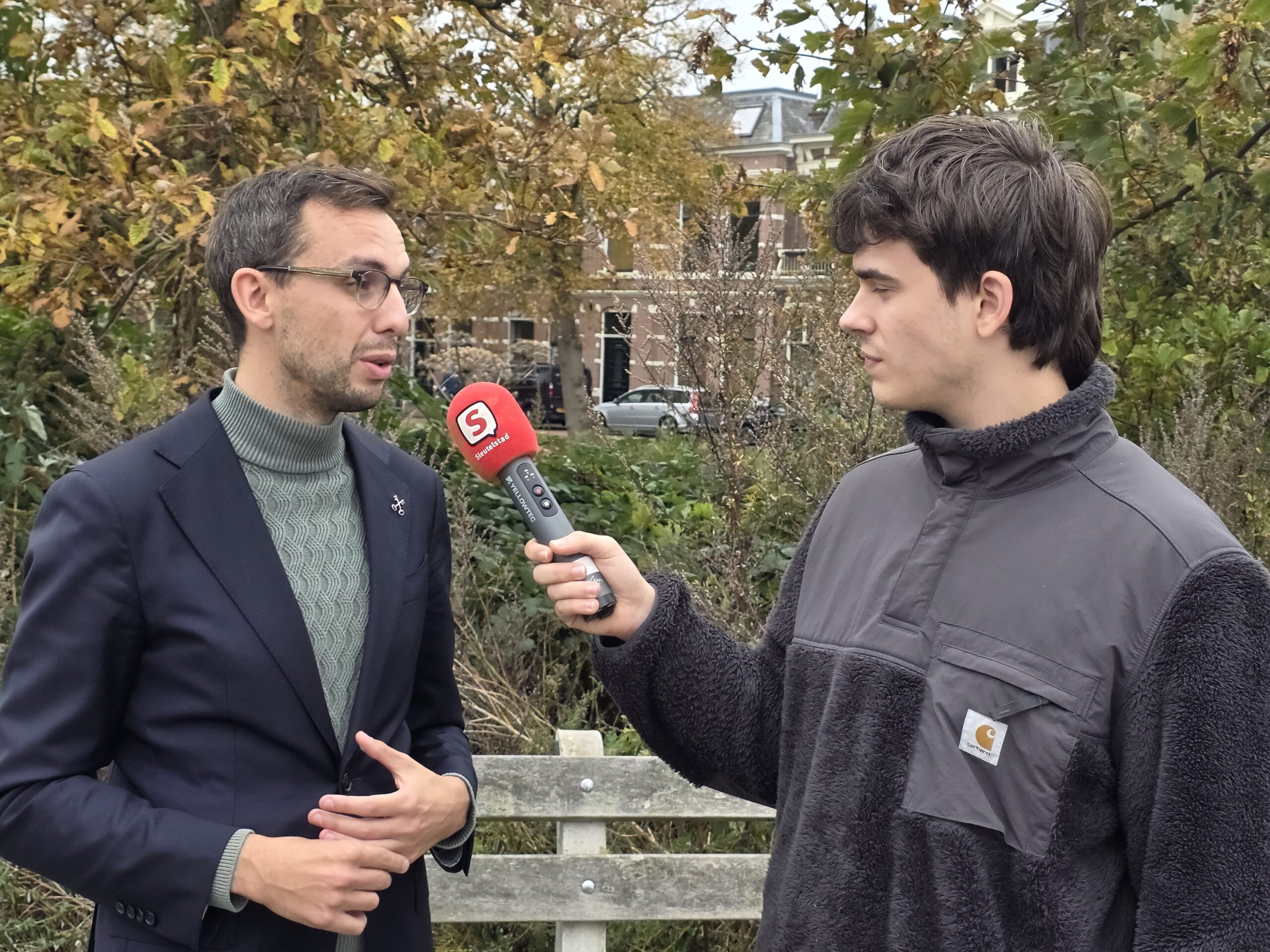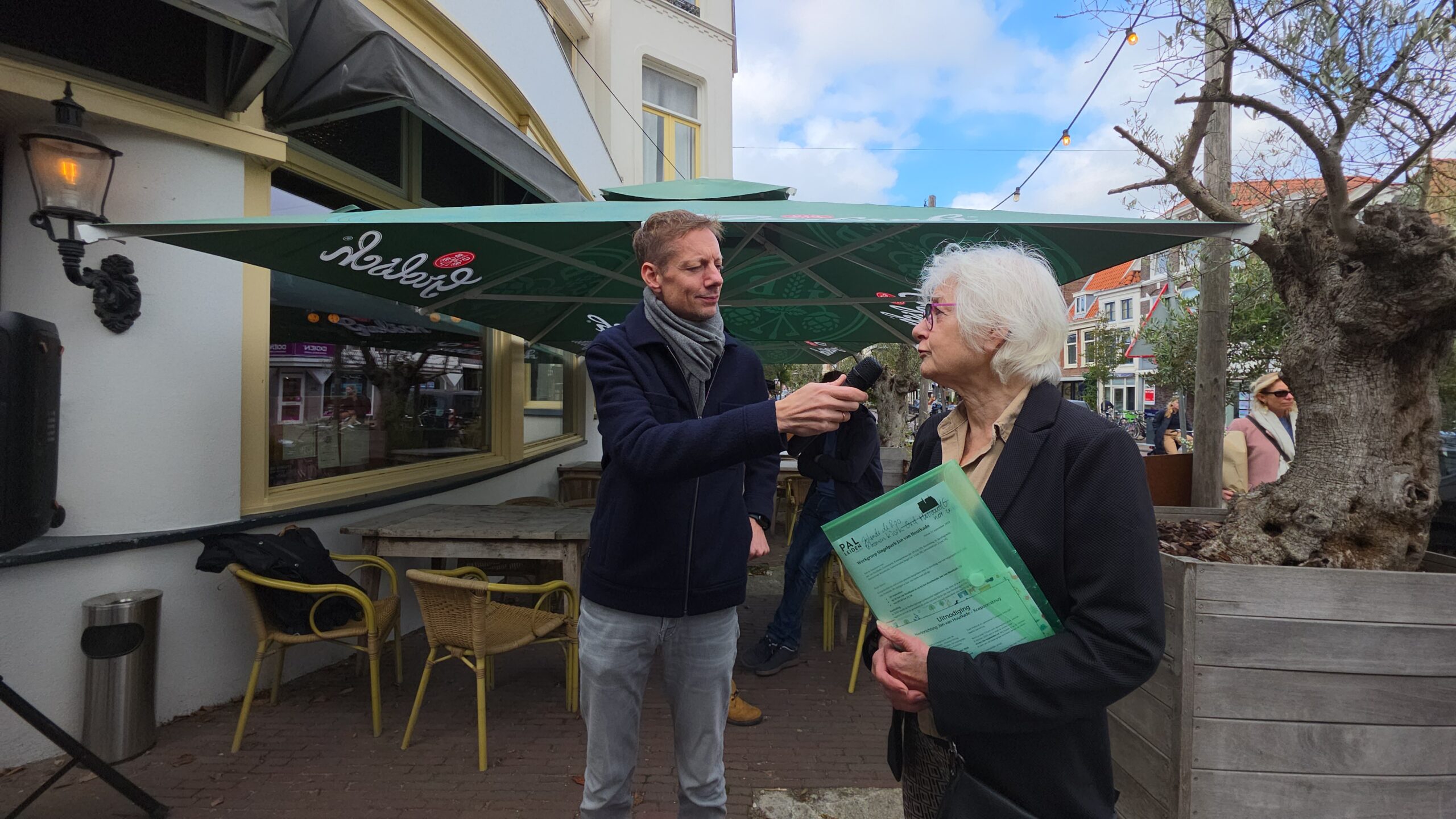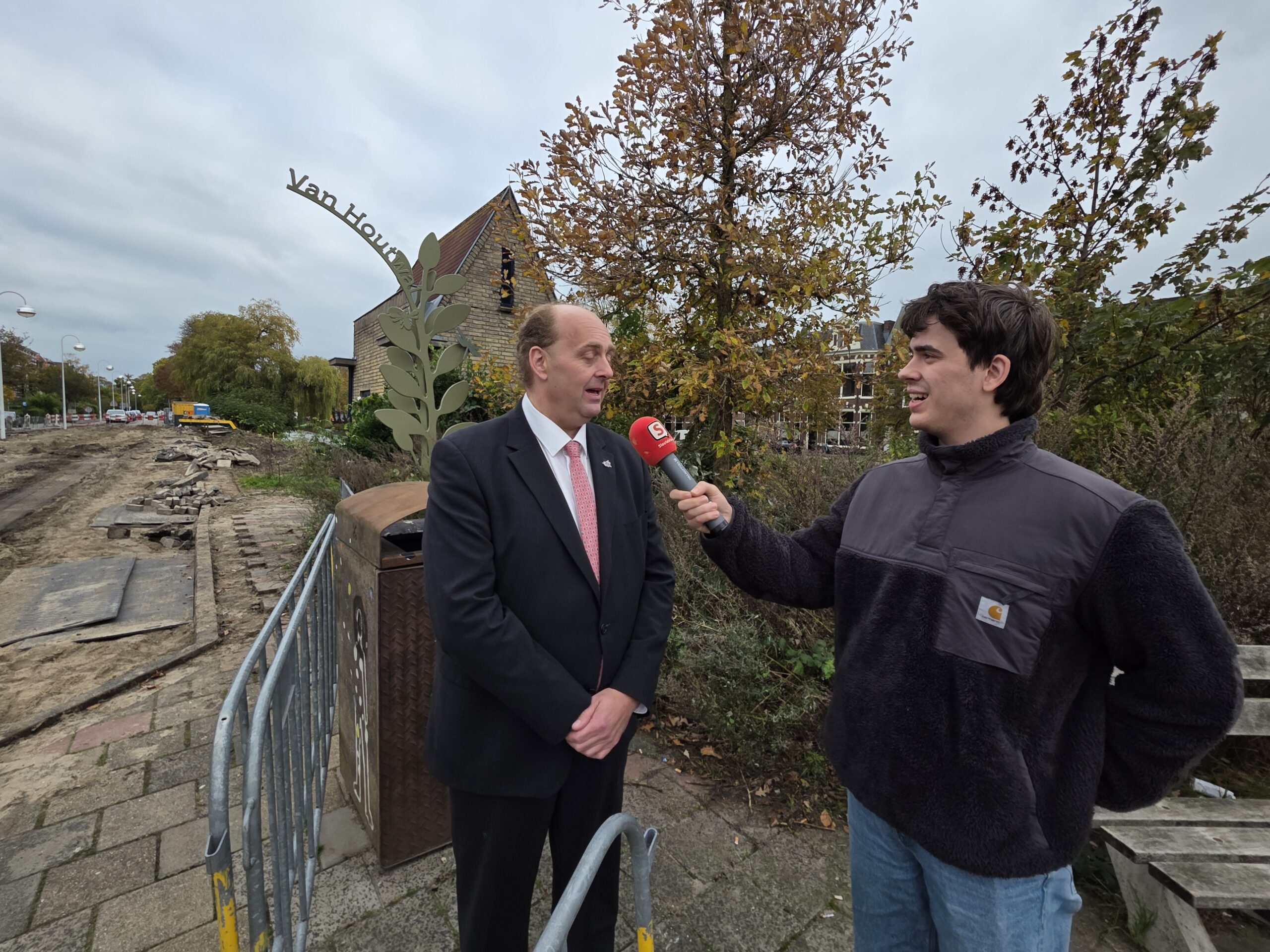 Wethouder North vertelt aan verslaggever Jesse Blom wat er gaat gebeuren bij de herinrichting van zowel de Jan van Houtkade als de Koepoortsbrug.