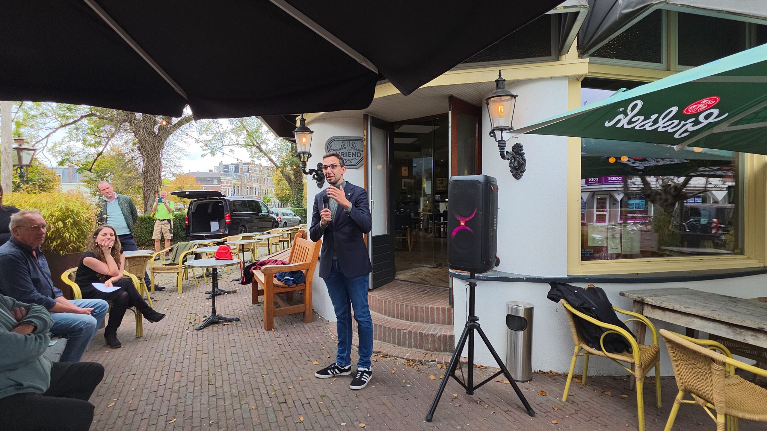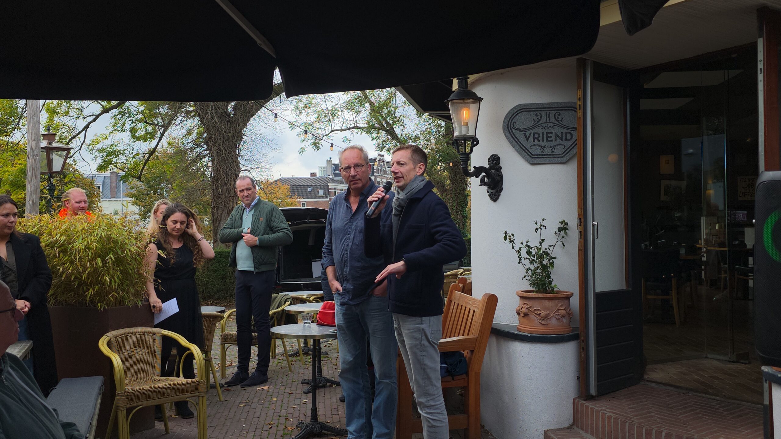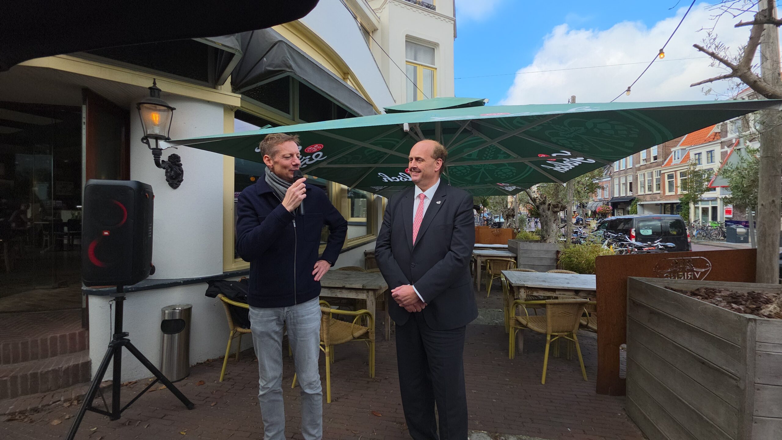 Wethouder North vertelt aan verslaggever Jesse Blom wat er gaat gebeuren bij de herinrichting van zowel de Jan van Houtkade als de Koepoortsbrug.