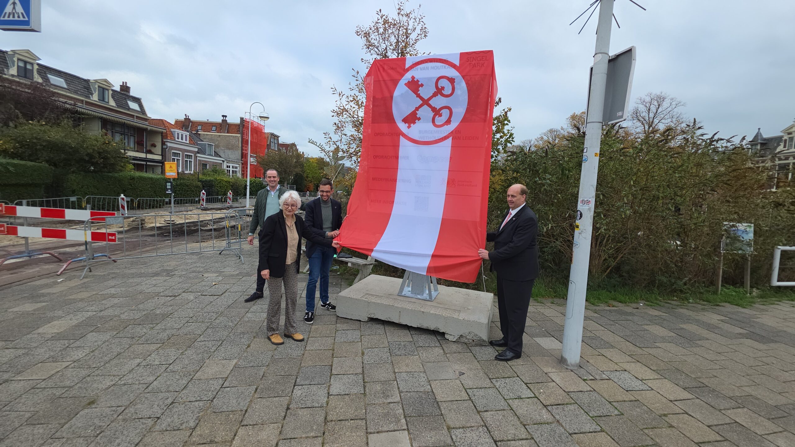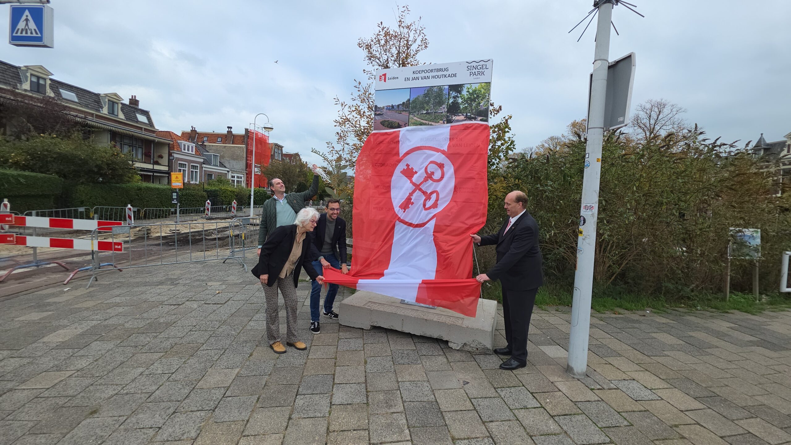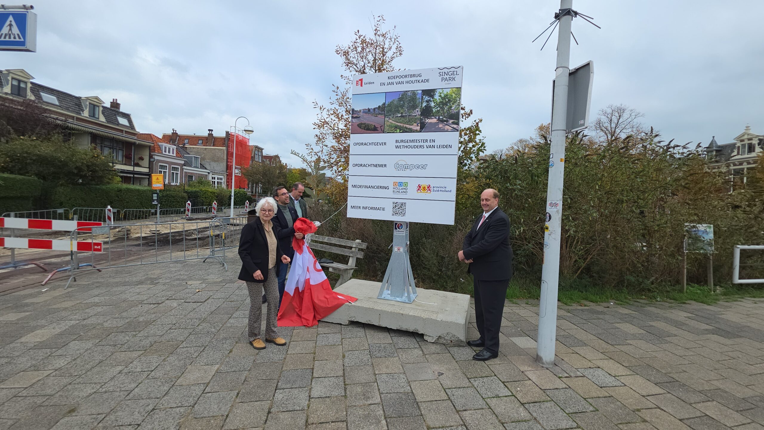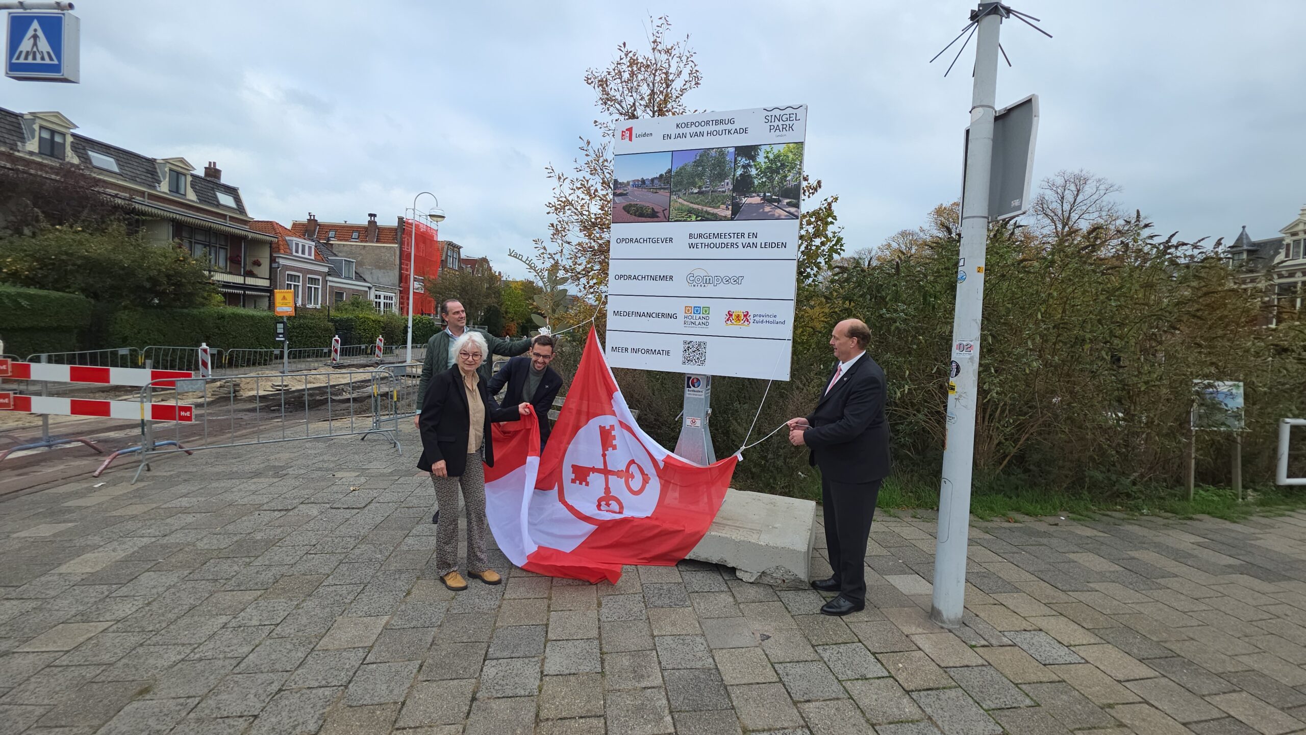 Met het onthullen van het bouwbord is vrijdagmiddag de herinrichting van de Jan van Houtkade officieel van start gegaan. Het komende jaar wordt er niet alleen gewerkt aan het vergroenen van de straat en het trottoir, maar ook de strook tussen de straat en het water krijgt een Singelparkwaardig uiterlijk. En een gedicht in braille.