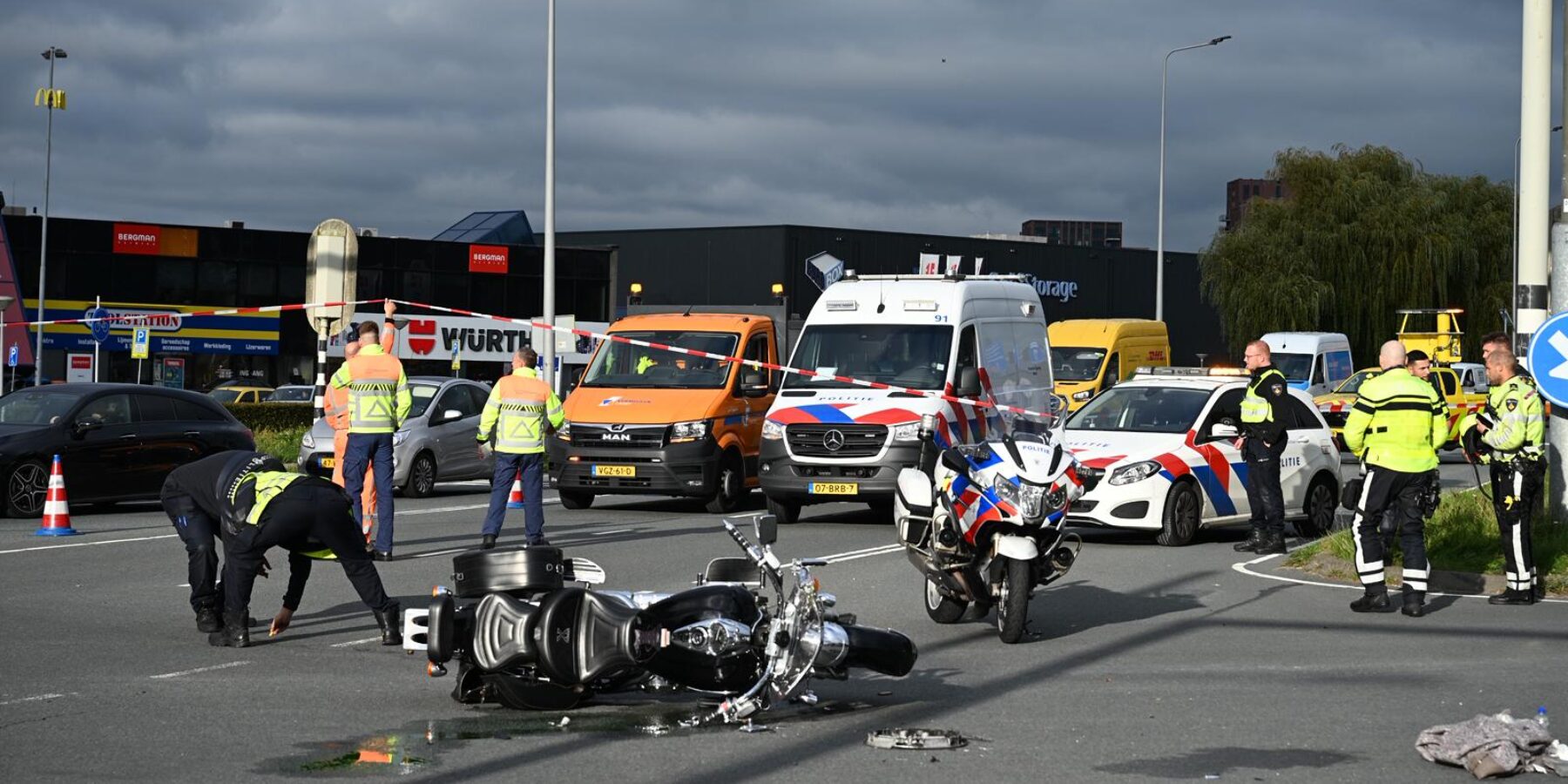 Bij een aanrijding tussen een motor en een auto op de Voorschoterweg ter hoogte van de Rooseveltstraat in Leiden is de motorrijder gewond geraakt.