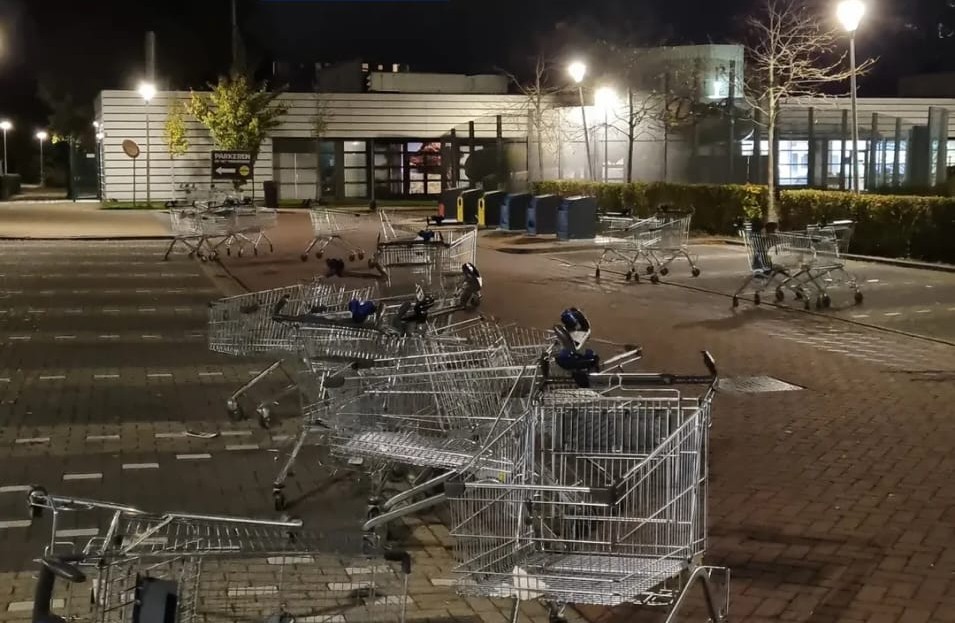 Een drukke boel op het parkeerterrein van supermarkt Lidl in Leiderdorp woensdagnacht. Onbekenden hadden daar op de parkeerplaatsen winkelwagentjes neergezet.