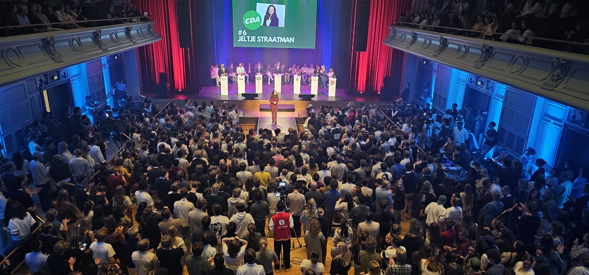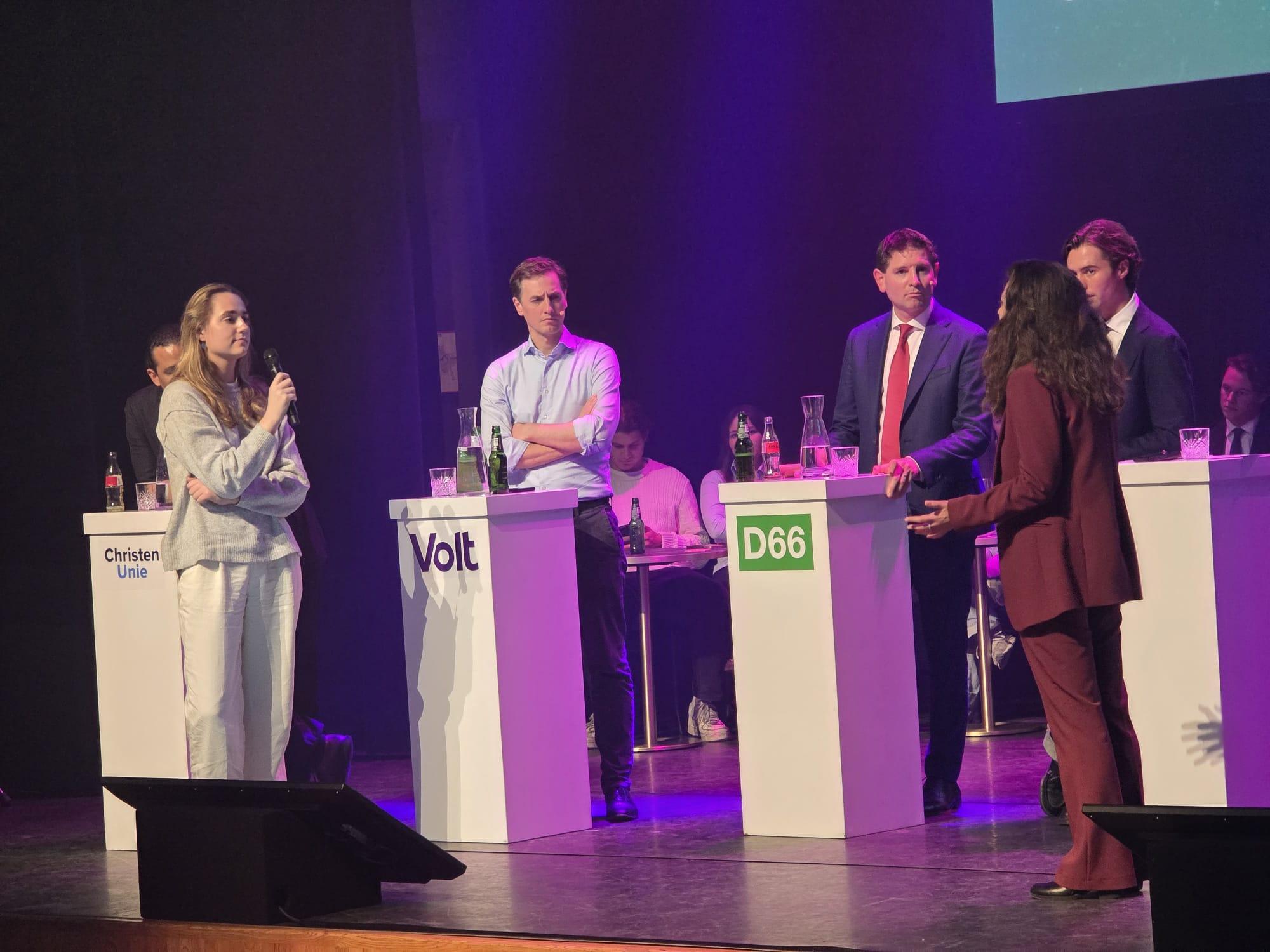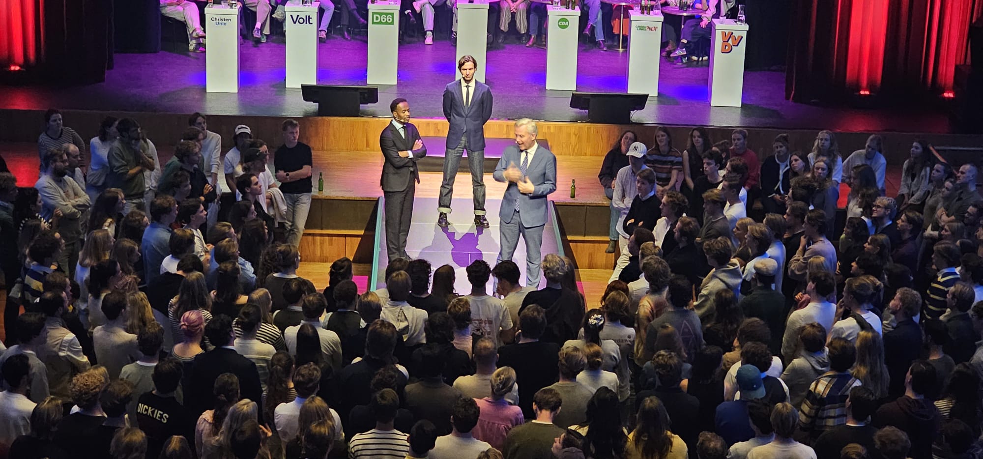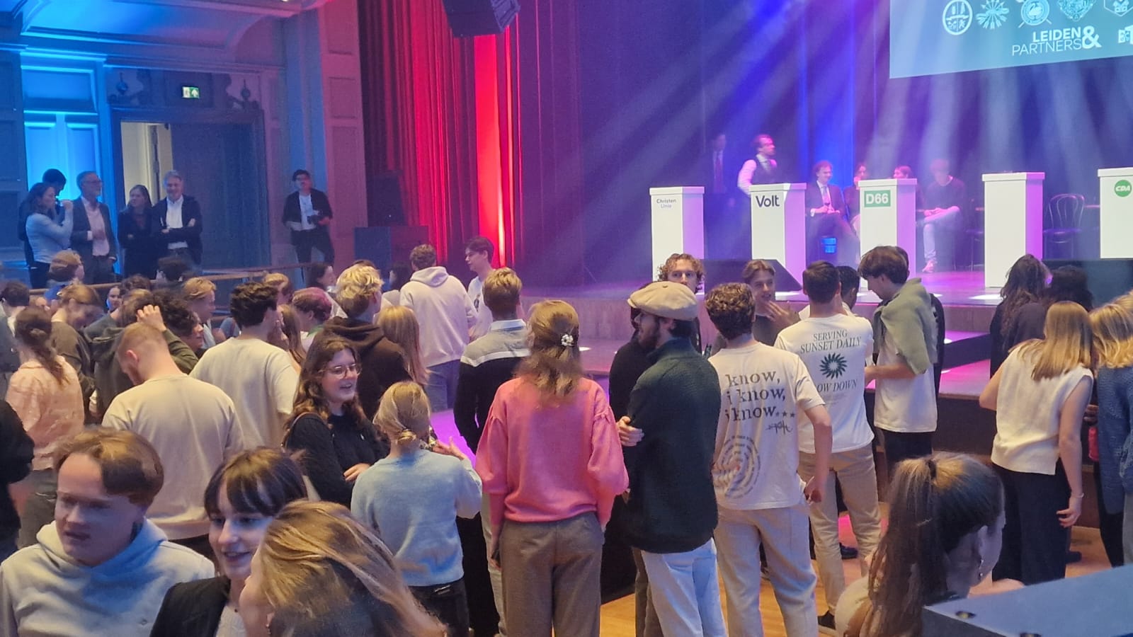 19.38 De Stadsgehoorzaal begint langzaam vol te lopen voor het studentendebat. Op het podium kruisen Jan Paternotte (D66), Laurens Dassen (Volt), Eric van der Burg (VVD) en Habtamu de Hoop (PvdA), Don Ceder (CU) en Jeltje Straatman (CDA) de degens.