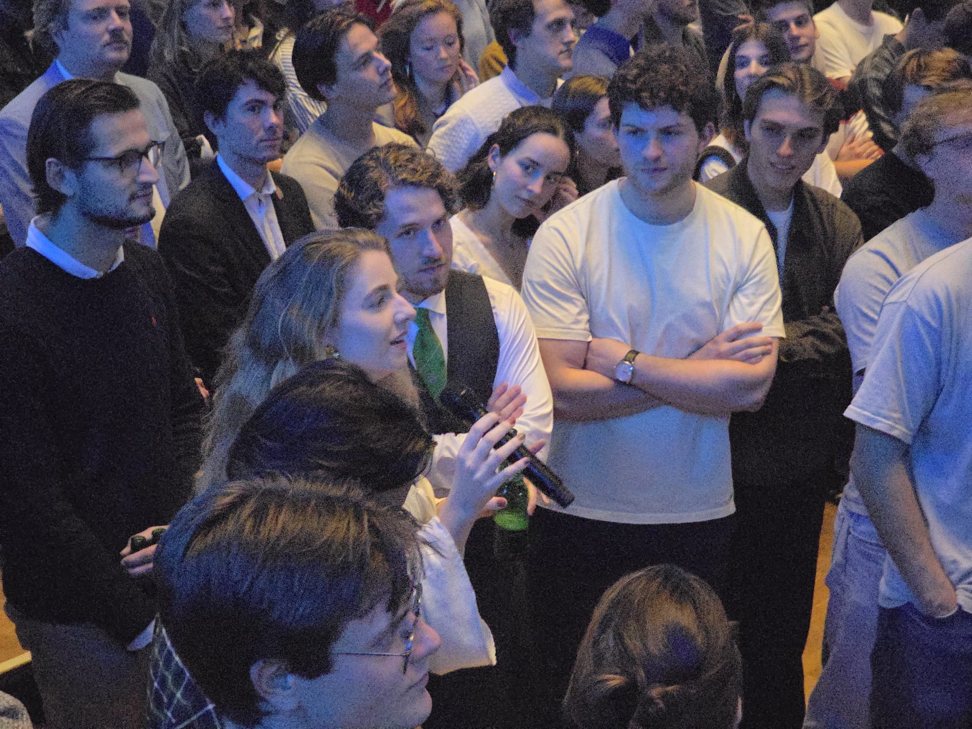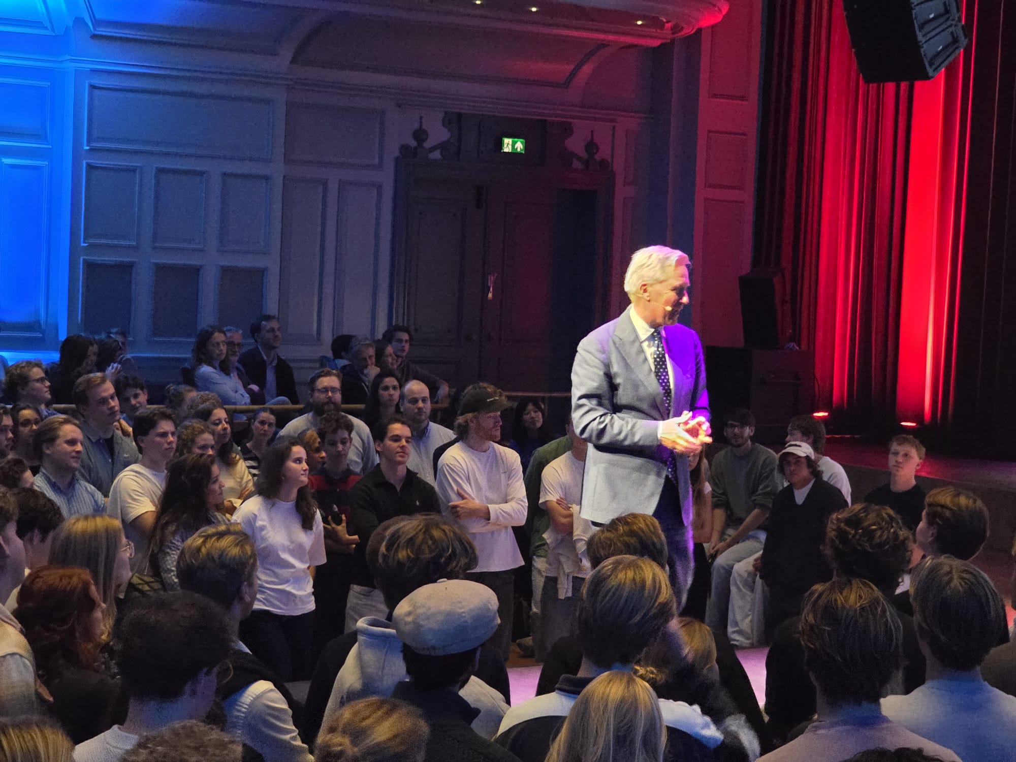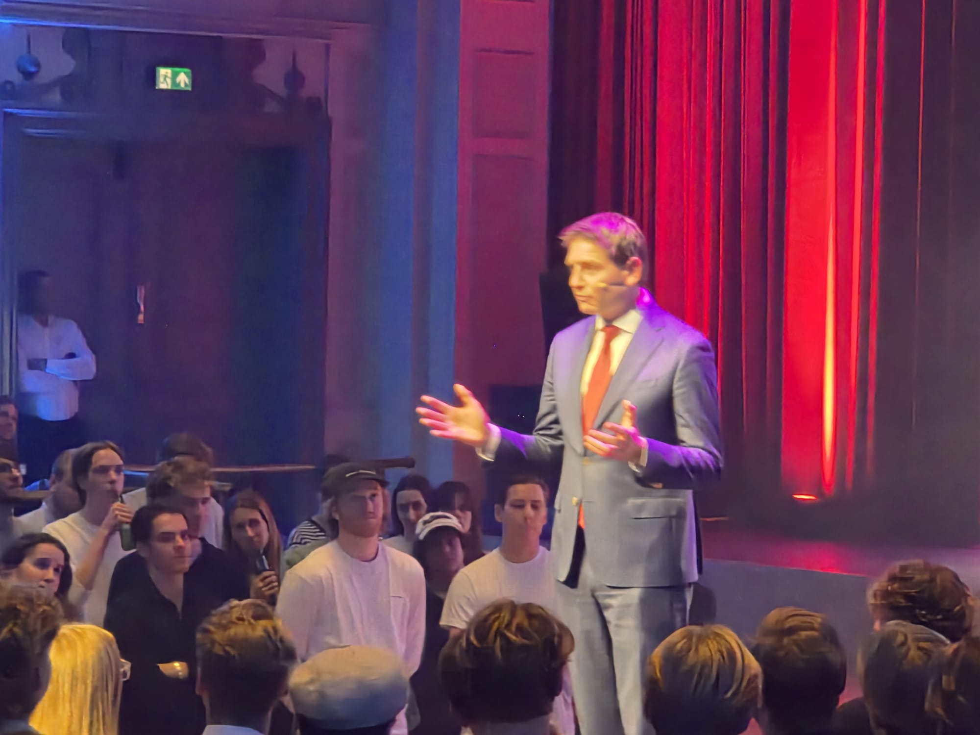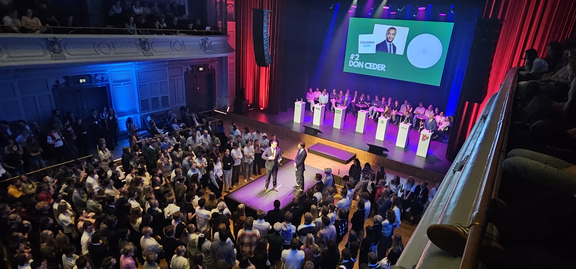 19.38 De Stadsgehoorzaal begint langzaam vol te lopen voor het studentendebat. Op het podium kruisen Jan Paternotte (D66), Laurens Dassen (Volt), Eric van der Burg (VVD) en Habtamu de Hoop (PvdA), Don Ceder (CU) en Jeltje Straatman (CDA) de degens.