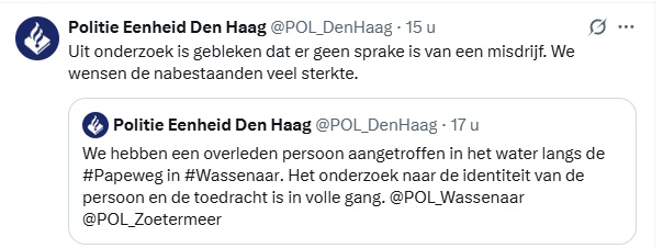 In een sloot langs de Papeweg in Wassenaar is zaterdagmiddag rond 15.45 uur het lichaam van een overleden persoon aangetroffen.