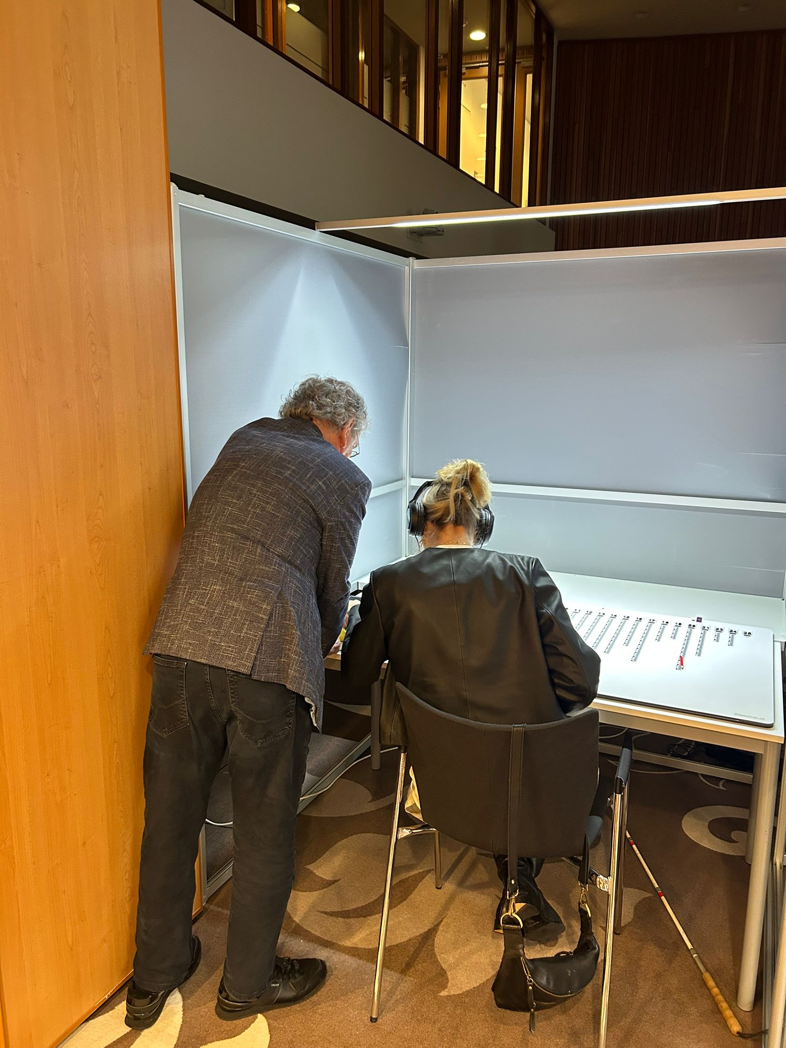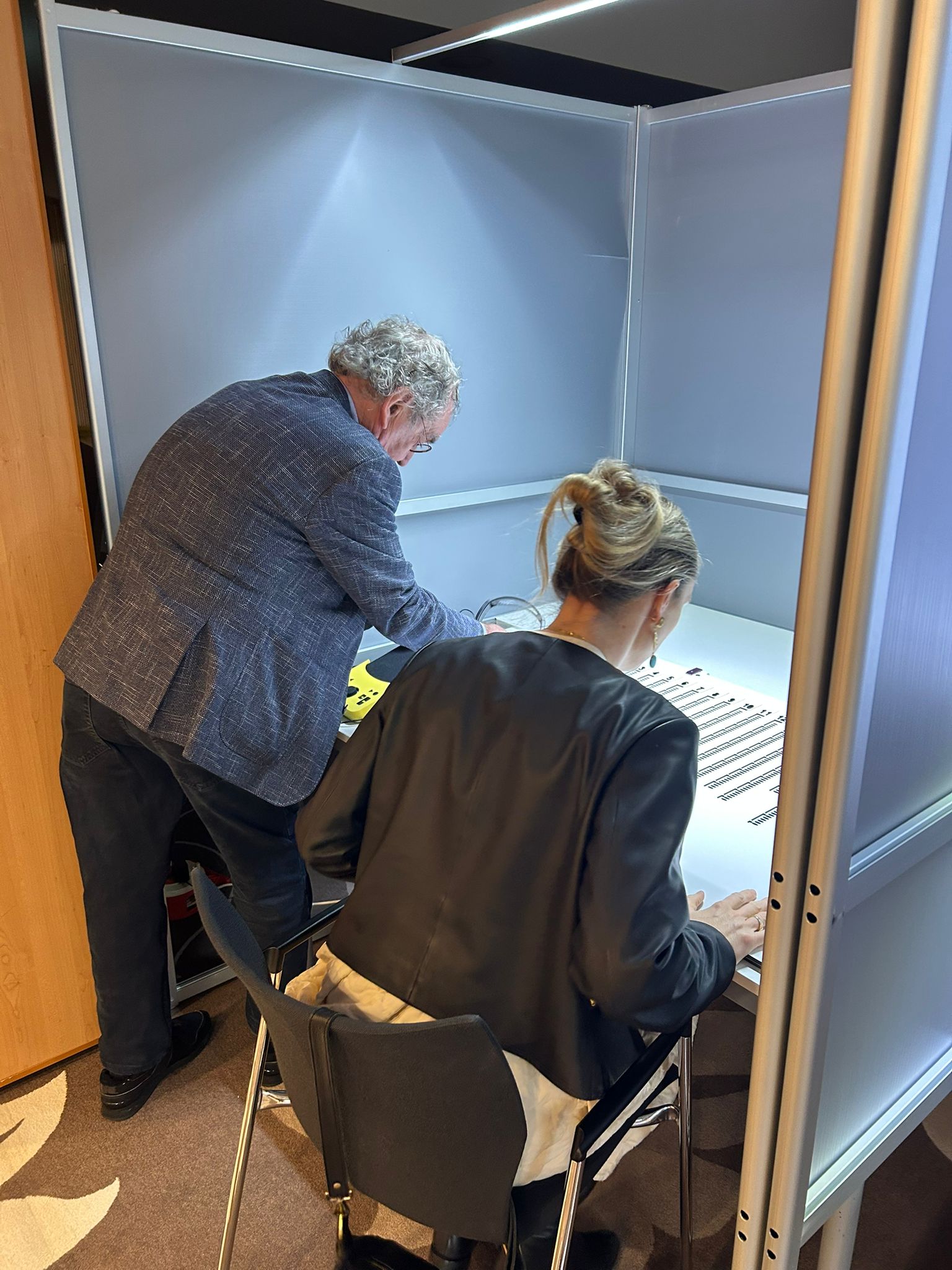 De stembox staat in het gemeentehuis en leest de kandidatenlijst voor, zodat kiezers stap voor stap worden geholpen met het uitbrengen van hun stem. Een stemmal helpt kiezers vervolgens om het juiste vakje rood te maken.