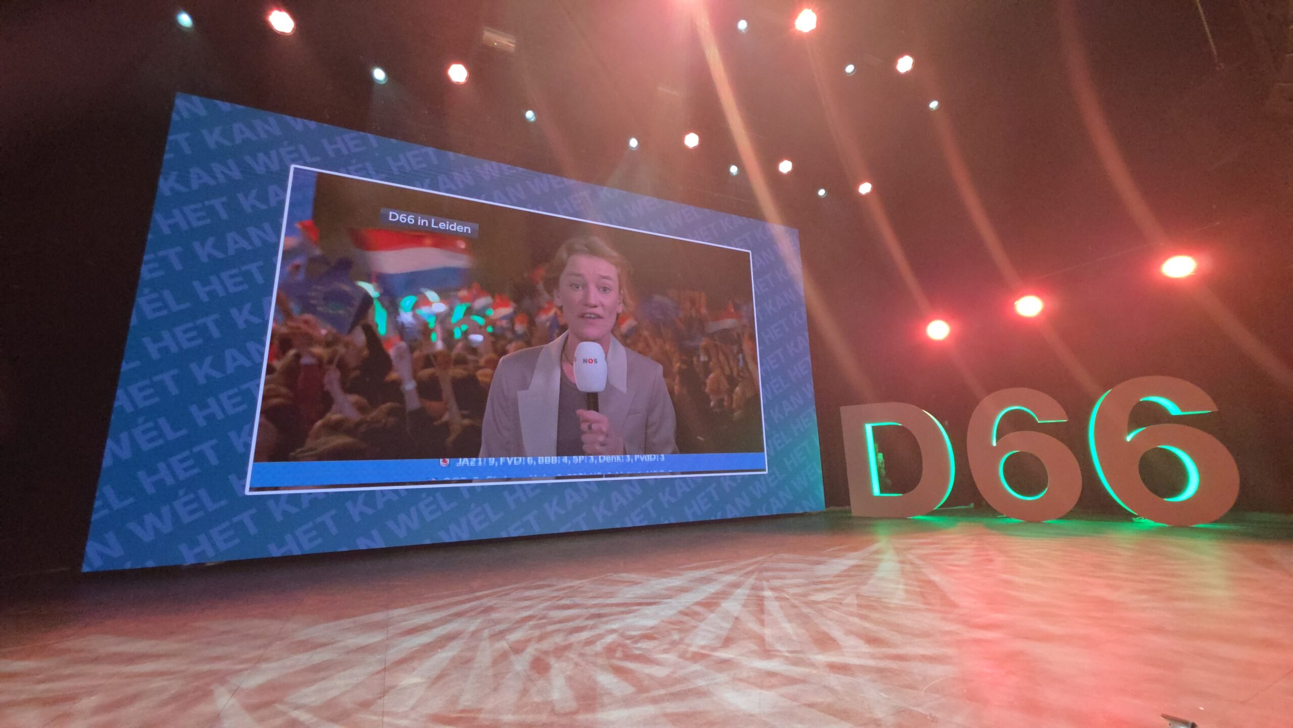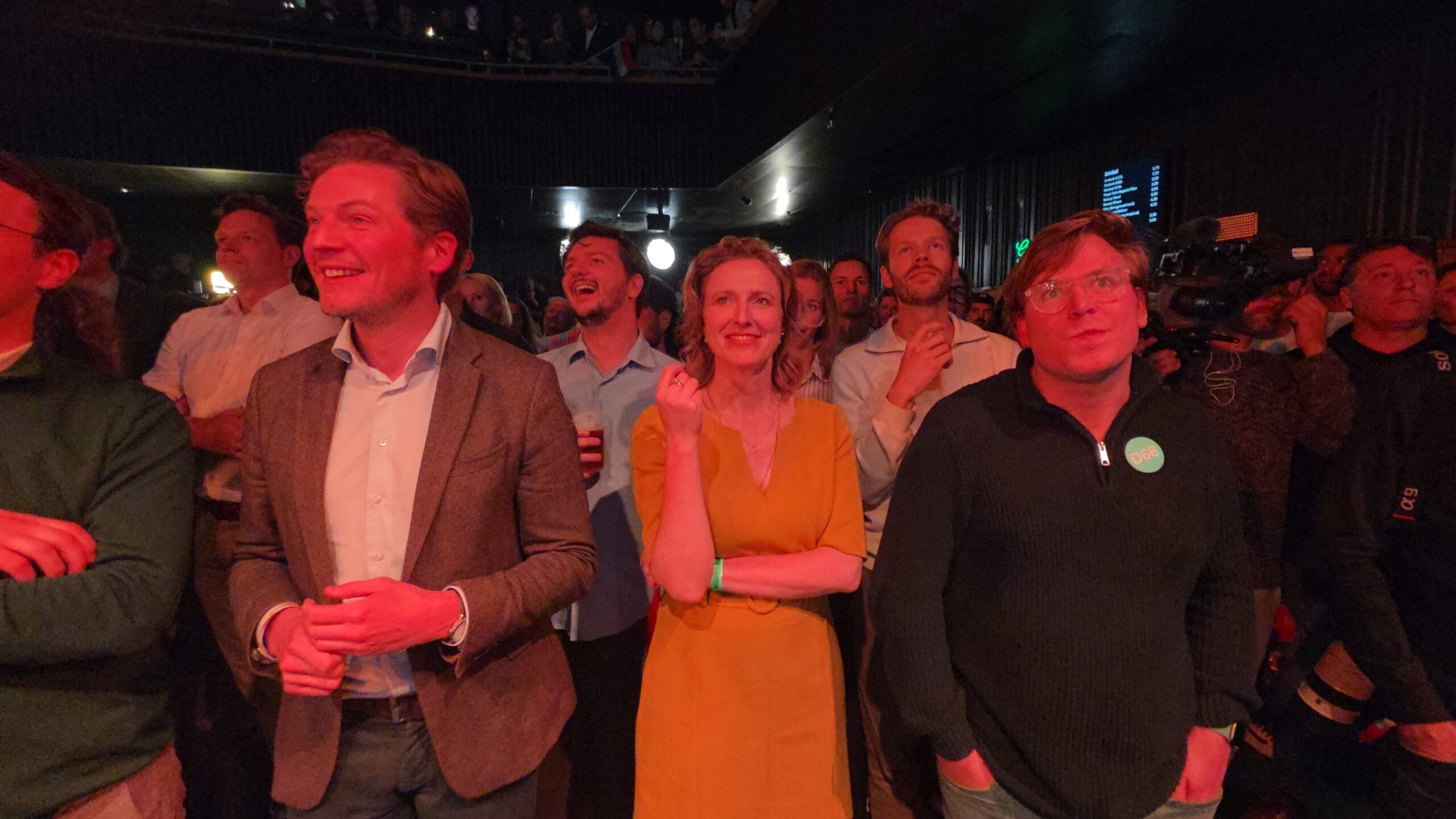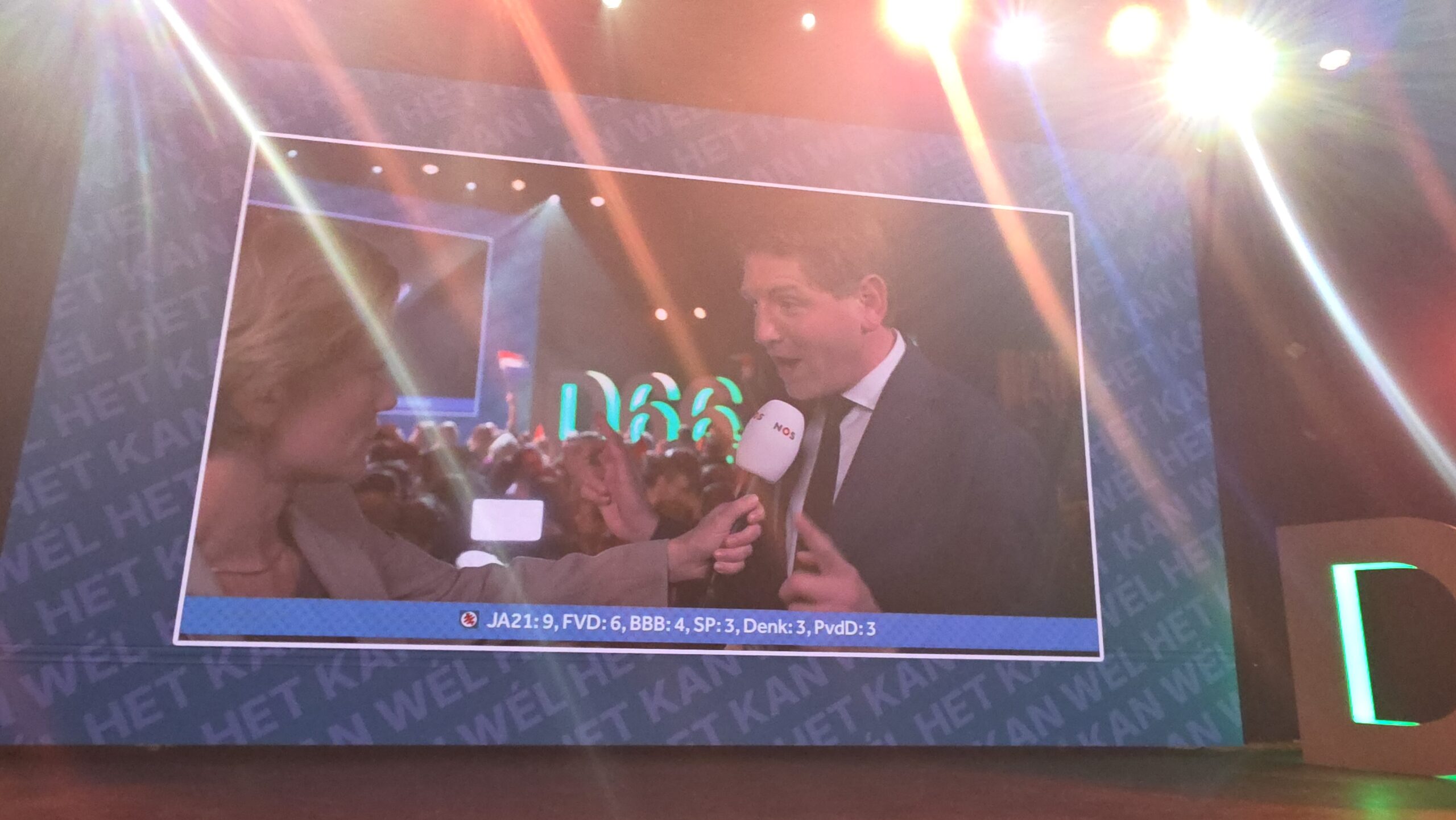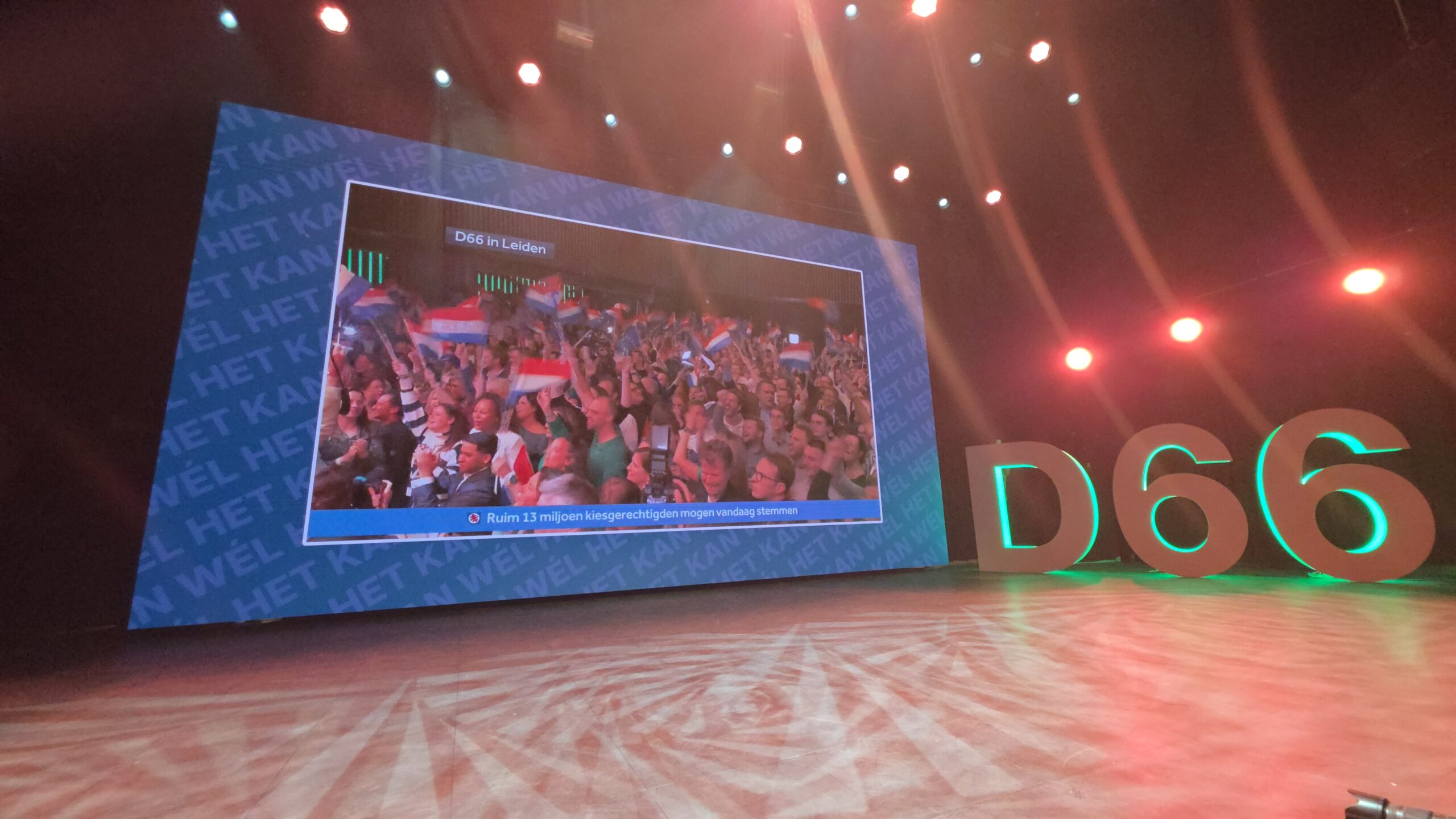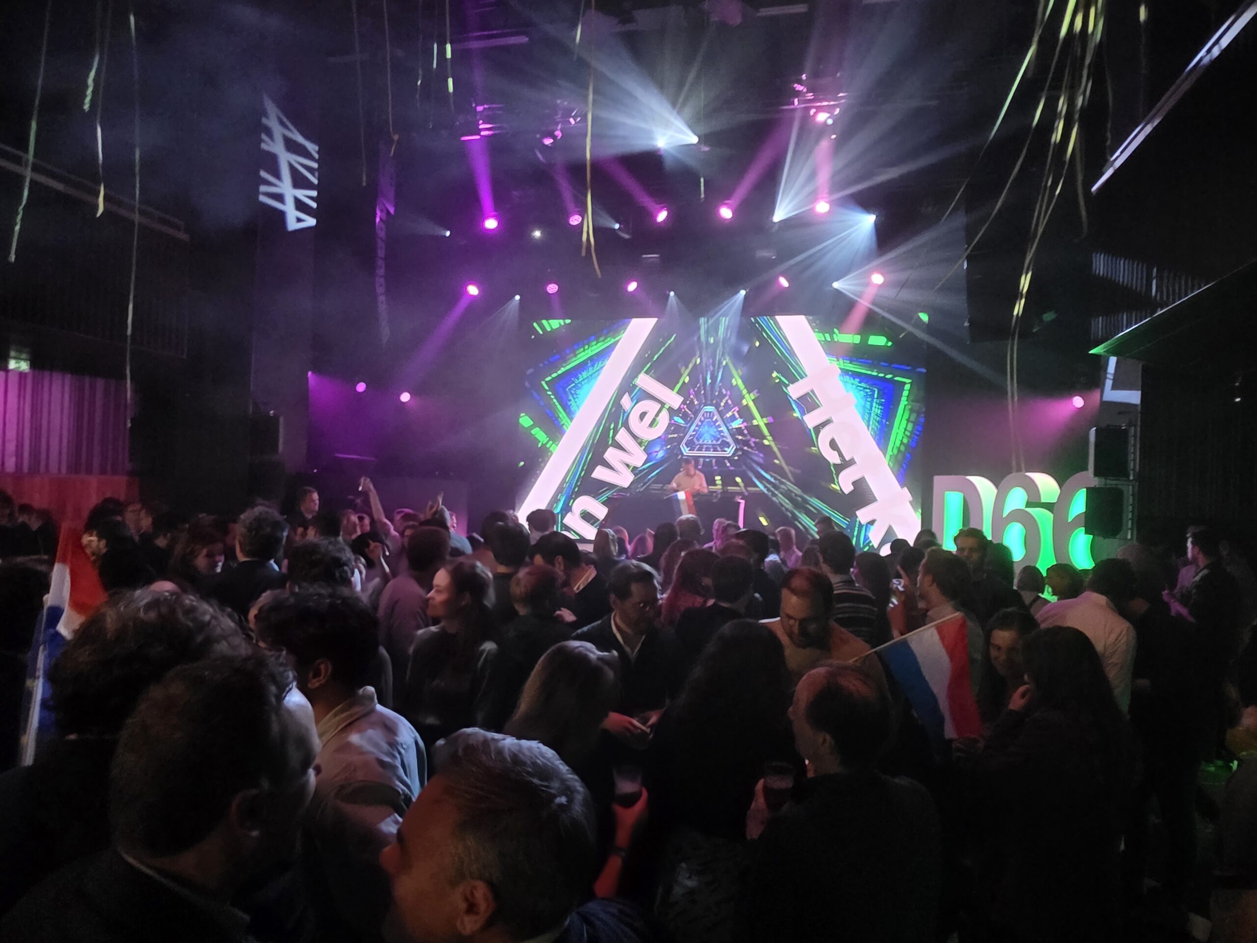 De grote zaal van het Leidse poppodium Nobel liep woensdagavond vanaf 20.00 uur langzaam vol. Een uurtje later was de tent afgeladen en kon er niemand meer bij op het uitslagenfeestje waarvoor D66 de sleutelstad had uitgekozen. Toen rond 20.30 uur de eerste exitpoll op het scherm verscheen en bleek dat D66 voor het eerst in de geschiedenis van de partij de grootste van Nederland was geworden, ging het dak eraf. Het leek er op dat de partij met 27 zetels ook de PVV had verslagen die met 25 zetels uit de eerste exitpoll kwam.