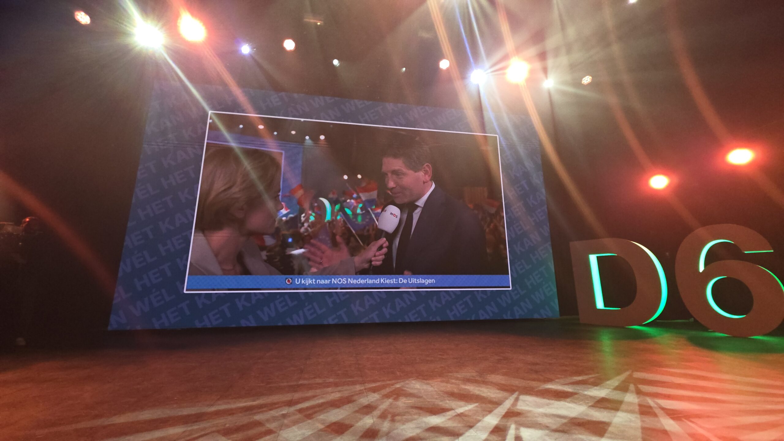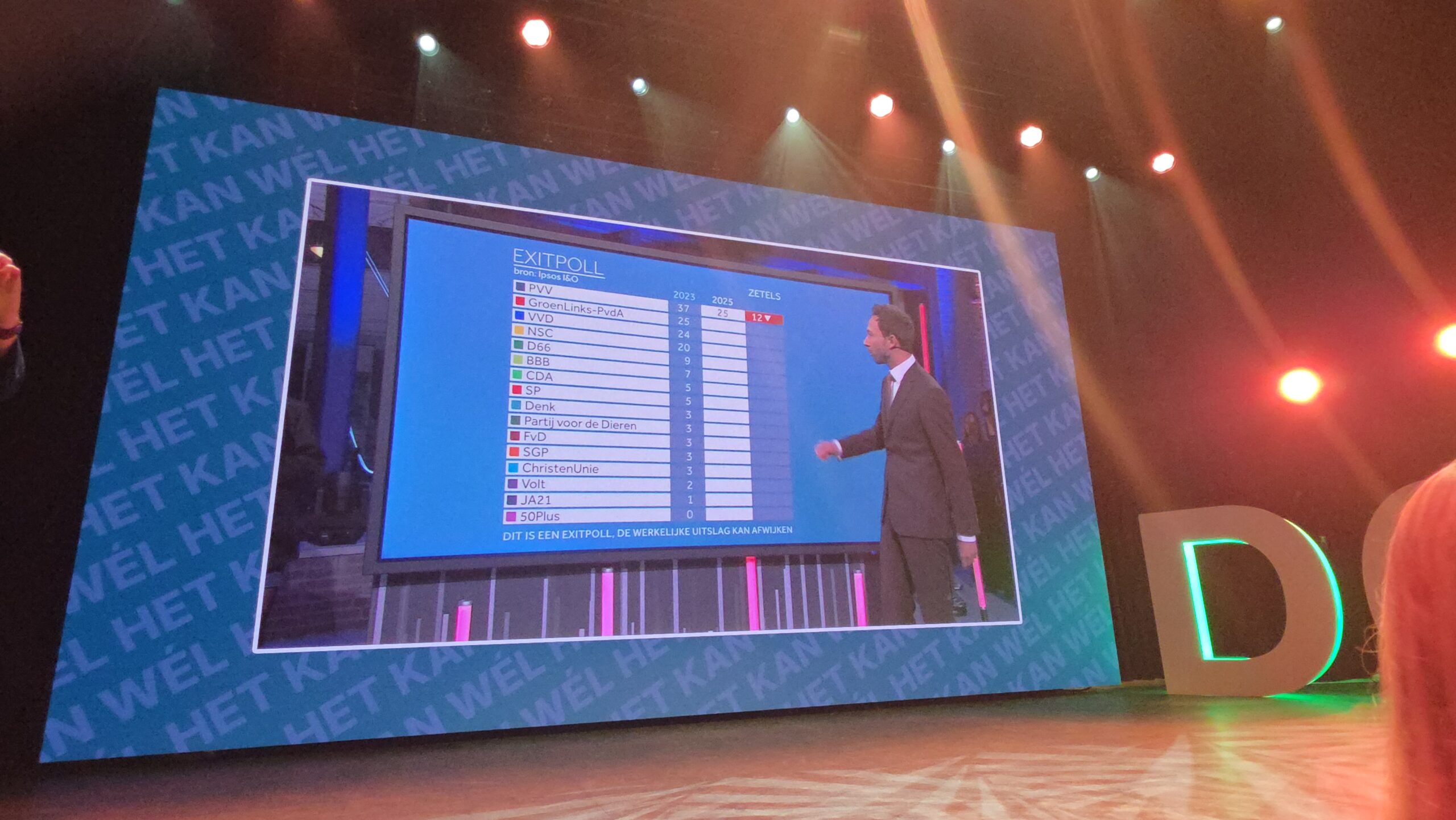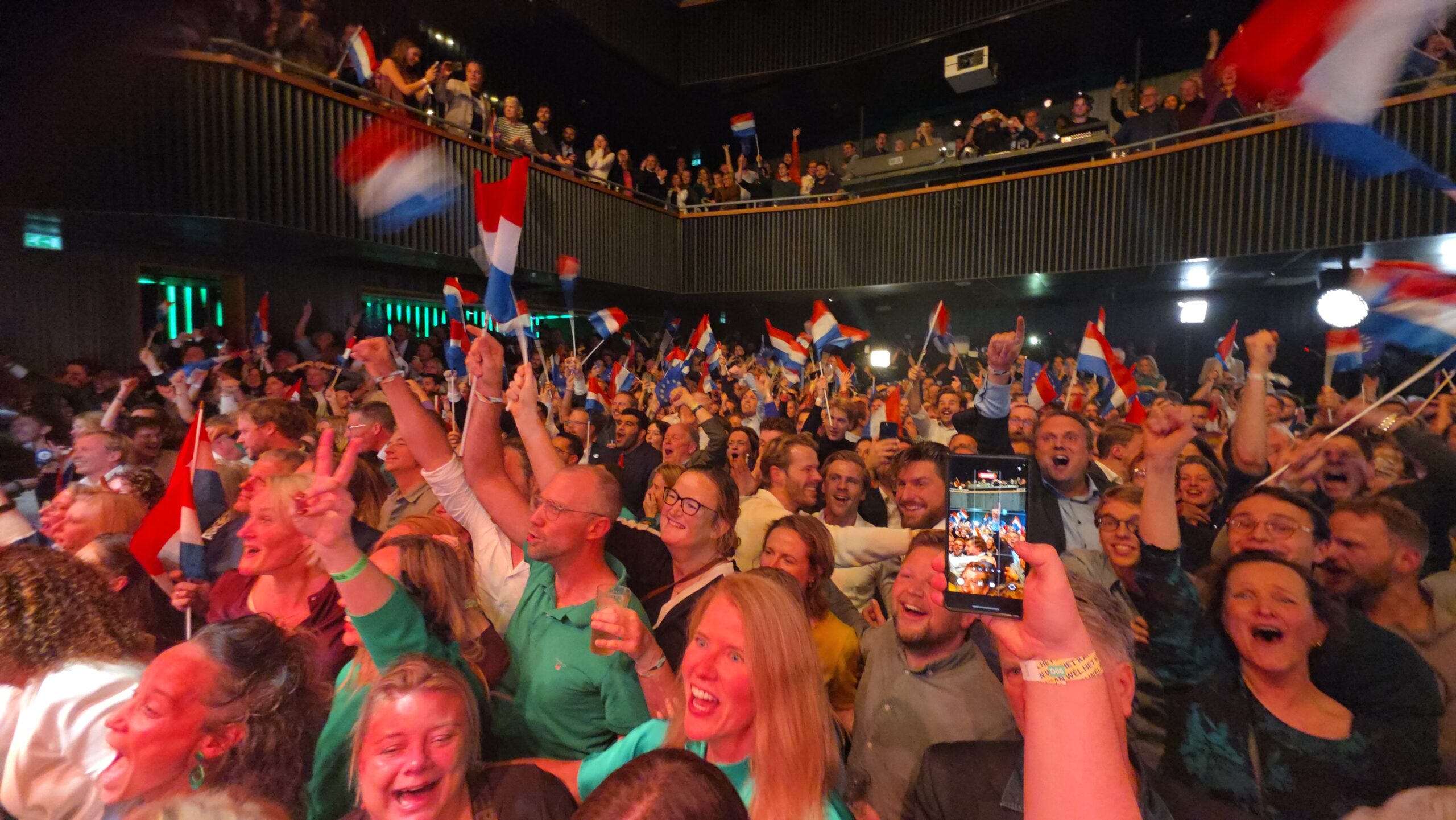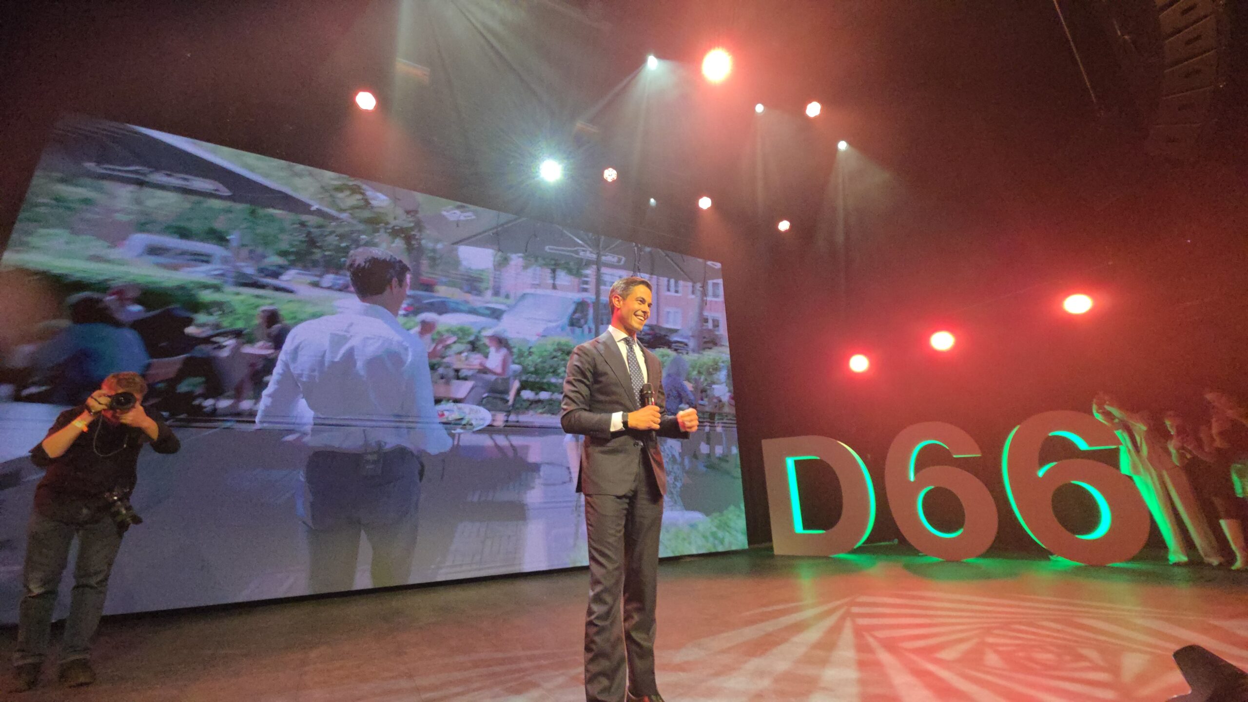 De grote zaal van het Leidse poppodium Nobel liep woensdagavond vanaf 20.00 uur langzaam vol. Een uurtje later was de tent afgeladen en kon er niemand meer bij op het uitslagenfeestje waarvoor D66 de sleutelstad had uitgekozen. Toen rond 20.30 uur de eerste exitpoll op het scherm verscheen en bleek dat D66 voor het eerst in de geschiedenis van de partij de grootste van Nederland was geworden, ging het dak eraf. Het leek er op dat de partij met 27 zetels ook de PVV had verslagen die met 25 zetels uit de eerste exitpoll kwam.