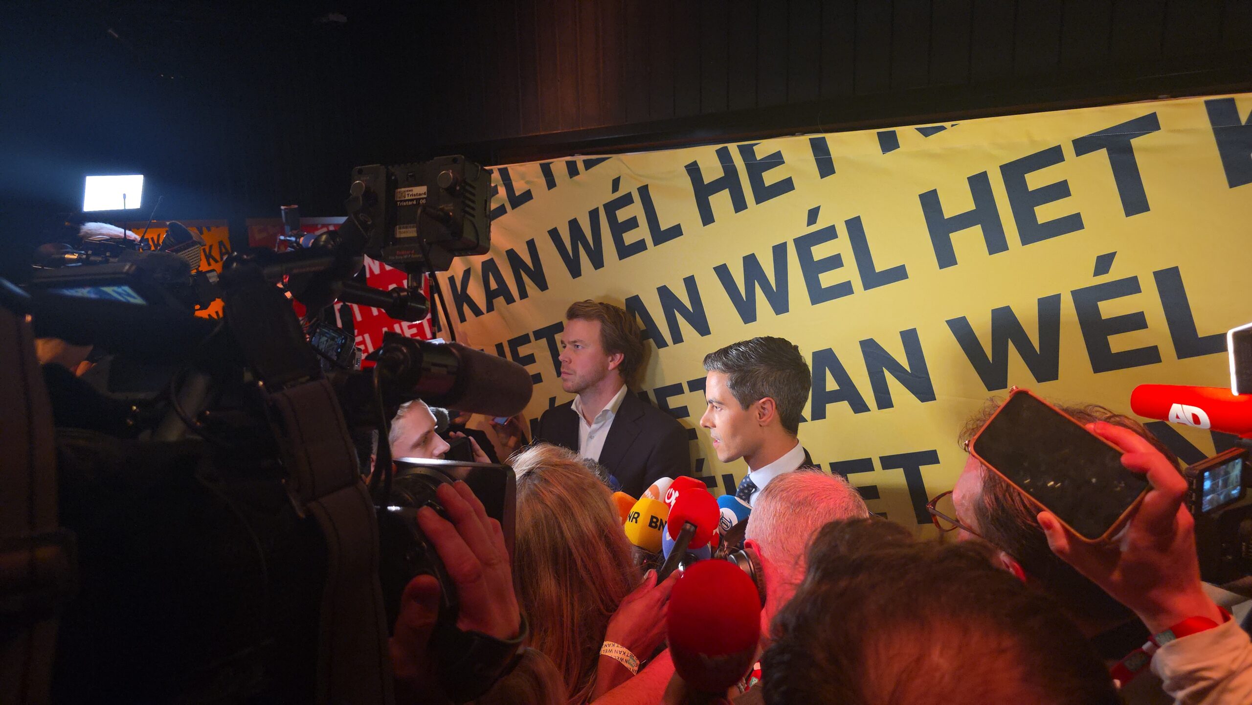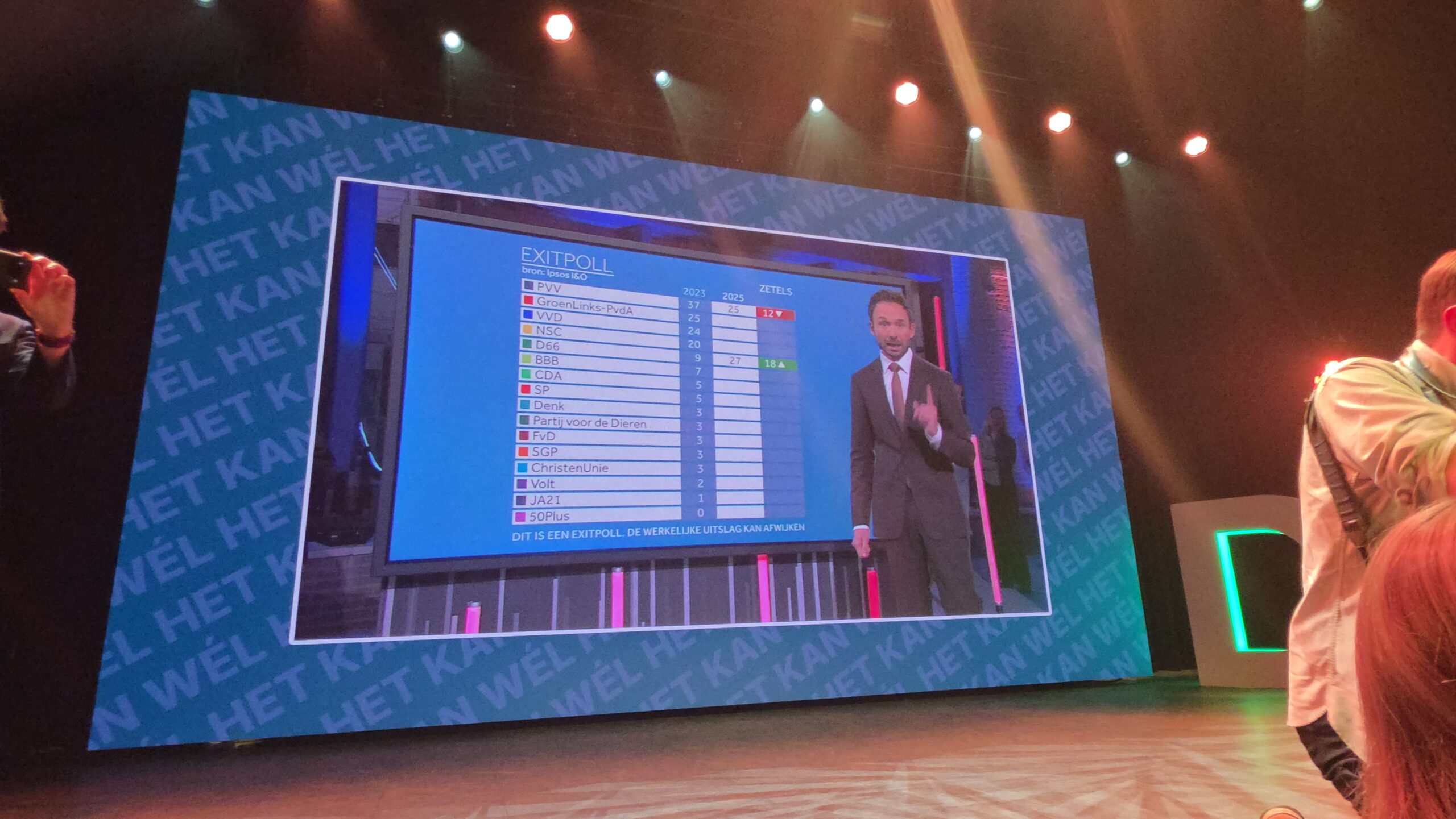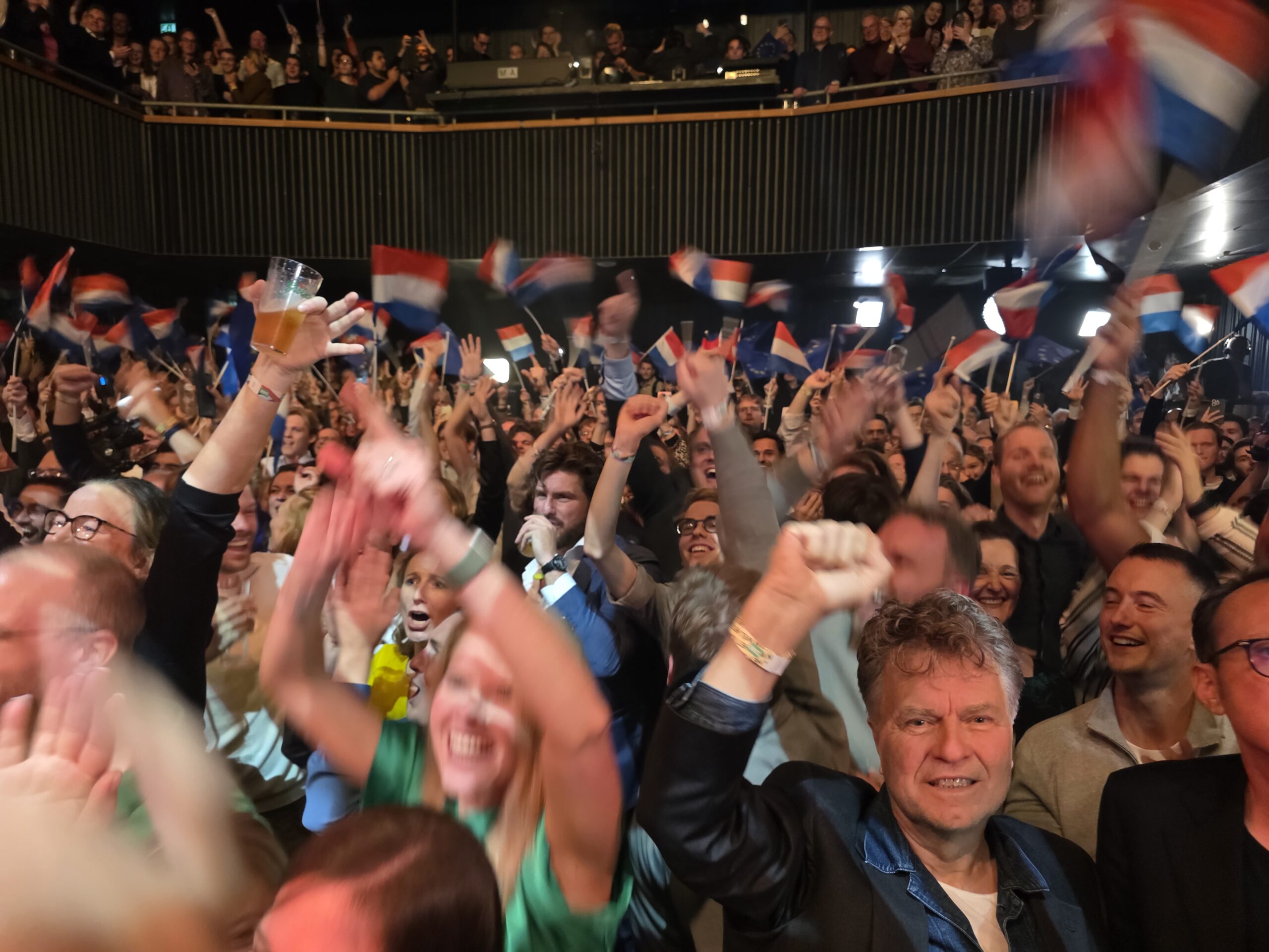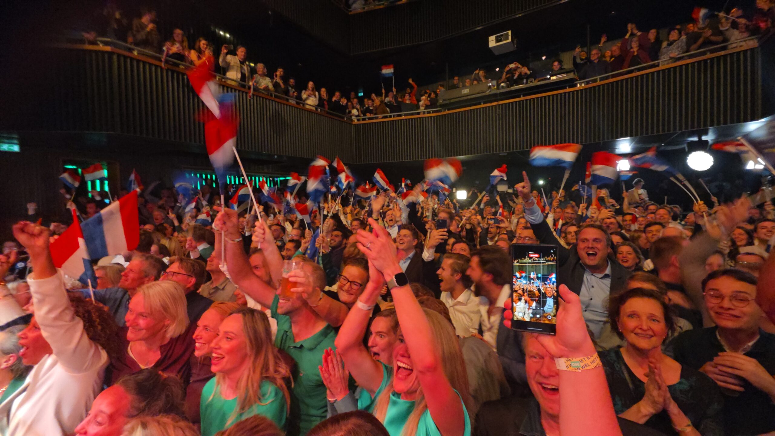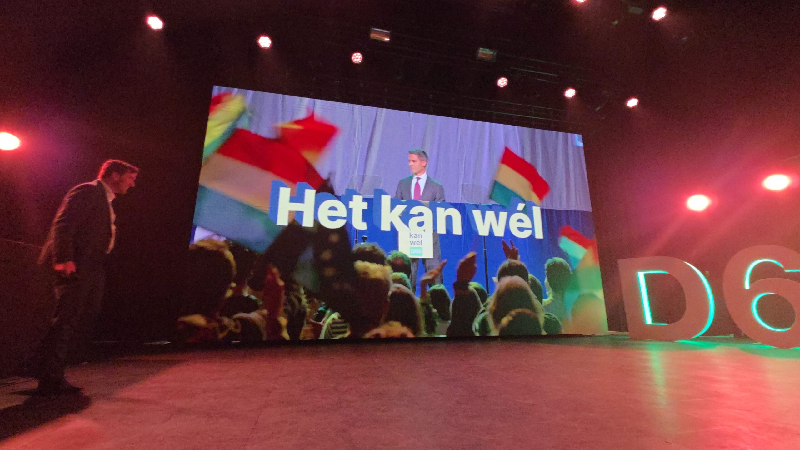De grote zaal van het Leidse poppodium Nobel liep woensdagavond vanaf 20.00 uur langzaam vol. Een uurtje later was de tent afgeladen en kon er niemand meer bij op het uitslagenfeestje waarvoor D66 de sleutelstad had uitgekozen. Toen rond 20.30 uur de eerste exitpoll op het scherm verscheen en bleek dat D66 voor het eerst in de geschiedenis van de partij de grootste van Nederland was geworden, ging het dak eraf. Het leek er op dat de partij met 27 zetels ook de PVV had verslagen die met 25 zetels uit de eerste exitpoll kwam.