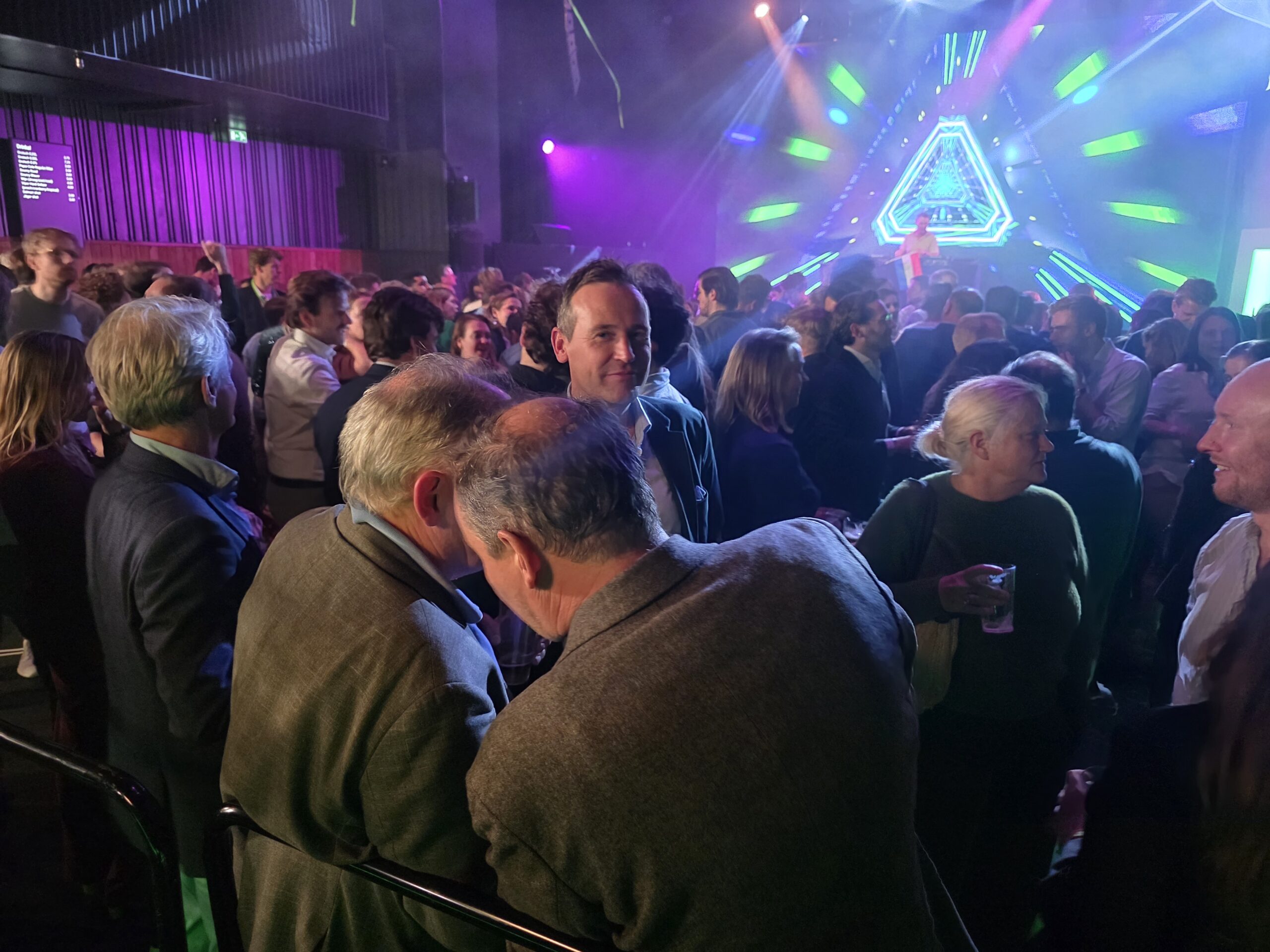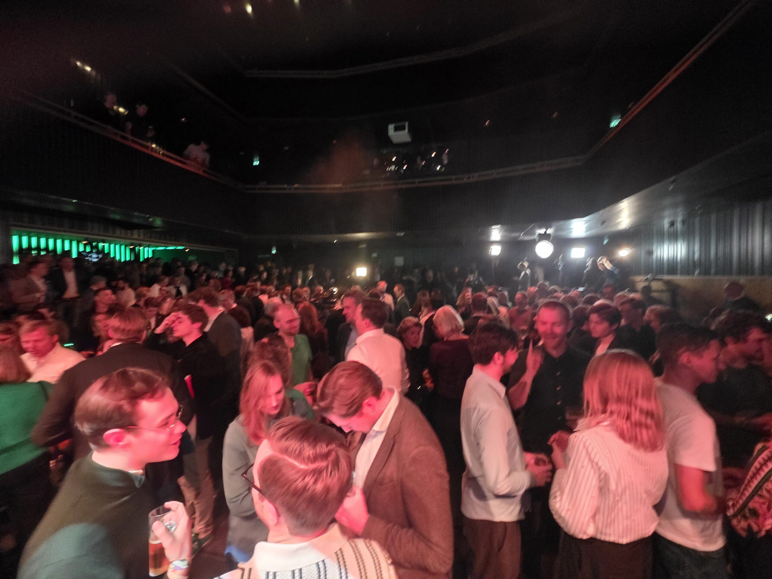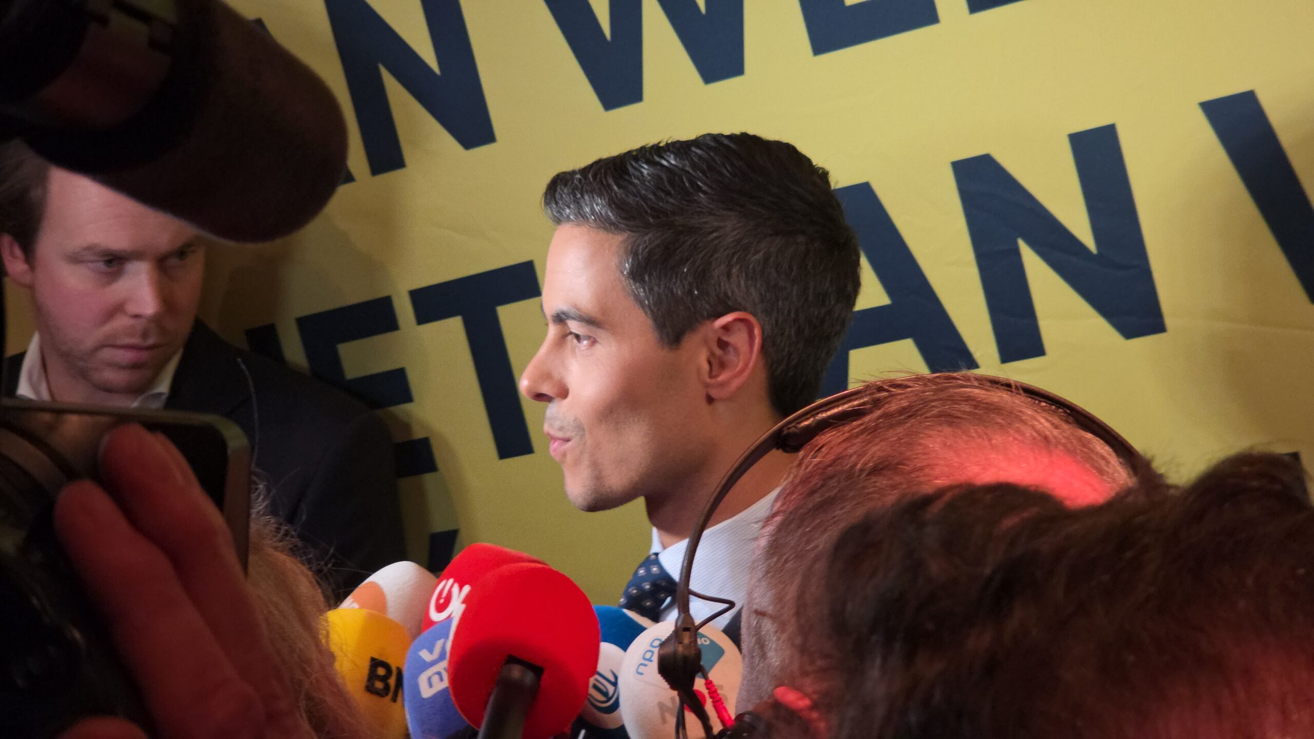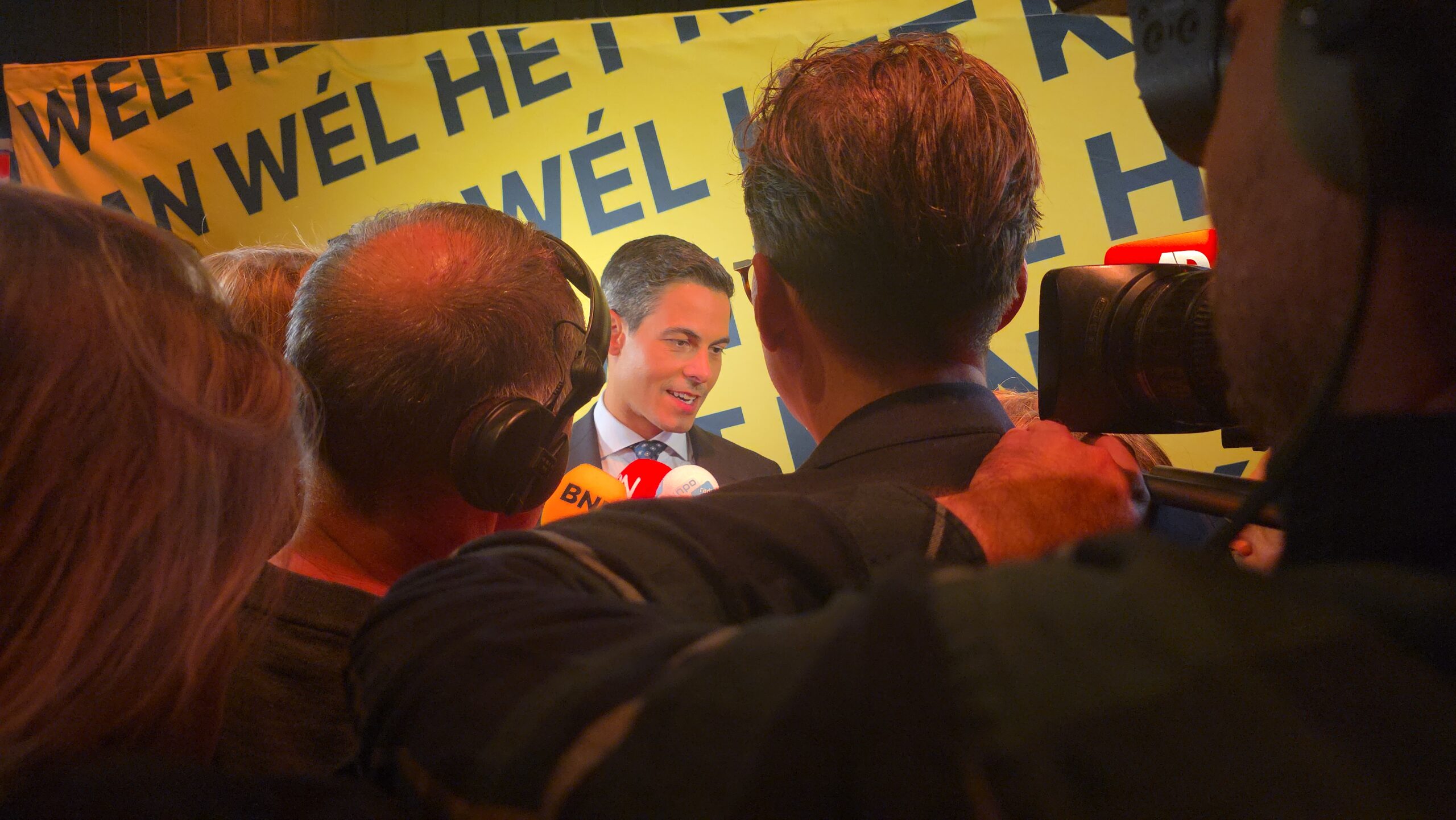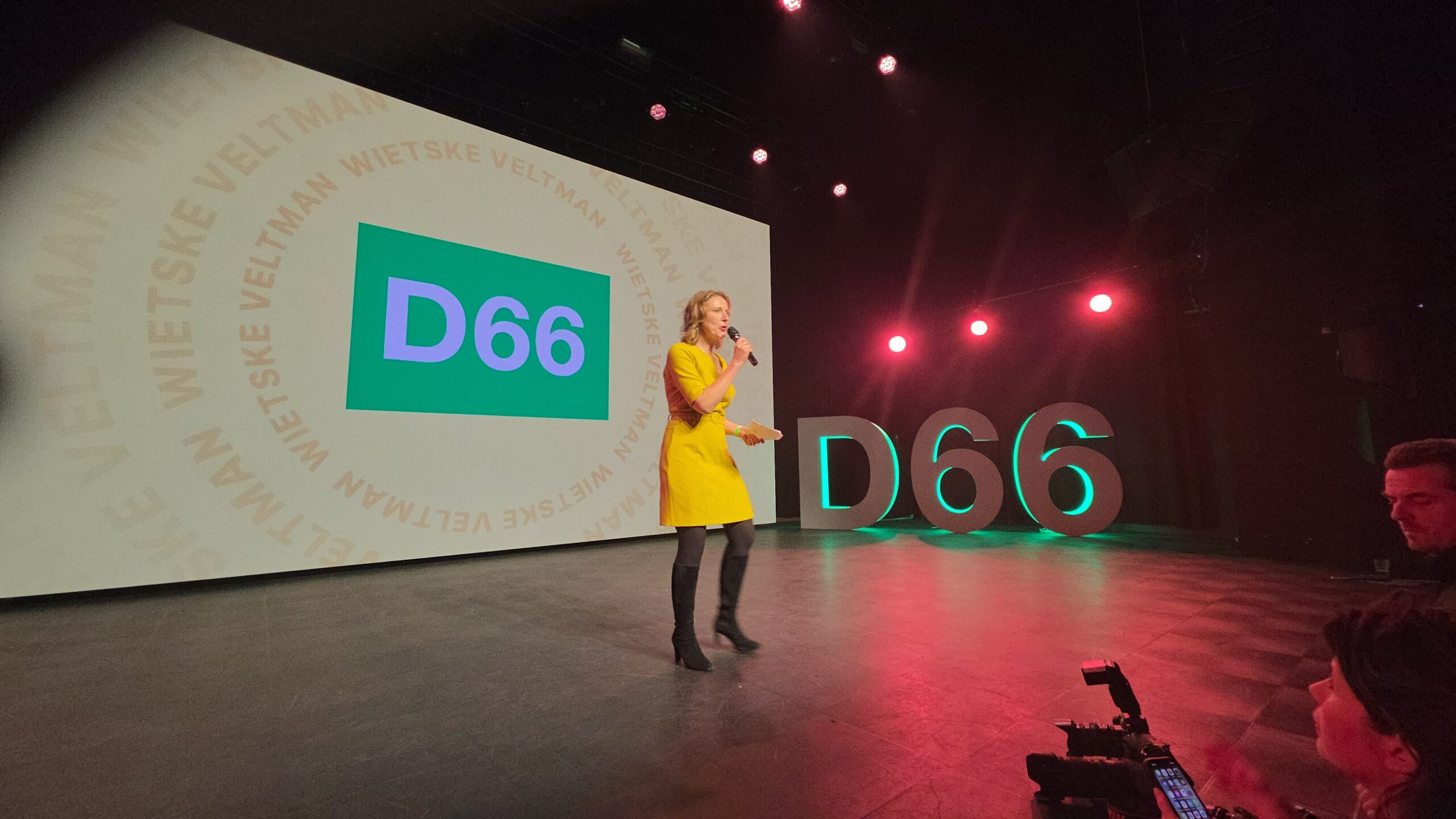De grote zaal van het Leidse poppodium Nobel liep woensdagavond vanaf 20.00 uur langzaam vol. Een uurtje later was de tent afgeladen en kon er niemand meer bij op het uitslagenfeestje waarvoor D66 de sleutelstad had uitgekozen. Toen rond 20.30 uur de eerste exitpoll op het scherm verscheen en bleek dat D66 voor het eerst in de geschiedenis van de partij de grootste van Nederland was geworden, ging het dak eraf. Het leek er op dat de partij met 27 zetels ook de PVV had verslagen die met 25 zetels uit de eerste exitpoll kwam.