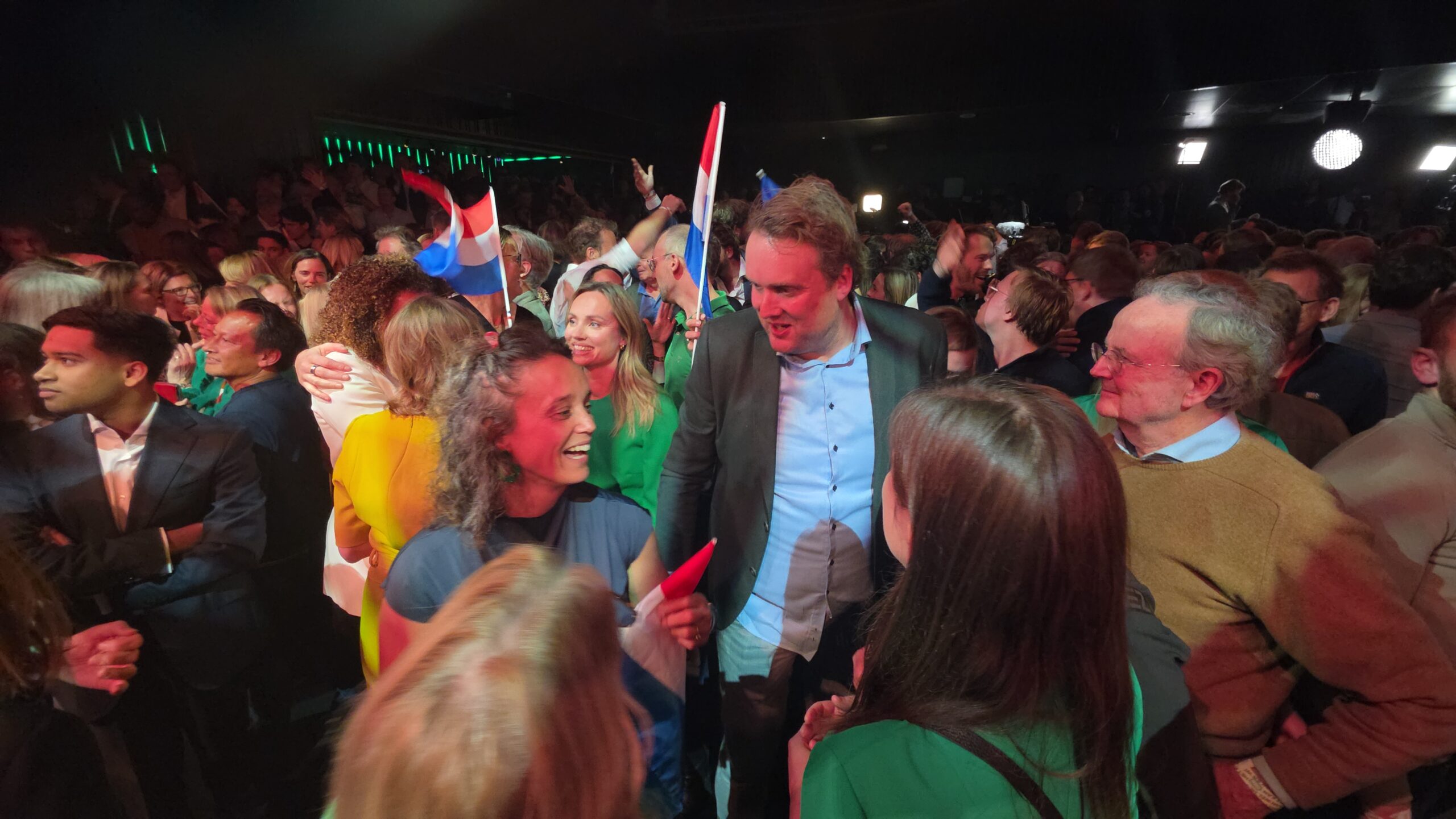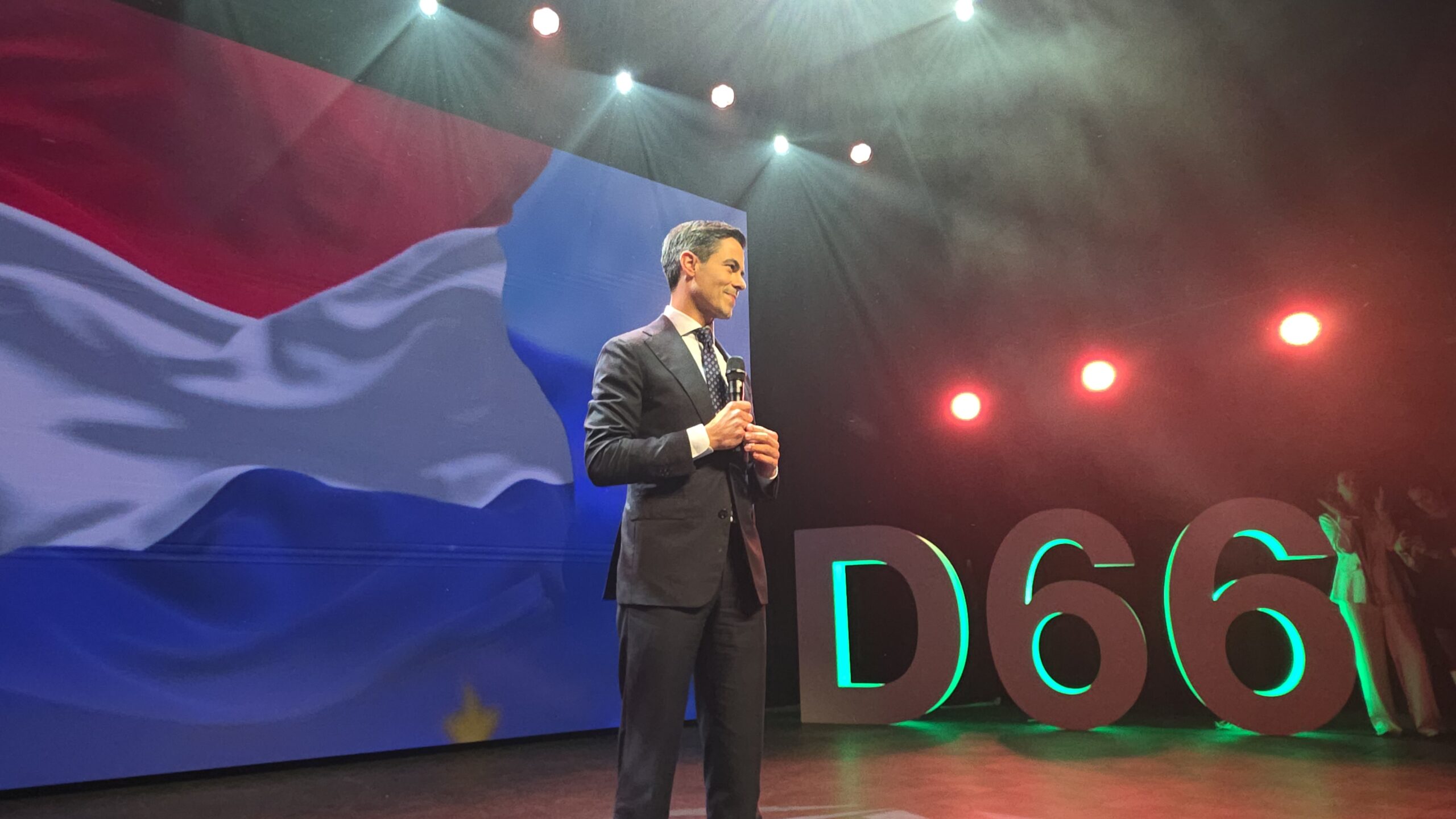 Twintig minuten later betrad partijleider Rob Jetten het podium. Onder een luid ‘Het kan wel, het kan wel’ bedankte hij eerst de vrijwilligers van zijn partij en verloofde Nicolás Keenan. “Die heeft mij de afgelopen weken moeten doorstaan. Lieve schat, ik weet niet waar je bent, maar dank je wel.” Ook voor Frans Timmermans waren er mooie woorden. De partijleider van PvdA-GroenLinks had toen net bekend gemaakt dat hij terugtrad na het tegenvallende resultaat, waarbij de fusiepartij vijf zetels moest inleveren.