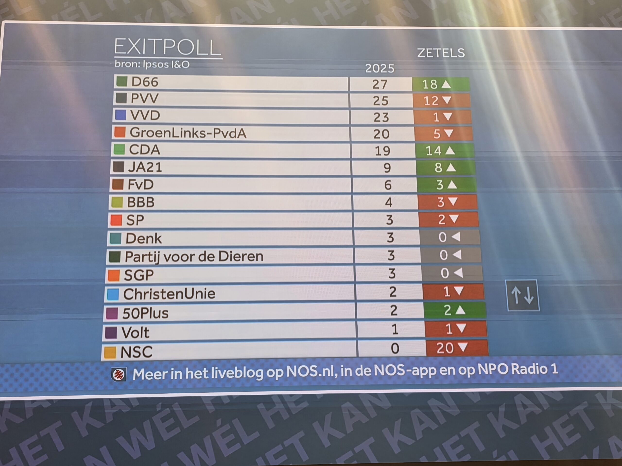 Naarmate de avond vorderde leek het steeds zekerder dat D66 met 27 zetels inderdaad de grootste zou worden. Donderdagmorgen bleek dat er toch nog de nodige verschuivingen zijn opgetreden ten opzichte van de exitpolls. D66 en de PVV staan inmiddels allebei op 26 zetels.