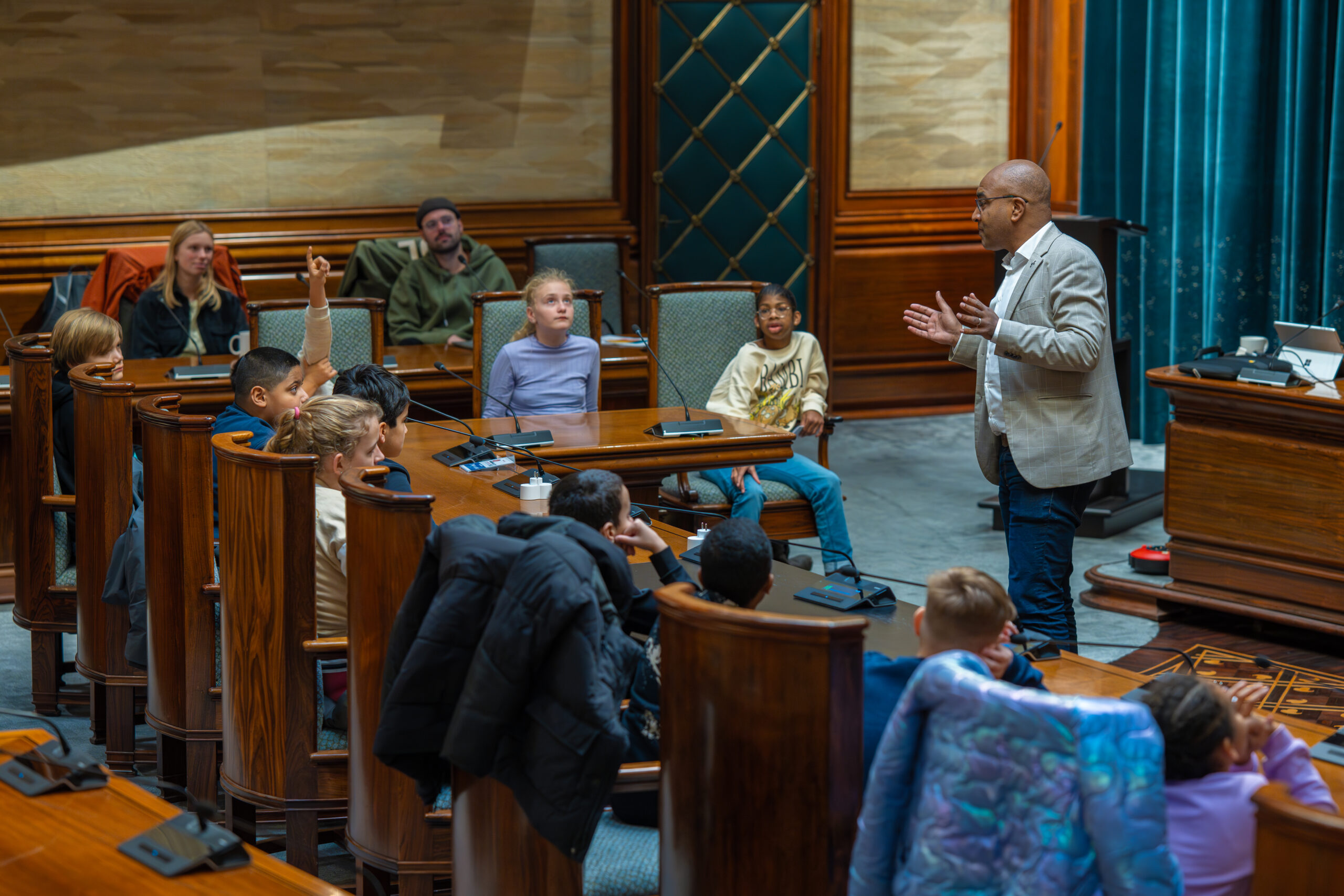 Wethouder Abdelhaq Jermoumi van Kansengelijkheid, Jeugd en Onderwijs noemt het geweldig om de kinderen welkom te heten in de raadszaal van het Stadhuis. Ik vind het mooi dat de Korte Vlietschool is ingeloot voor de kinderraad. Zo geven we ook kinderen uit het speciaal onderwijs een plek aan de tafel van besluitvorming.”
