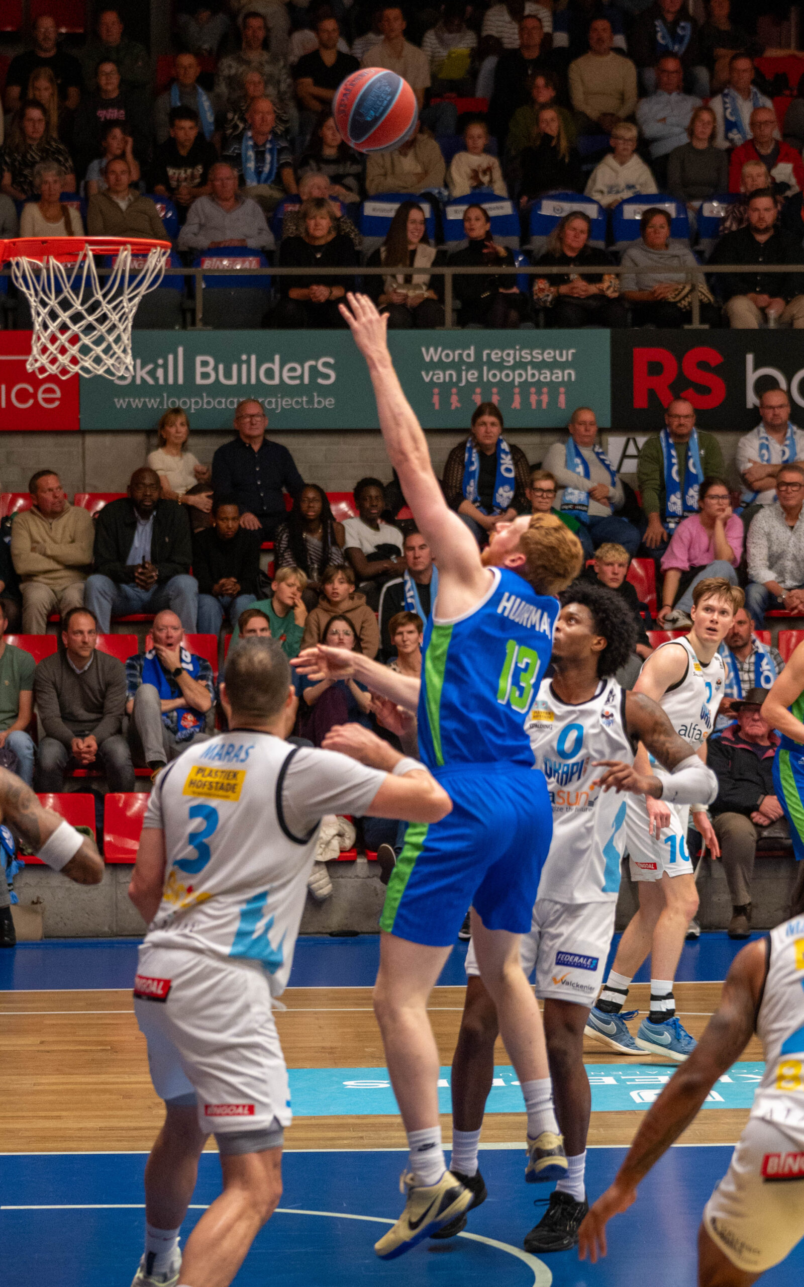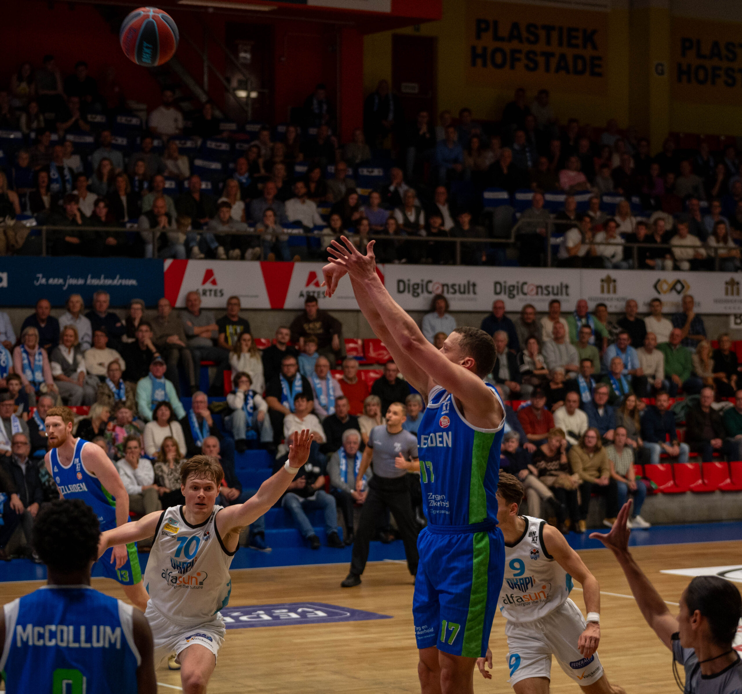Dat is iets wat Okapi Aalst zeker niet deed. Het gameplan van de thuisploeg werkte uitstekend. Al kende ZZ Leiden via drie driepunters van Lucas Kruithof in de eerste vijf minuten nog wel een sterke start. Okapi Aalst knalde er echter ook vier drietjes in en liep uit naar 21-15. Via driepunters van Jibbe Sicking en Stan van den Elzen stond na tien minuten spelen nog wel 23-23.