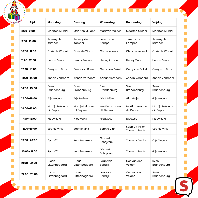 In Leiden kan iedereen van maandag tot en met vrijdag cadeautjes komen brengen tussen 8.00 uur en 23.00 uur. Gedurende die uren loopt ook onze speciale Sintvoorieder1-programmering op www.sleutelstad.tv en de verschillende radiokanalen. Bij de twee bibliotheken kan dat tussen 10.00 en 16.00 uur.