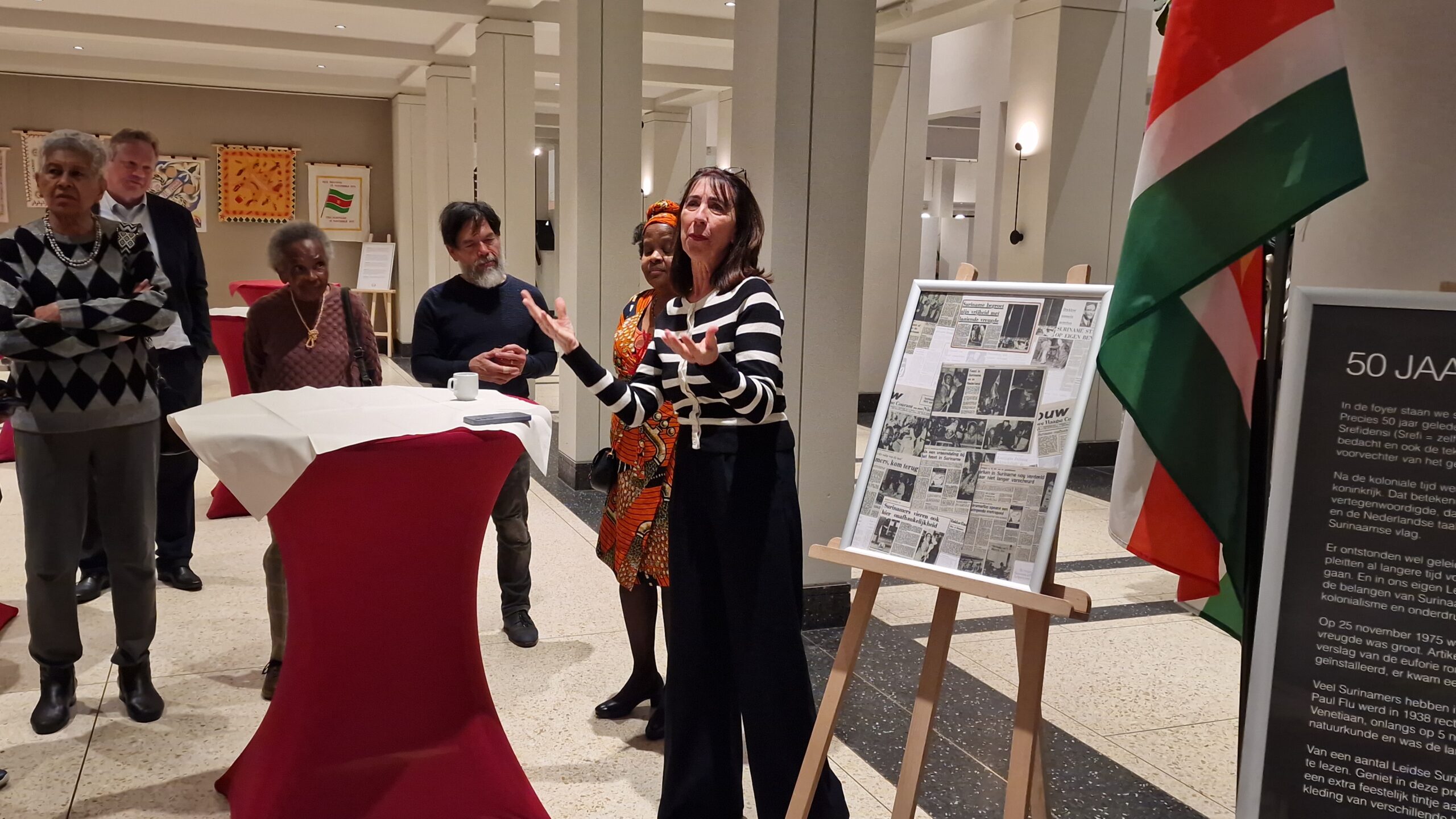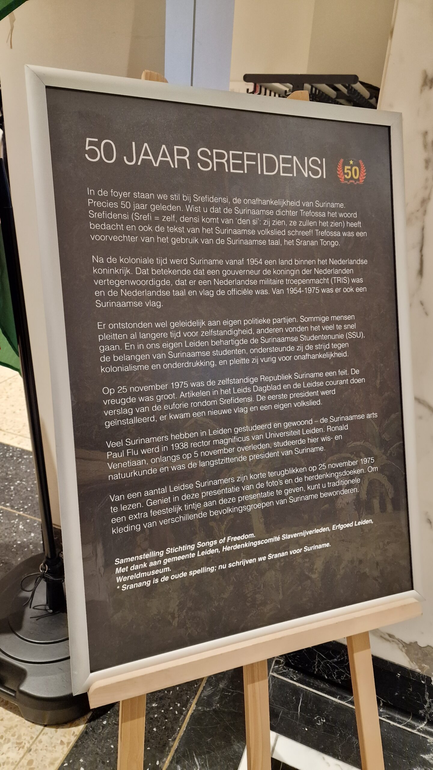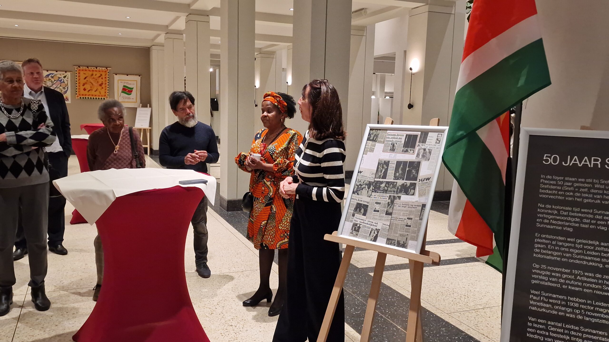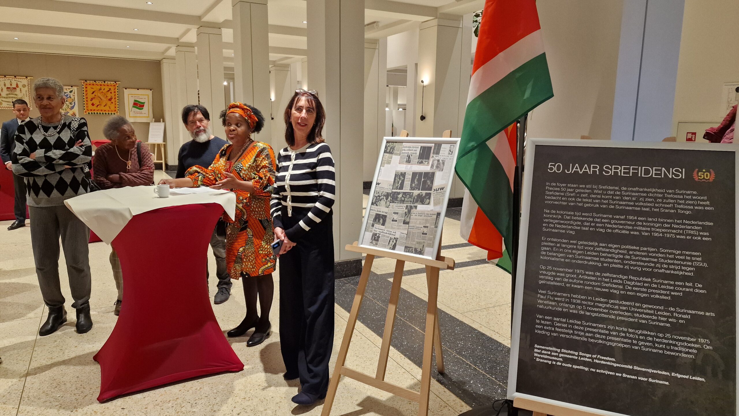 In de foyer van het stadhuis van Leiden is donderdag een kleine tentoonstelling geopend over de onafhankelijkheid van Suriname, volgende week precies vijftig jaar geleden. Ter ere van Srefidensi stelde de Leidse stichting Songs of Freedom de tentoonstelling samen.