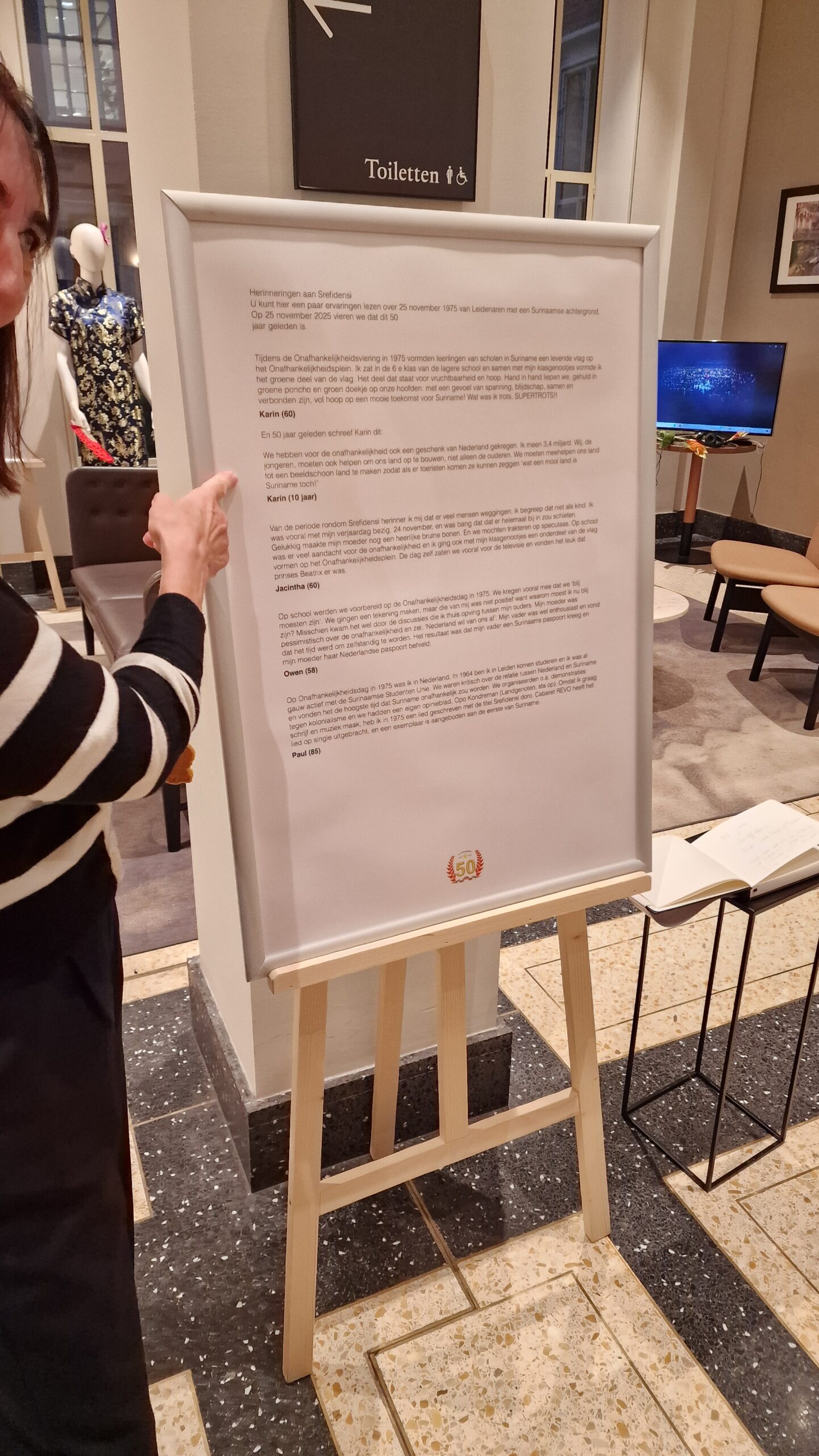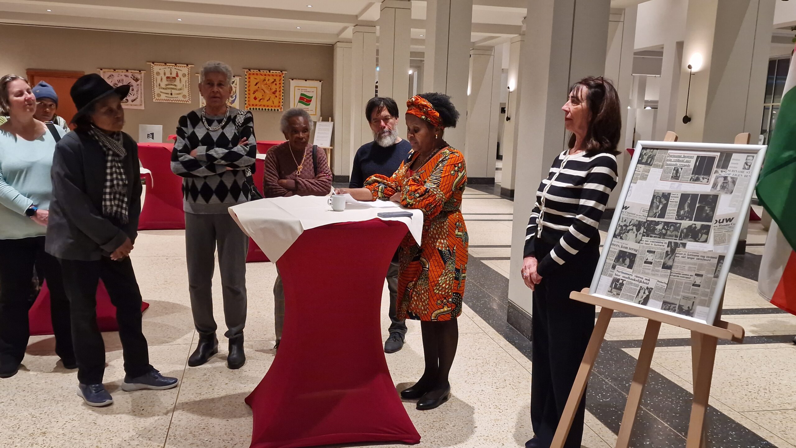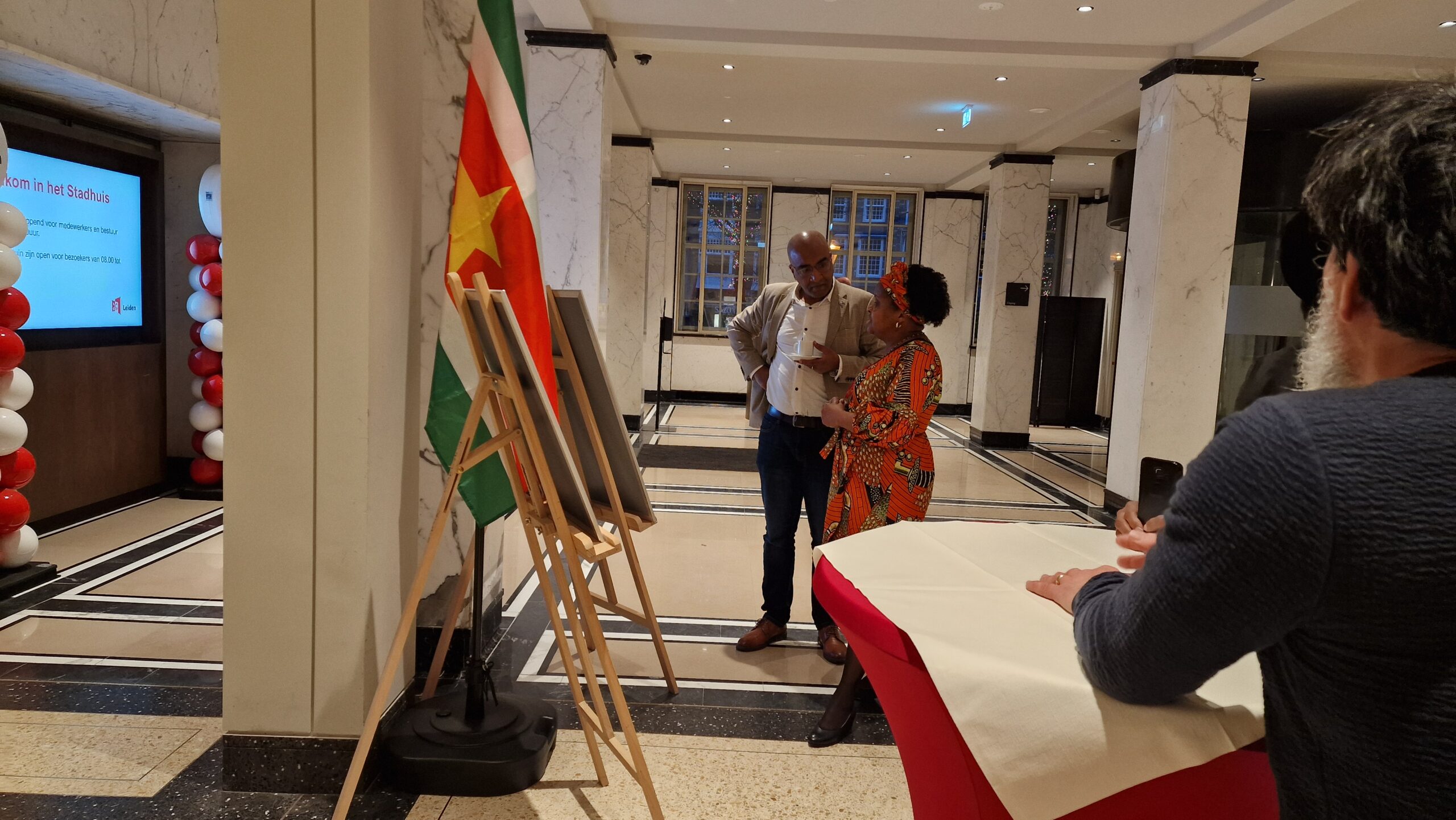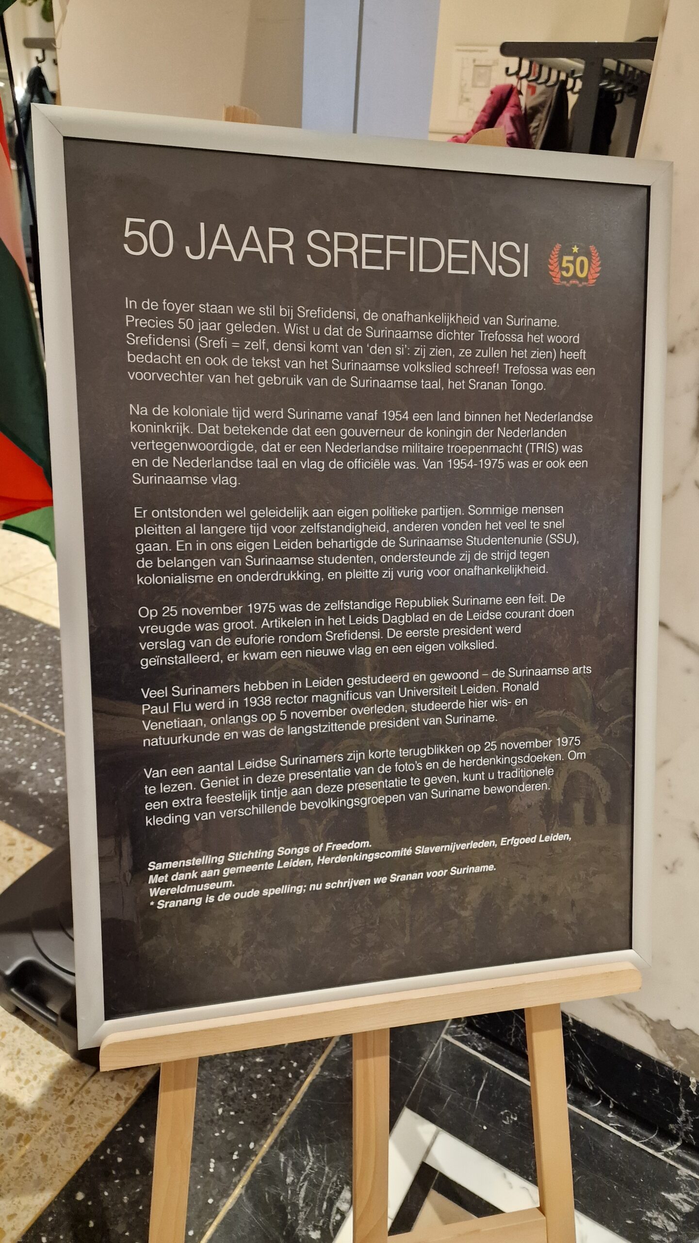 In de foyer van het stadhuis van Leiden is donderdag een kleine tentoonstelling geopend over de onafhankelijkheid van Suriname, volgende week precies vijftig jaar geleden. Ter ere van Srefidensi stelde de Leidse stichting Songs of Freedom de tentoonstelling samen.