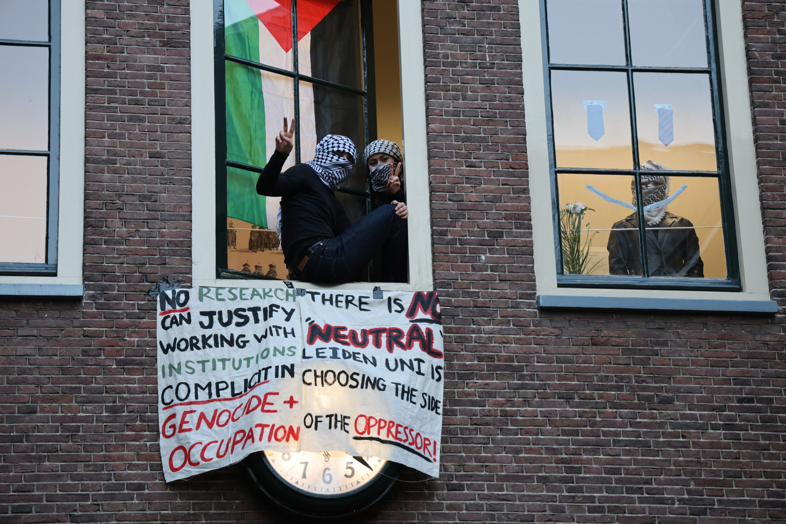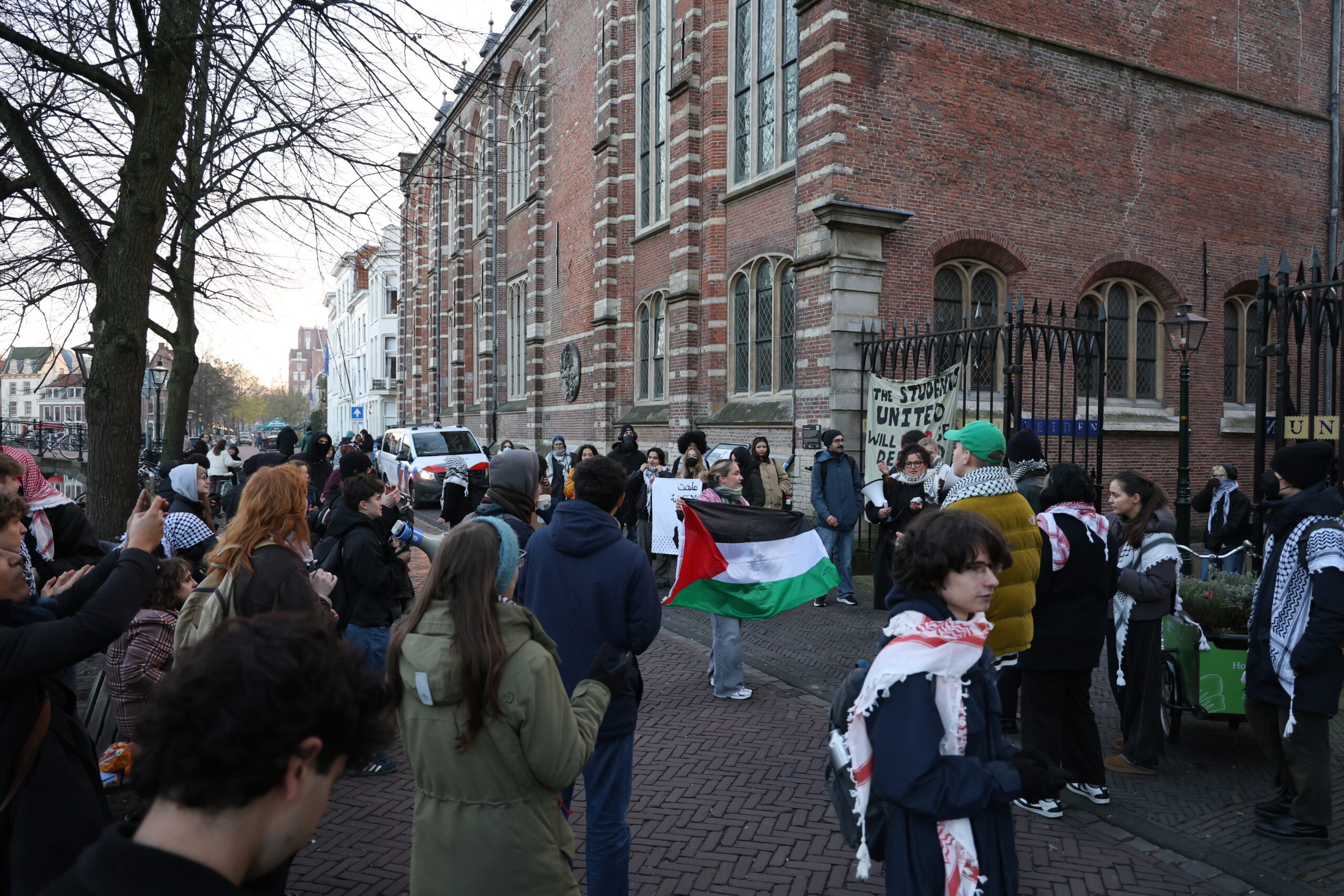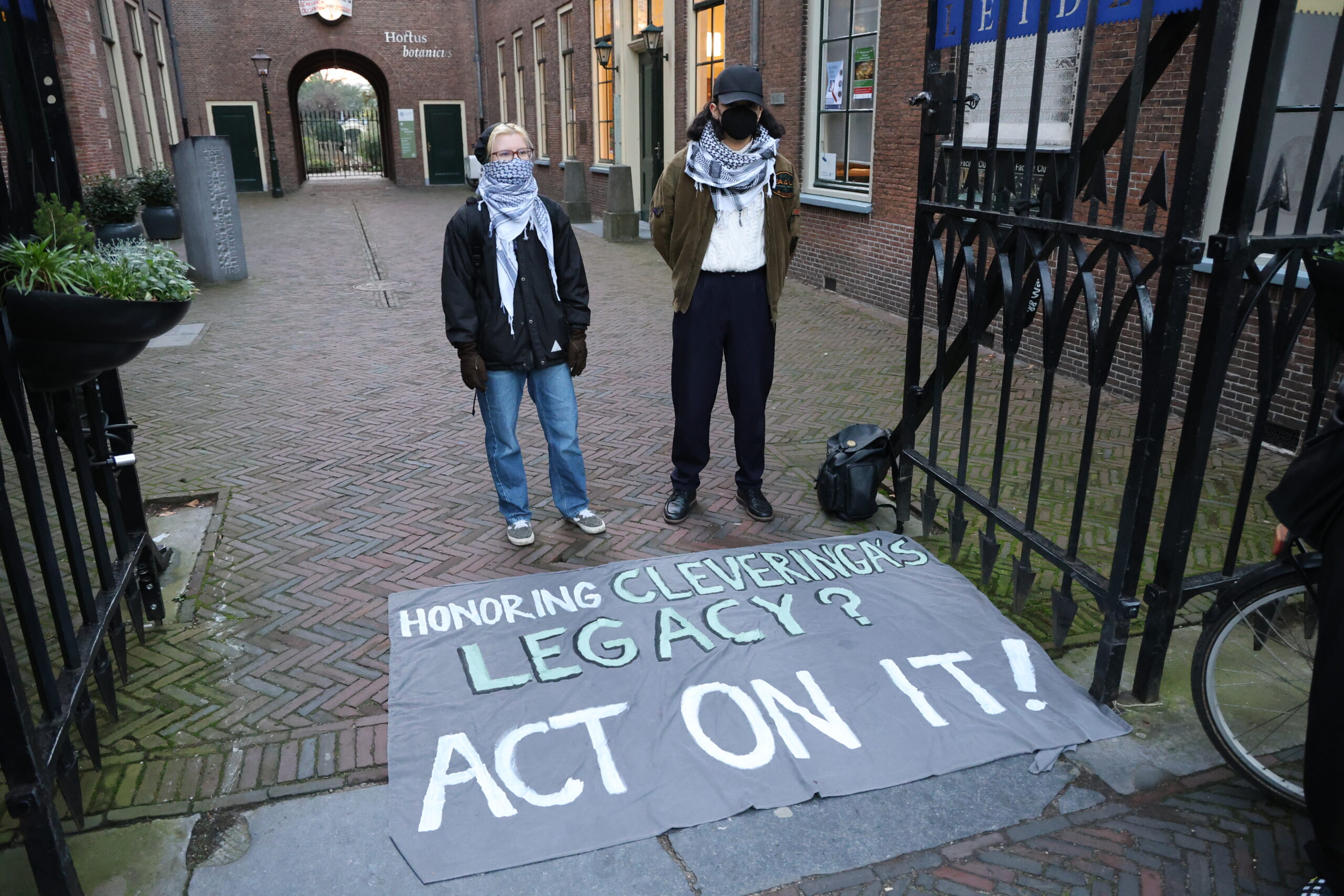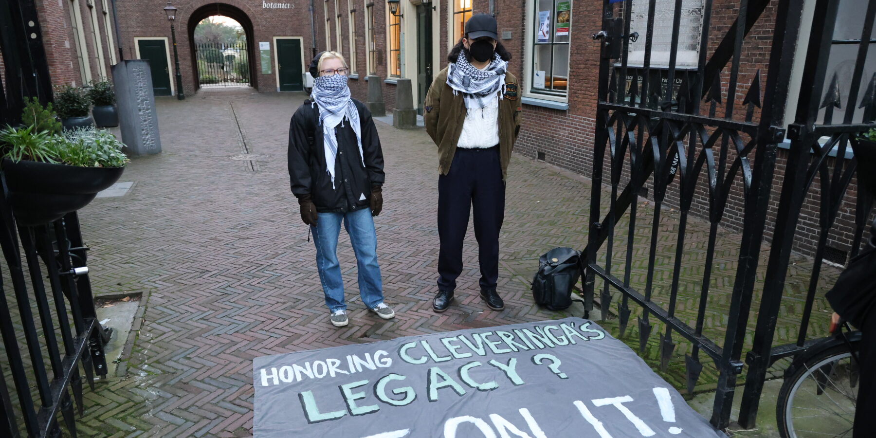 Enkele tientallen studenten demonstreerden woensdagmiddag in en om het academiegebouw van de Universiteit Leiden. Daar zou de jaarlijkse Cleveringa-lezing worden gehouden. Vanwege het protest is die door de Universiteit Leiden verplaatst naar de Rechtenfaculteit in het Kamerlingh Onnesgebouw aan het Steenschuur.