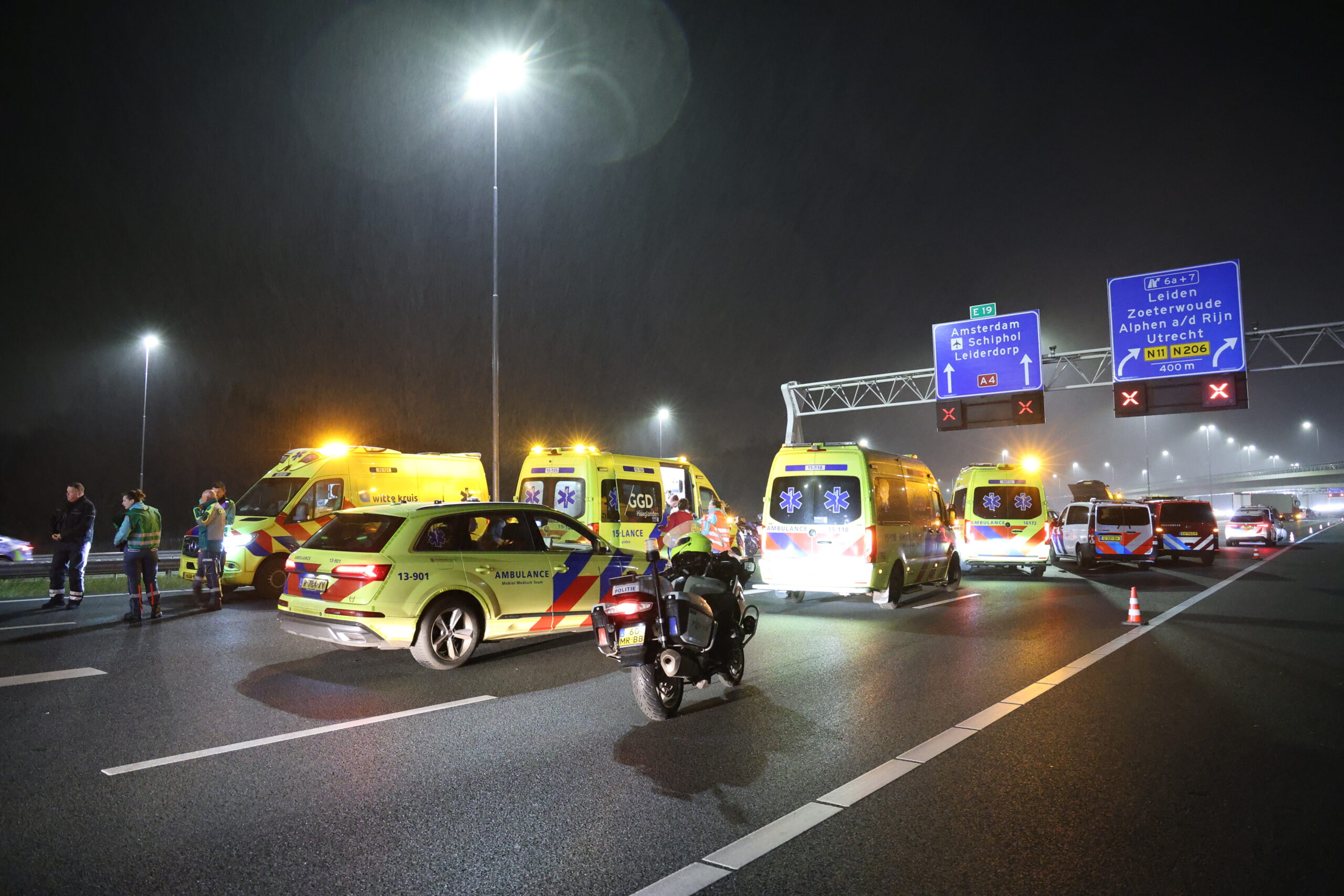 Bij twee zware aanrijdingen op de A4 ter hoogte van de afslag Leiden/Zoeterwoude zijn zaterdagavond vijf mensen gewond geraakt. De materiële schade is enorm. De politie sloot de snelweg in de richting van Amsterdam helemaal af