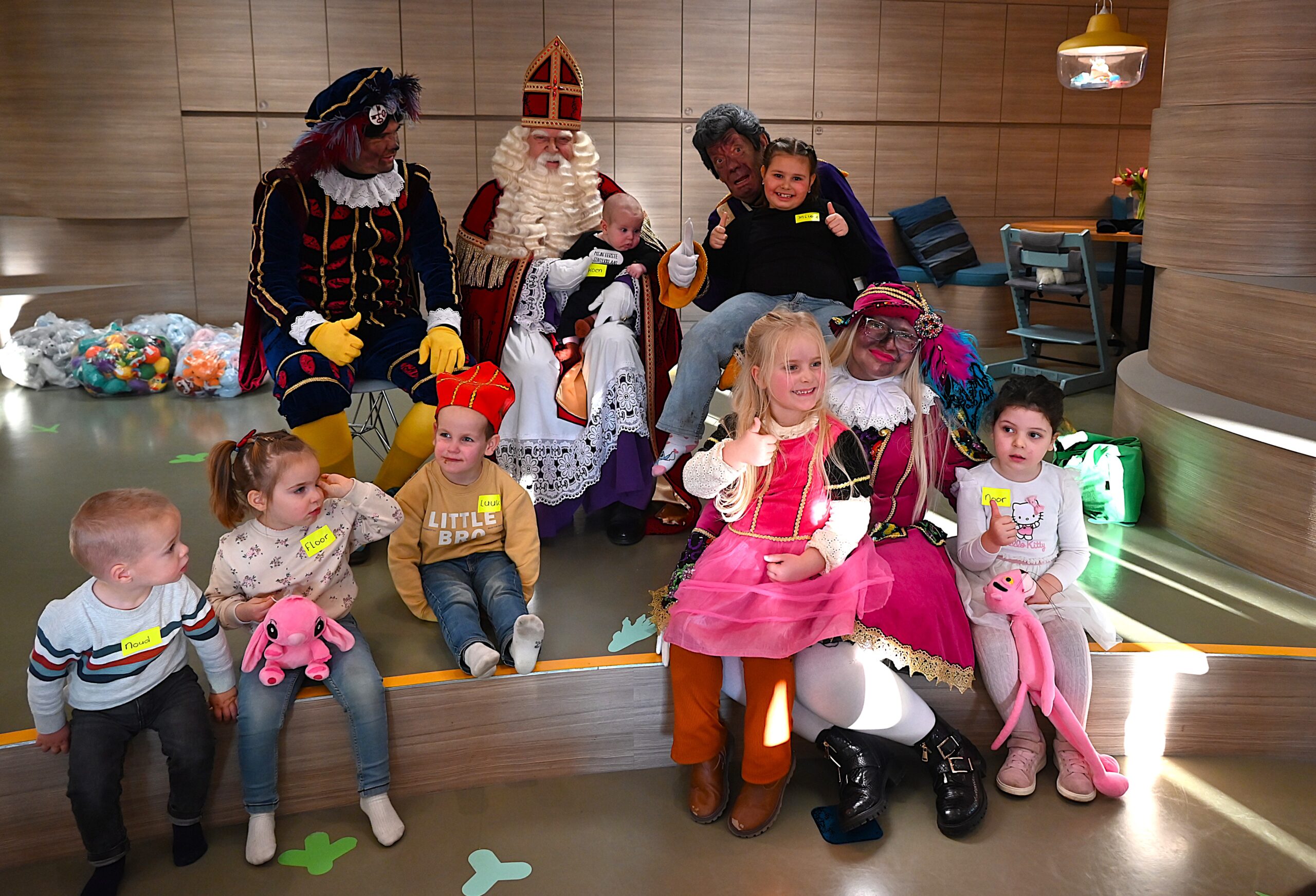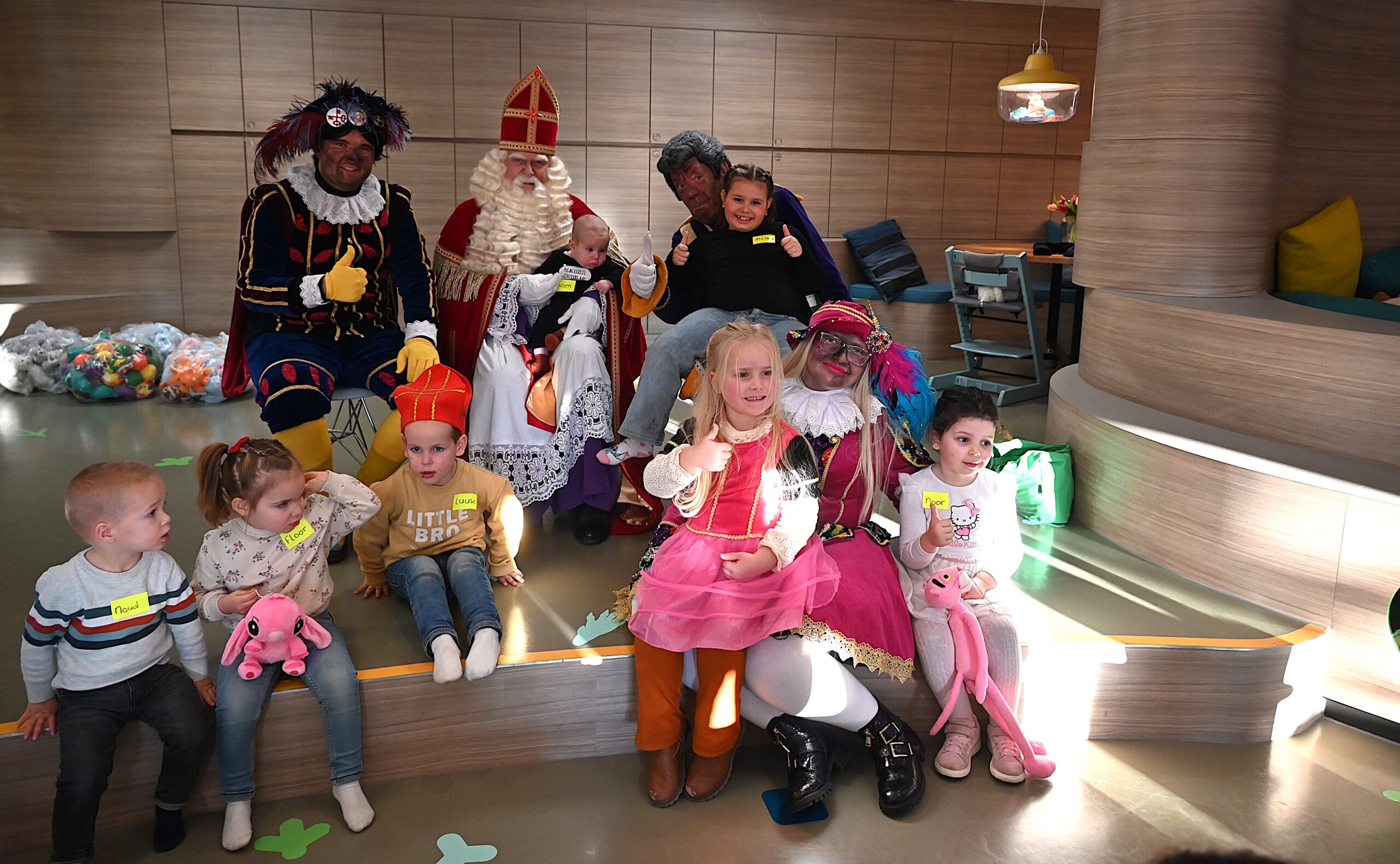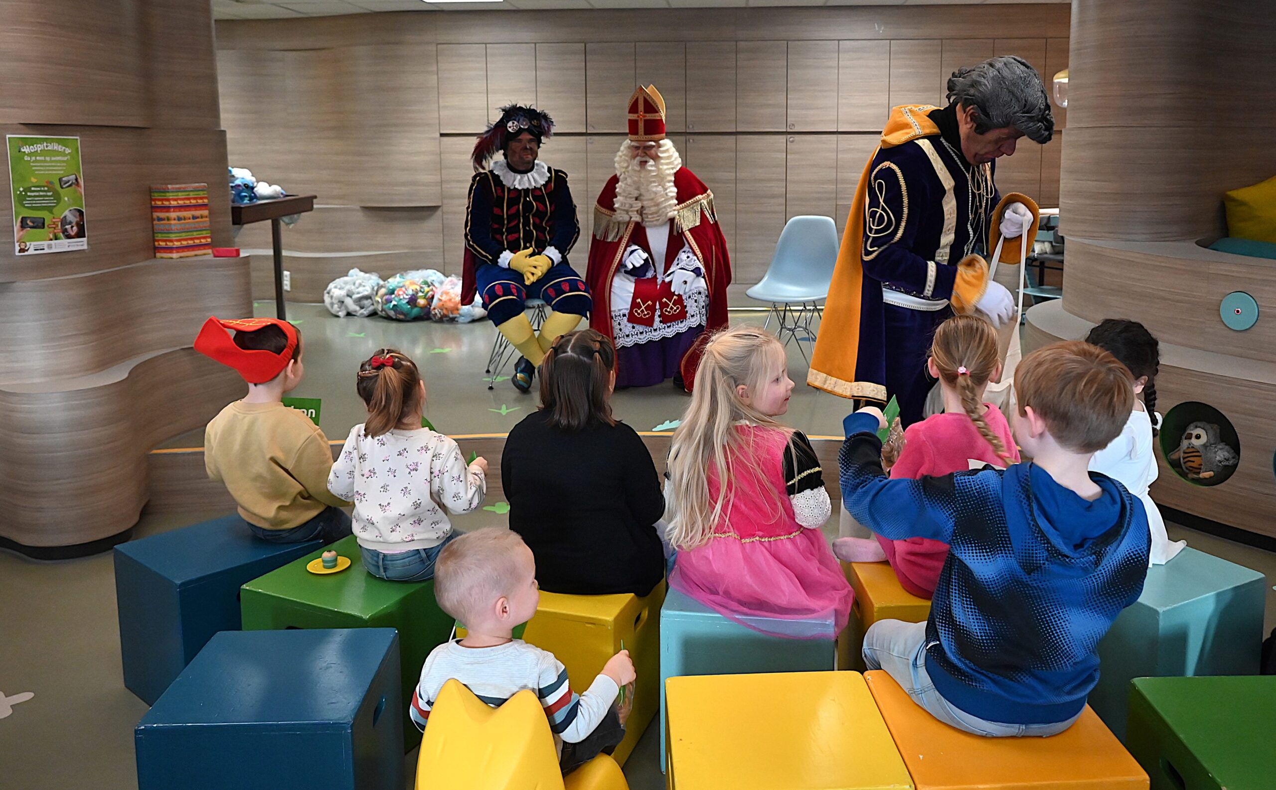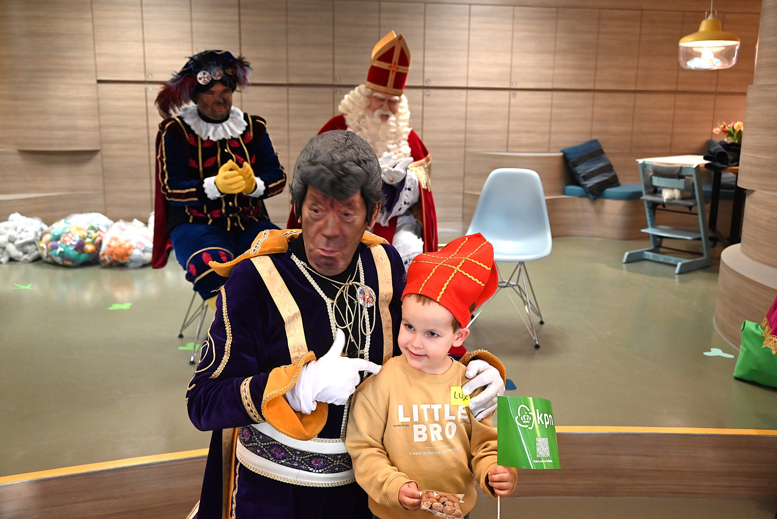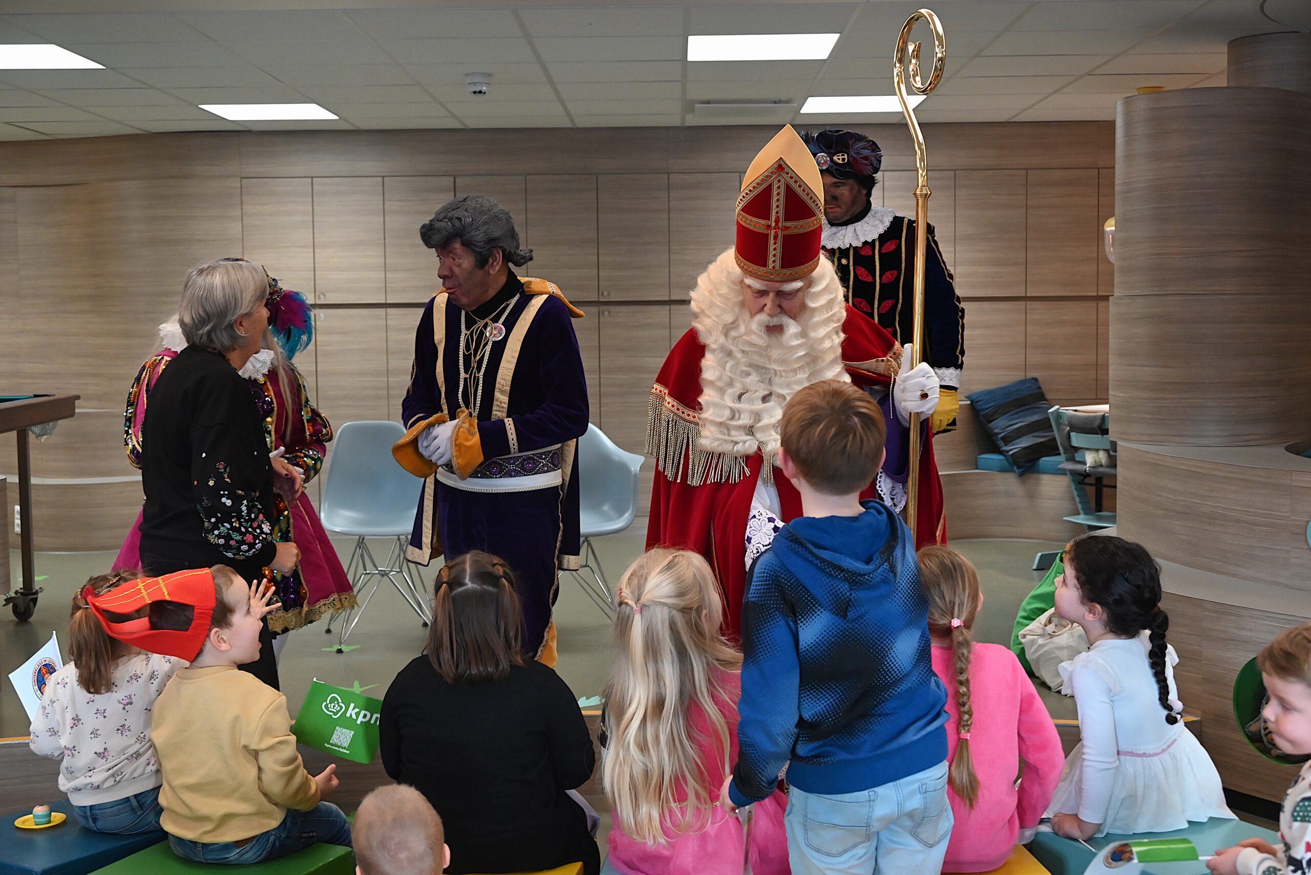 De Sint en zijn pieten kwamen woensdag naar de Ronald McDonald huiskamer in dat ziekenhuis. En ze brachten heel wat cadeautjes mee voor patiëntjes en hun broertjes en zusjes. Bij die cadeautjes kreeg de goedheiligman wat hulp van Nico Rijsbergen, die vaker zogenaamde ‘prikknuffels’ doneert aan het kinderziekenhuis. Ook sponsorde KPN twee Playstations, die gebruikt kunnen worden door de kinderen in het ziekenhuis.