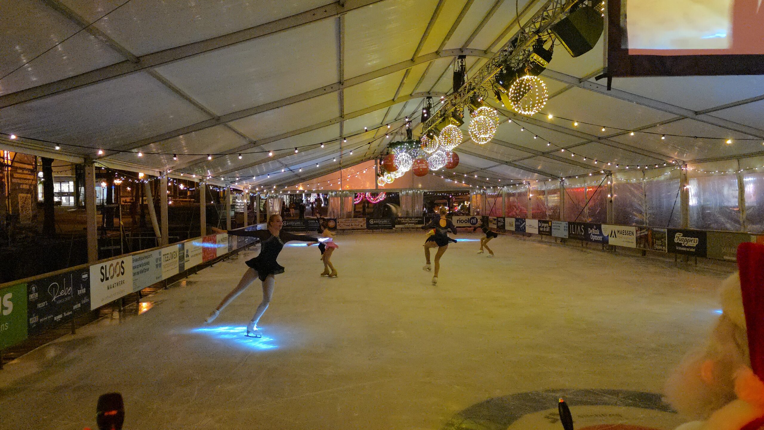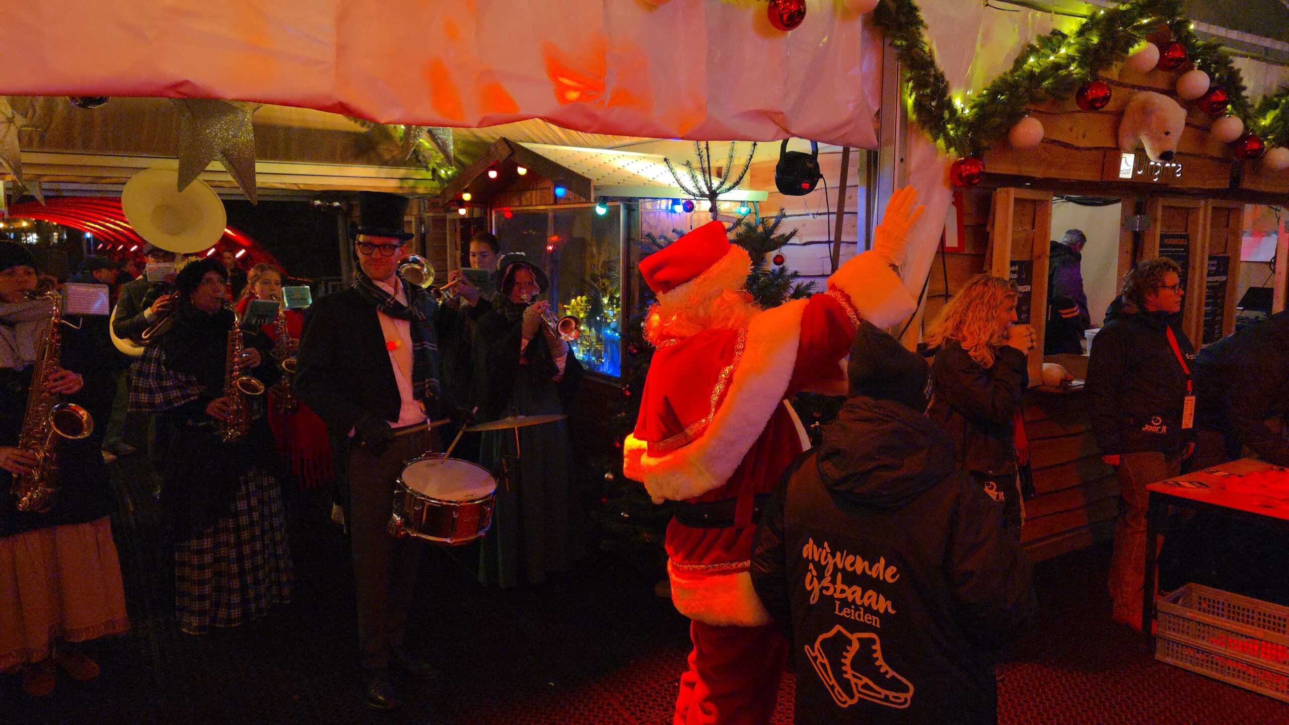 cDe Drijvende IJsbaan die jaarlijks door de stichting ‘Sport in Beeld’ wordt neergelegd op de Nieuwe Rijn in het hartje van Leiden is vrijdagavond officieel geopend door wethouder Wietske Veltman en de kerstman. Die laatste had kort daarvoor onder muzikale begeleiding Sinterklaas uitgezwaaid: Dag Sinterklaasje, dahag, dahag, dahag…