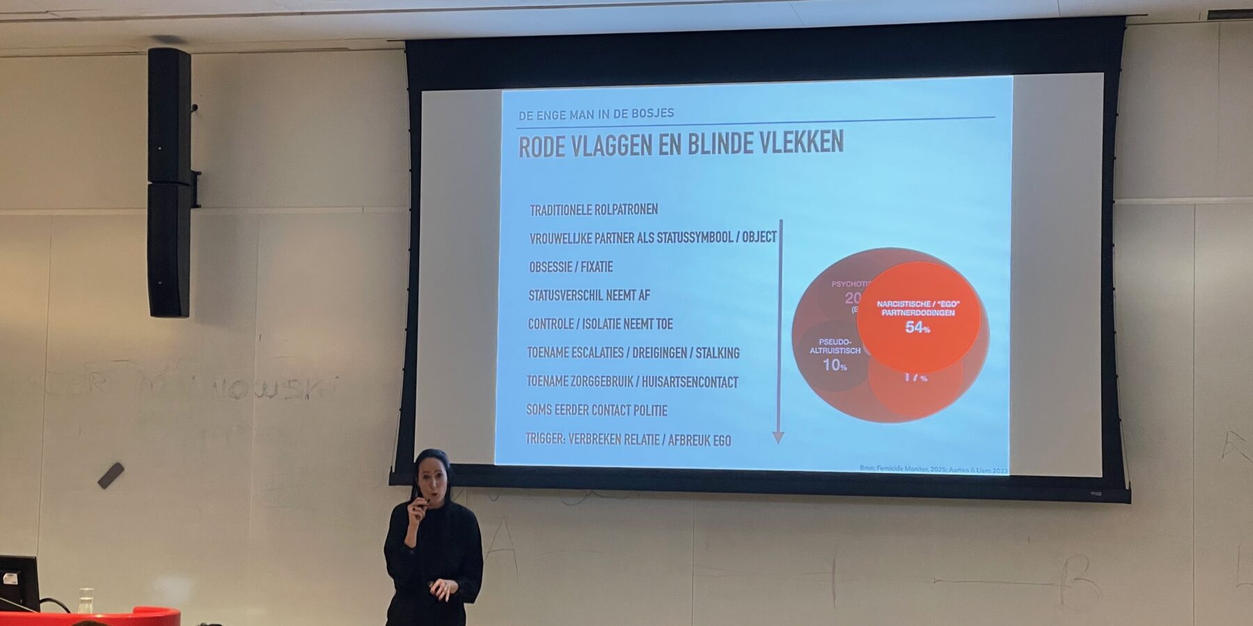 Aan het eind van Liem’s verhaal is er tijd voor vragen uit de zaal. Liem had in haar lezing de rol van de ‘buitenschil’ uitgelicht. Hoe belangrijk het is dat mensen die iets verder afstaan van een vrouw die in een gewelddadige relatie zit, soms beter in staat zijn om in te grijpen. “Ik denk dat we eigenlijk een maatschappij brede aanpak nodig hebben. Waarbij we kijken naar onder andere de rol van de huisarts. Maar ook die van scholen, collega’s, werkgevers. En dan duidelijke handvaten bieden hoe ze kunnen reageren. En wat ze specifiek kunnen doen. Uiteindelijk moet er groot nationaal actieplan komen. Om hier adequaat tegen op te treden.”