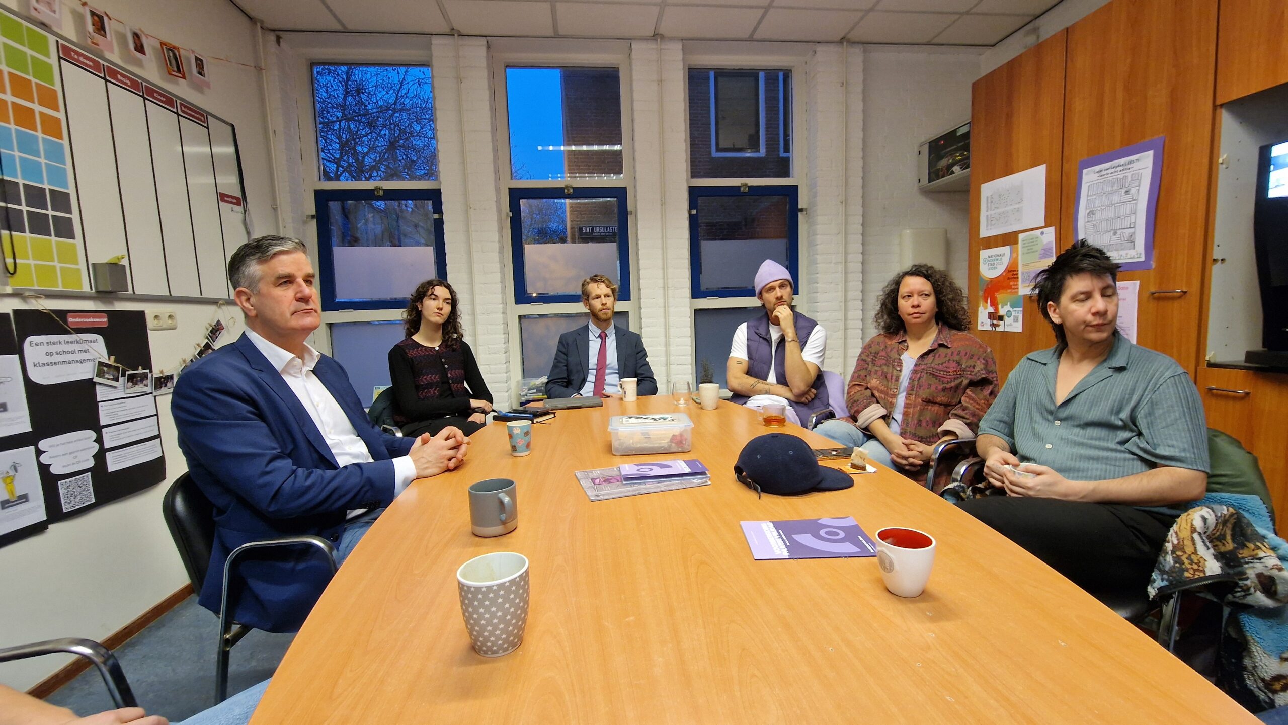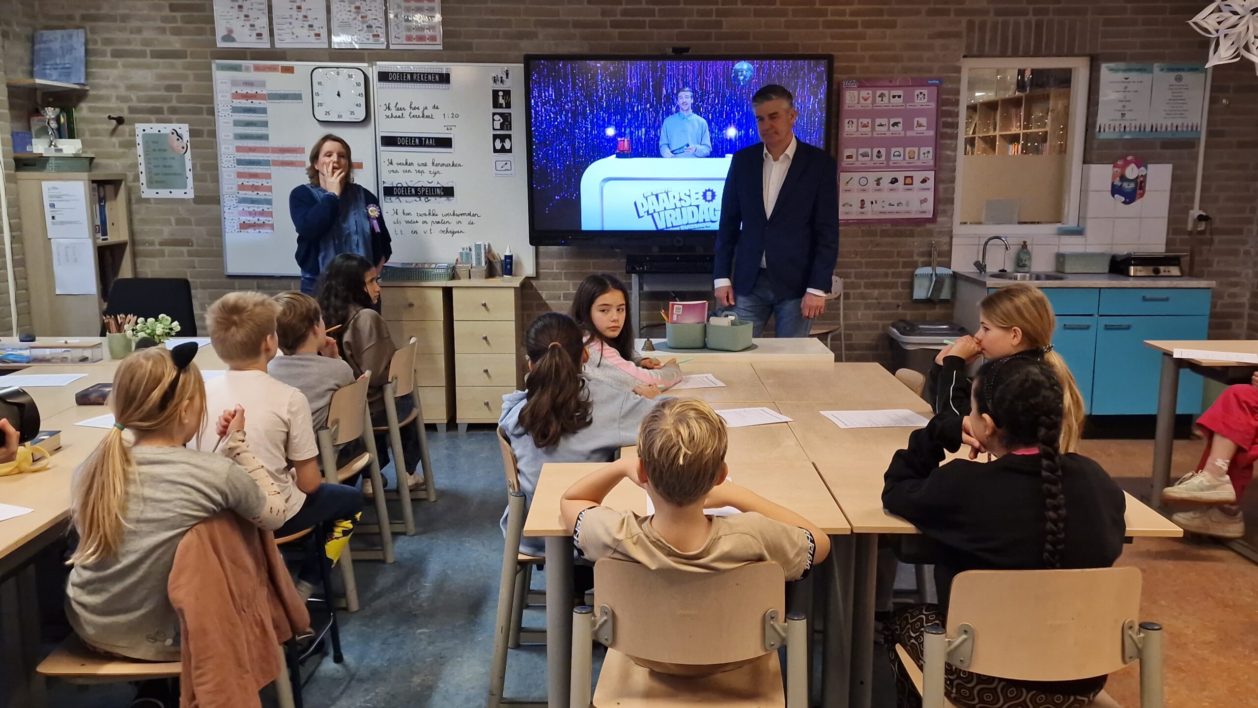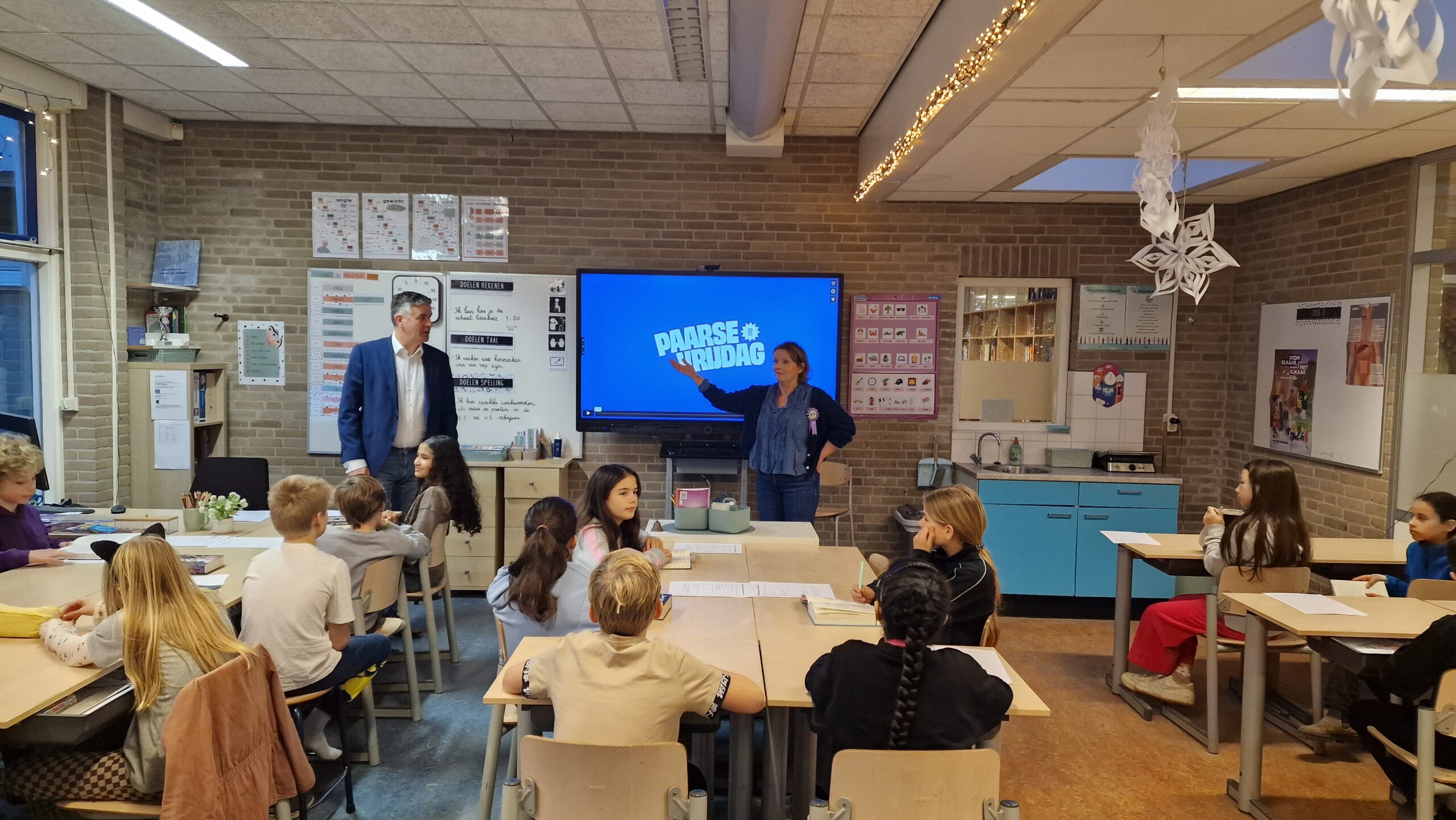 Hoog bezoek aan de Lucas van Leydenschool locatie Steeg aan de St. Ursulasteeg in Leiden vrijdagochtend. Daar kwam staatssecretaris van primair onderwijs en emancipatie Koen Becking langs om een les over Paarse Vrijdag bij te wonen.