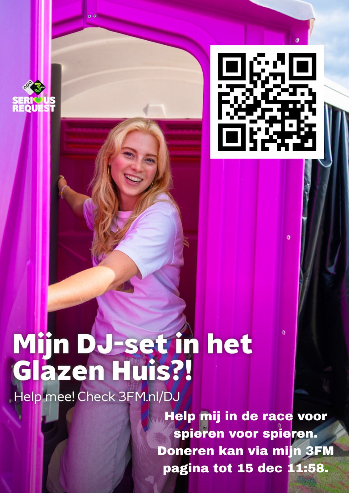 Frankhuizen strijdt met veertien andere dj’s om een van de plekken tijdens de nachten in het het Glazen Huis. De zes dj’s die voor maandag 11.58 uur het meeste geld ophalen voor ‘Spieren voor Spieren’ worden geselecteerd. Bij AIS staat de teller momenteel op 2.205 euro. Doneren kan via haar eigen actie pagina op de website van 3FM Serious request of via de QR-code hieronder.