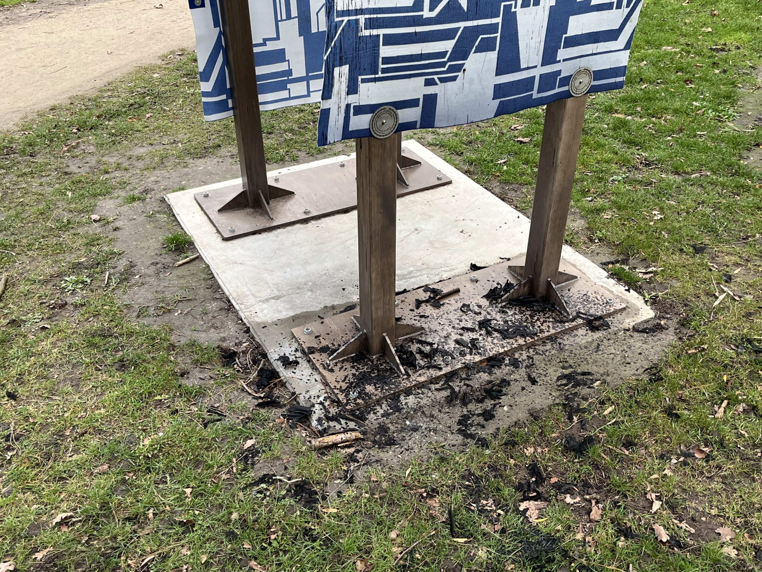 Het kunstwerk Traces in het Plantsoen is dit weekend beschadigd door brandstichting. Een paneel van het kunstwerk werd in brand gestoken. Het is de tweede keer dat het kunstwerk doelwit is van vandalisme.