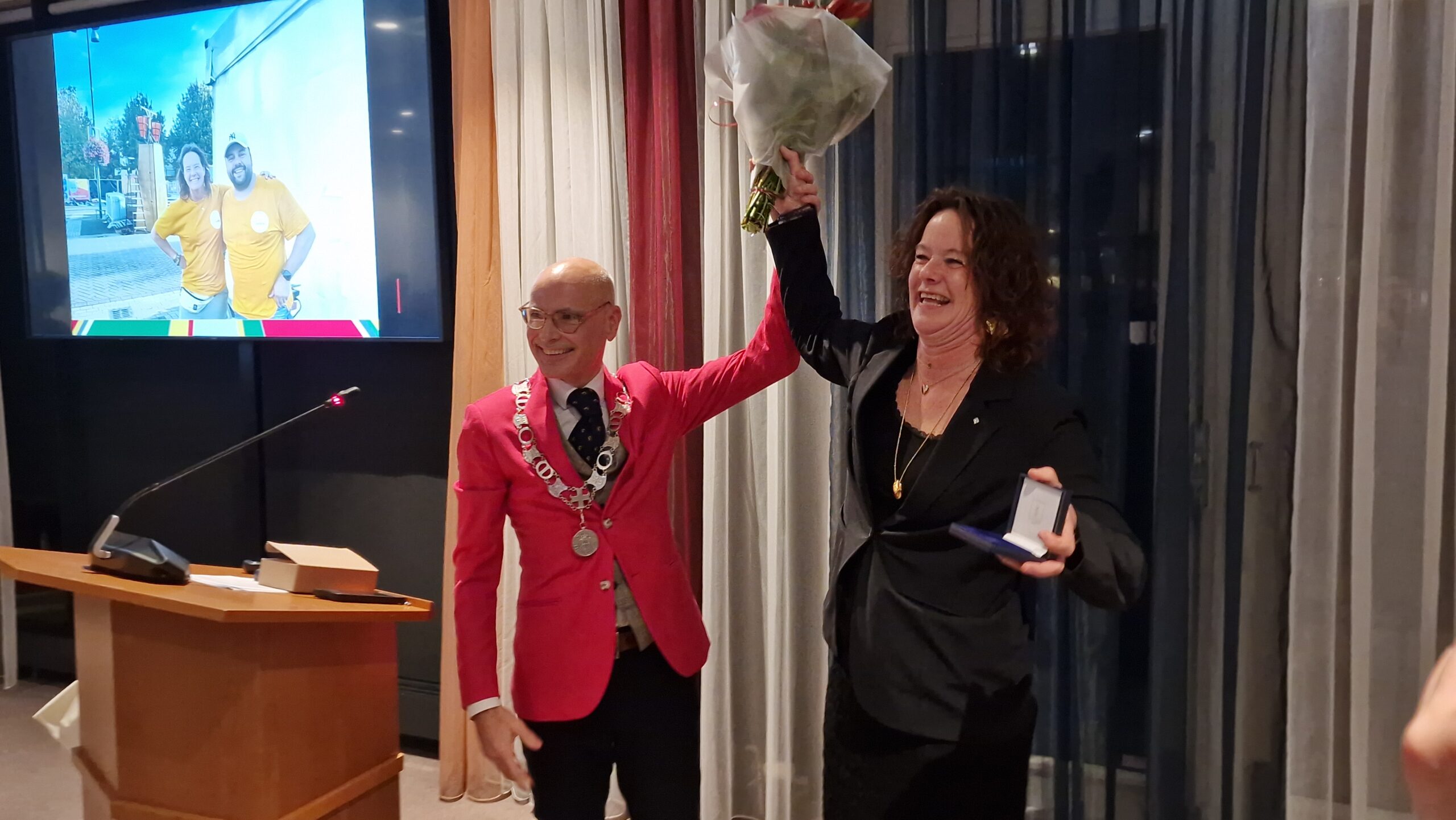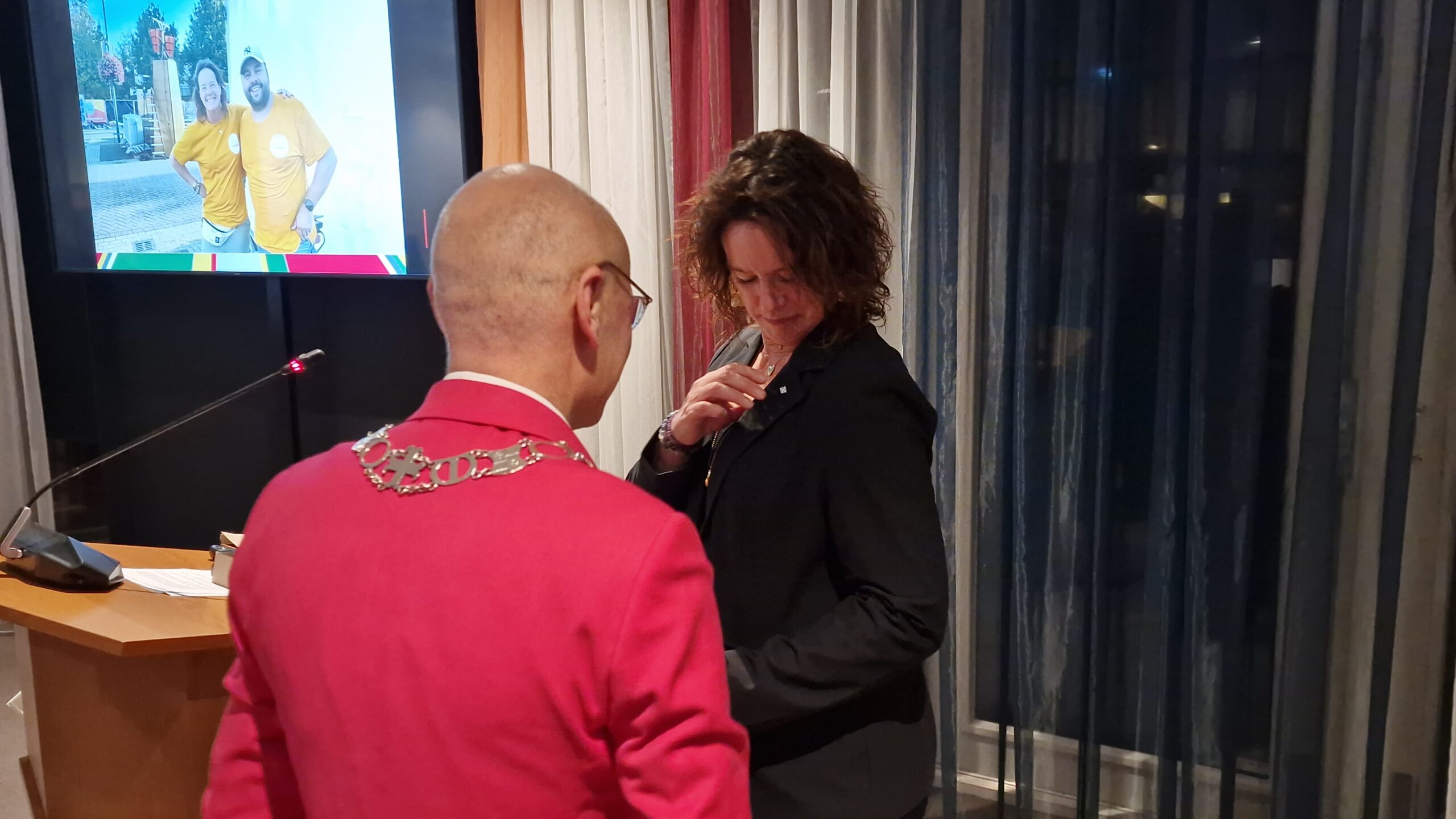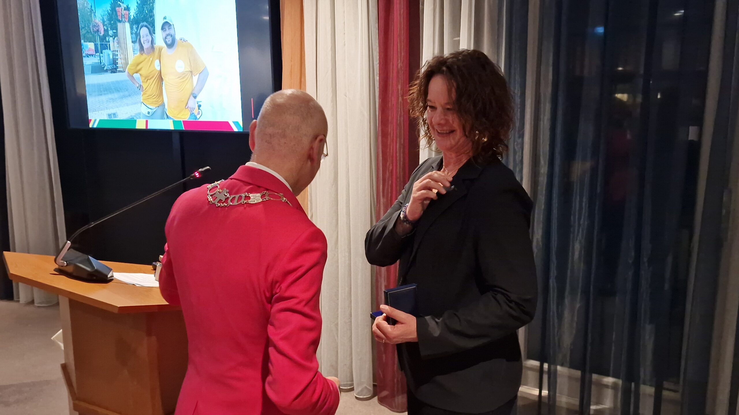 “Samenvattend: met Dorpskracht heb je het hele dorp verbonden. Hut 16 is voor de jeugd tot 13 jaar, het kerstdiner voor de eenzame en de ouderen en het Dorpsfeest voor iedereen”, aldus burgemeester Jaensch, die de Erepenning overhandigde en haar het bijbehorende spelde opspeldde.