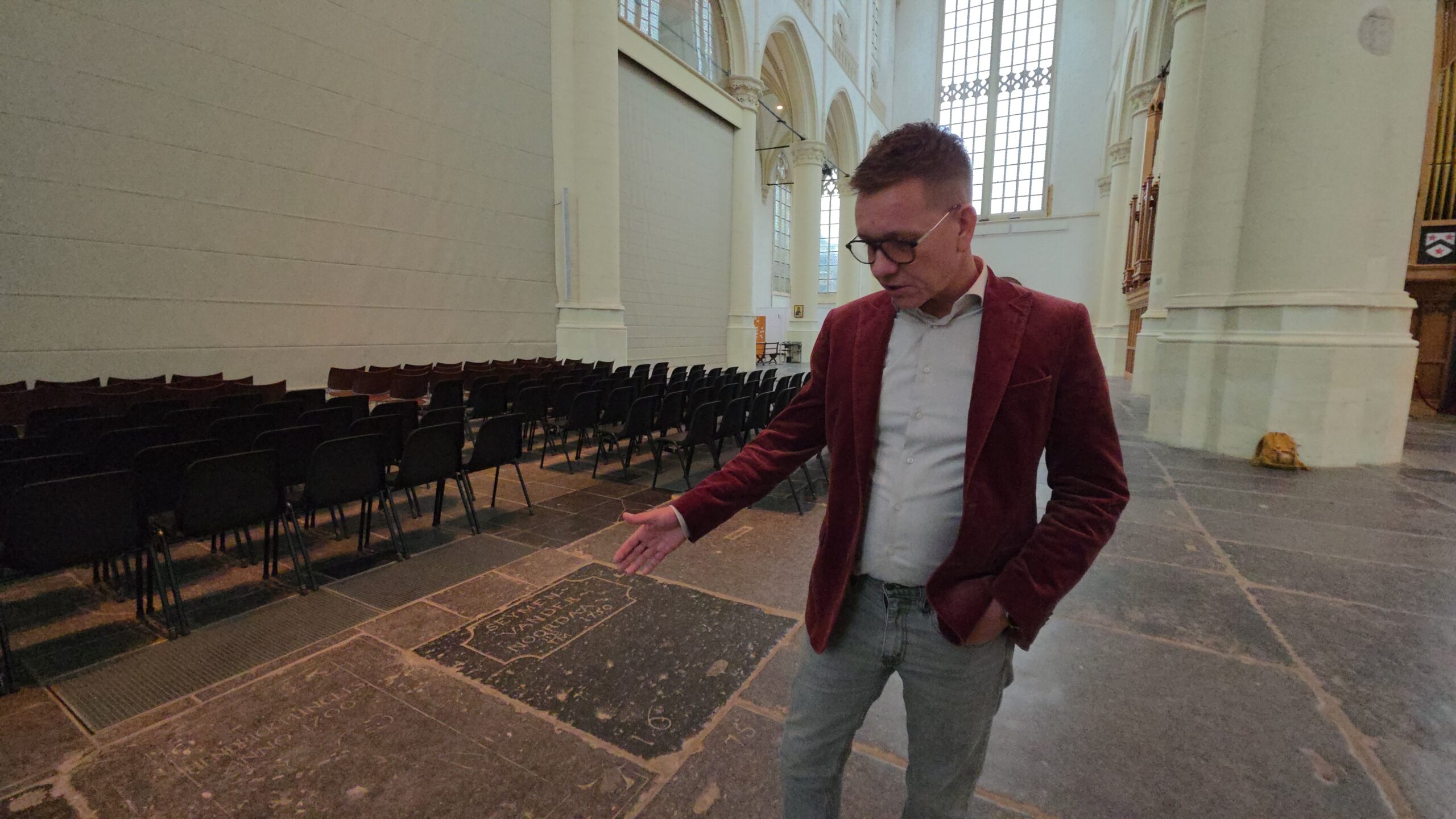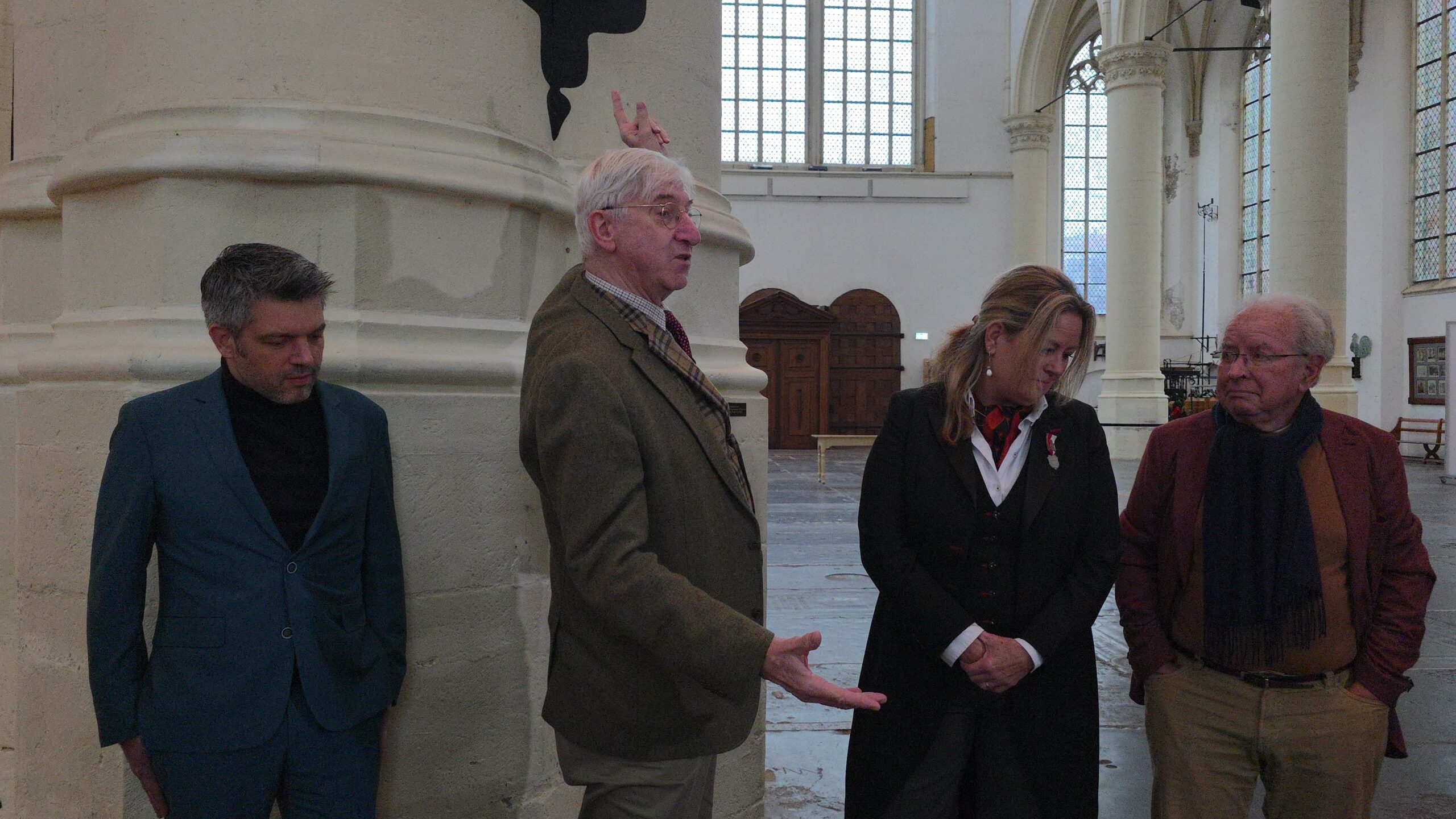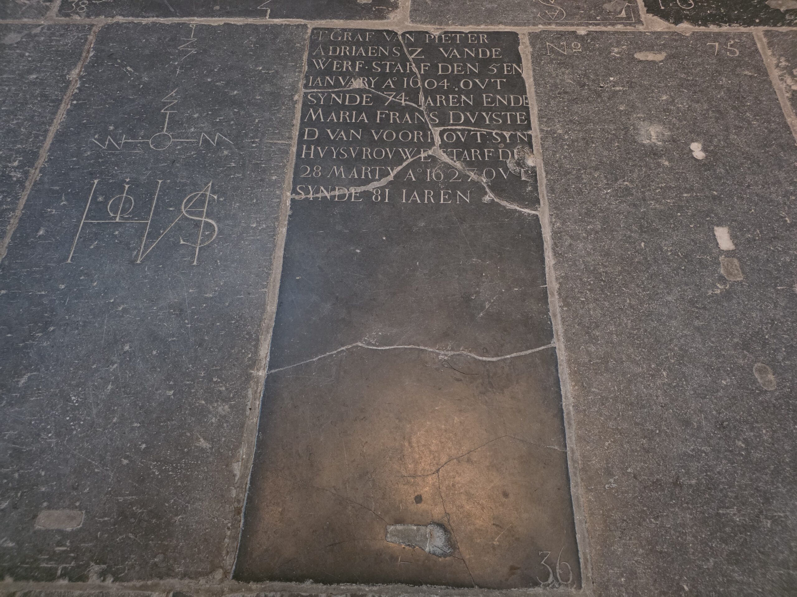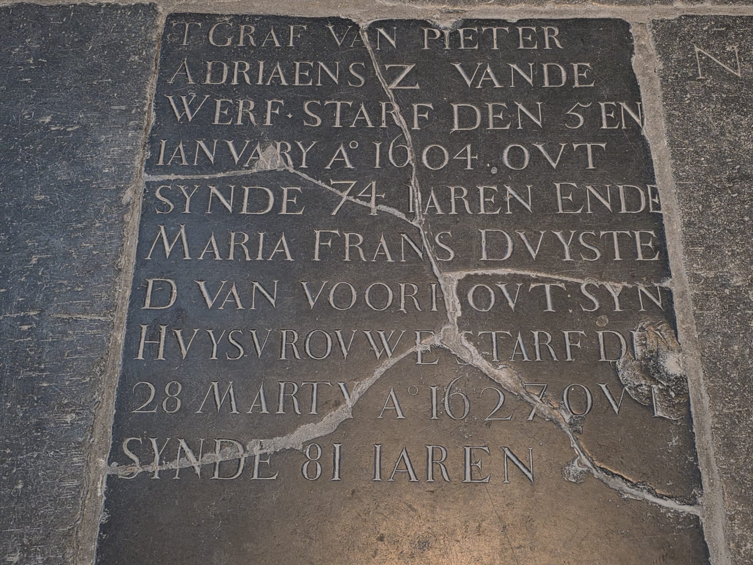 De grafsteen van Pieter van der Werf is in verschillende stukken gebroken. Restaurateurs van de organisatie ‘Meesters In’ herstellen de grafsteen, zodat deze weer in volle glorie in de Hooglandse Kerk komt te liggen.
