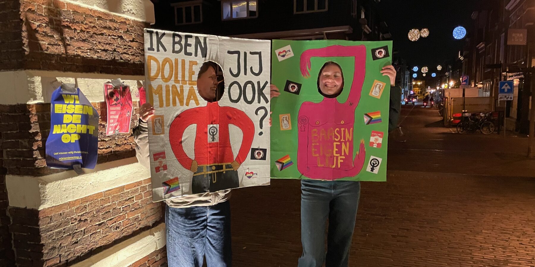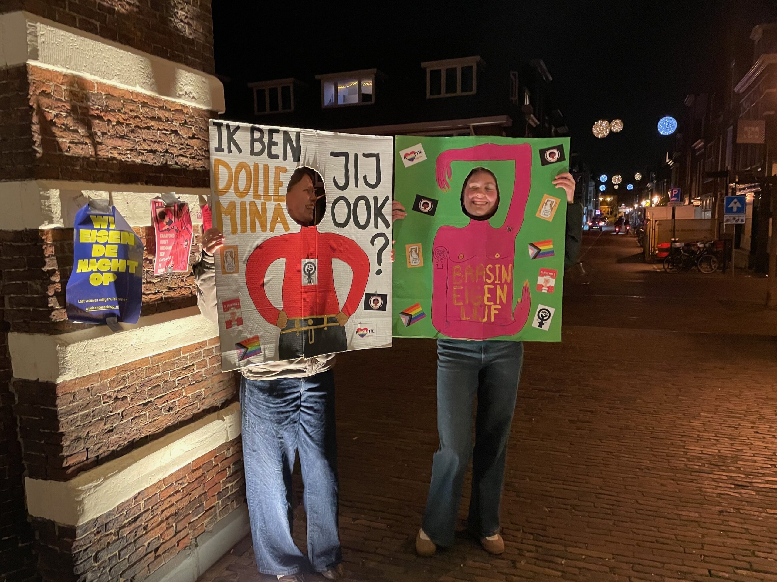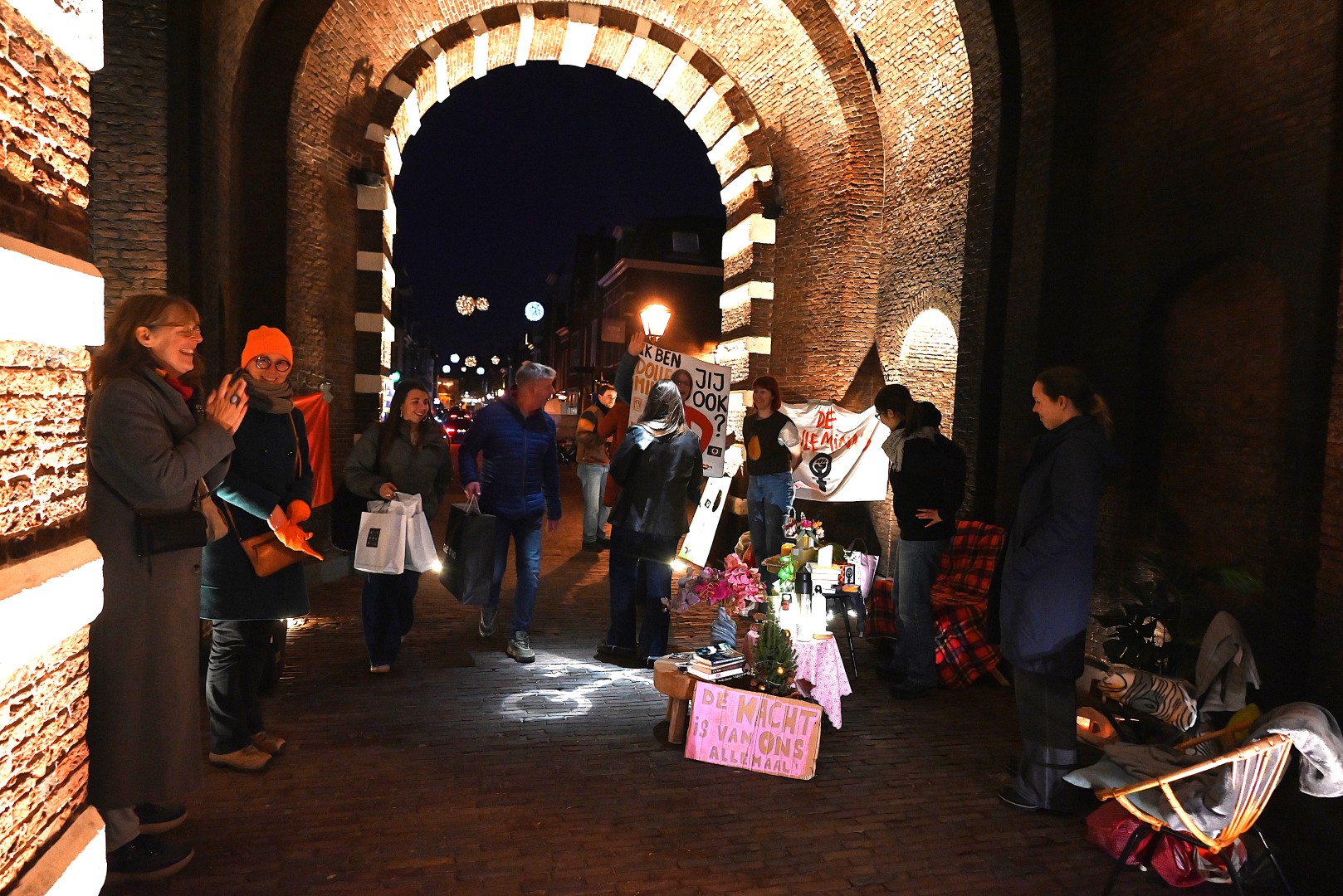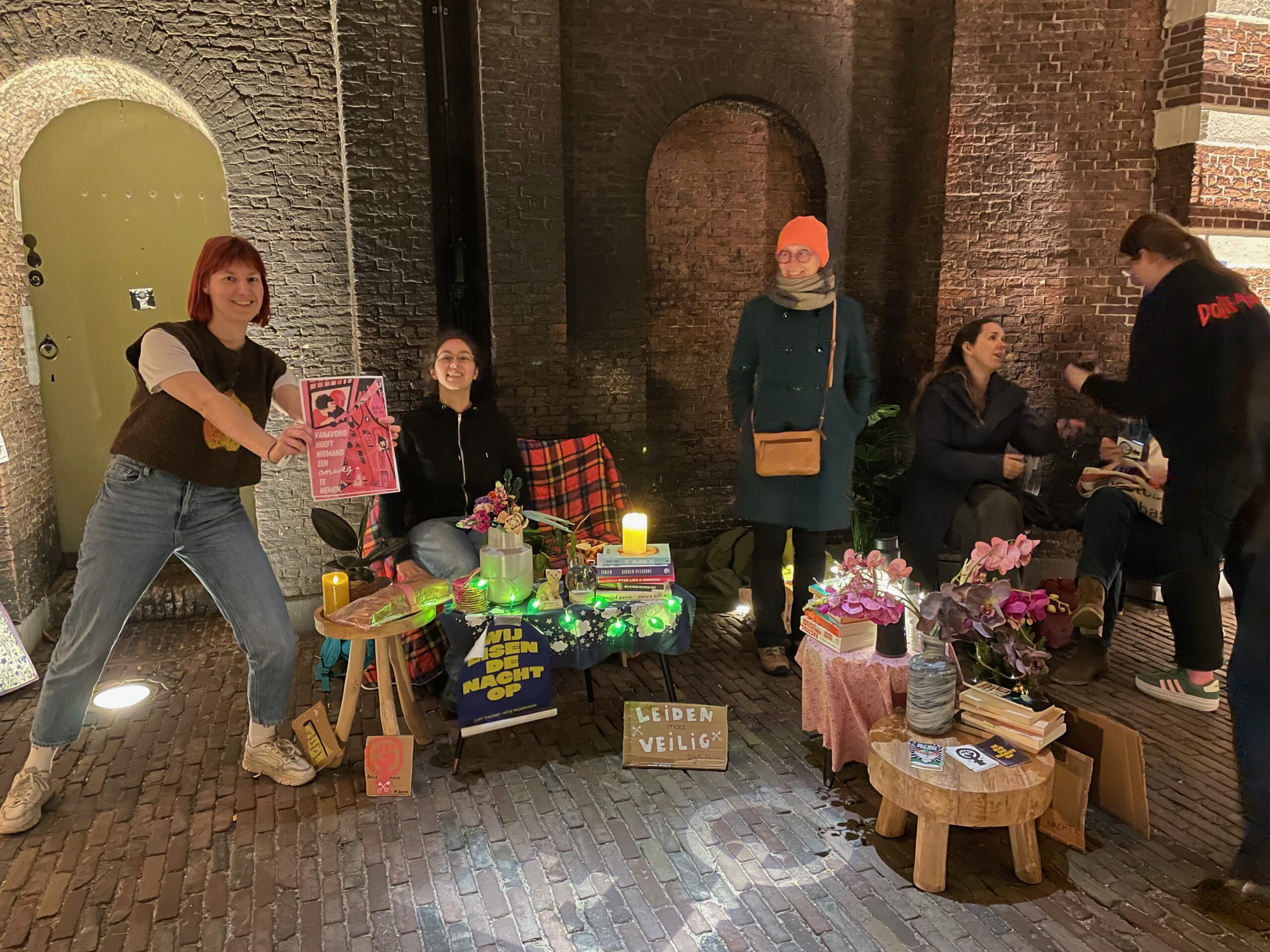 Tijdens de langste nacht vragen in het hele land Dolle Mina’s aandacht voor veiligheid op straat. “Voor vrouwen, meisjes en transpersonen”, zegt Bo Schubert van de Leidse Dolle Mina’s. Zij hebben een huiskamer ingericht onder de Morspoort. Ze delen stickers en cake uit.