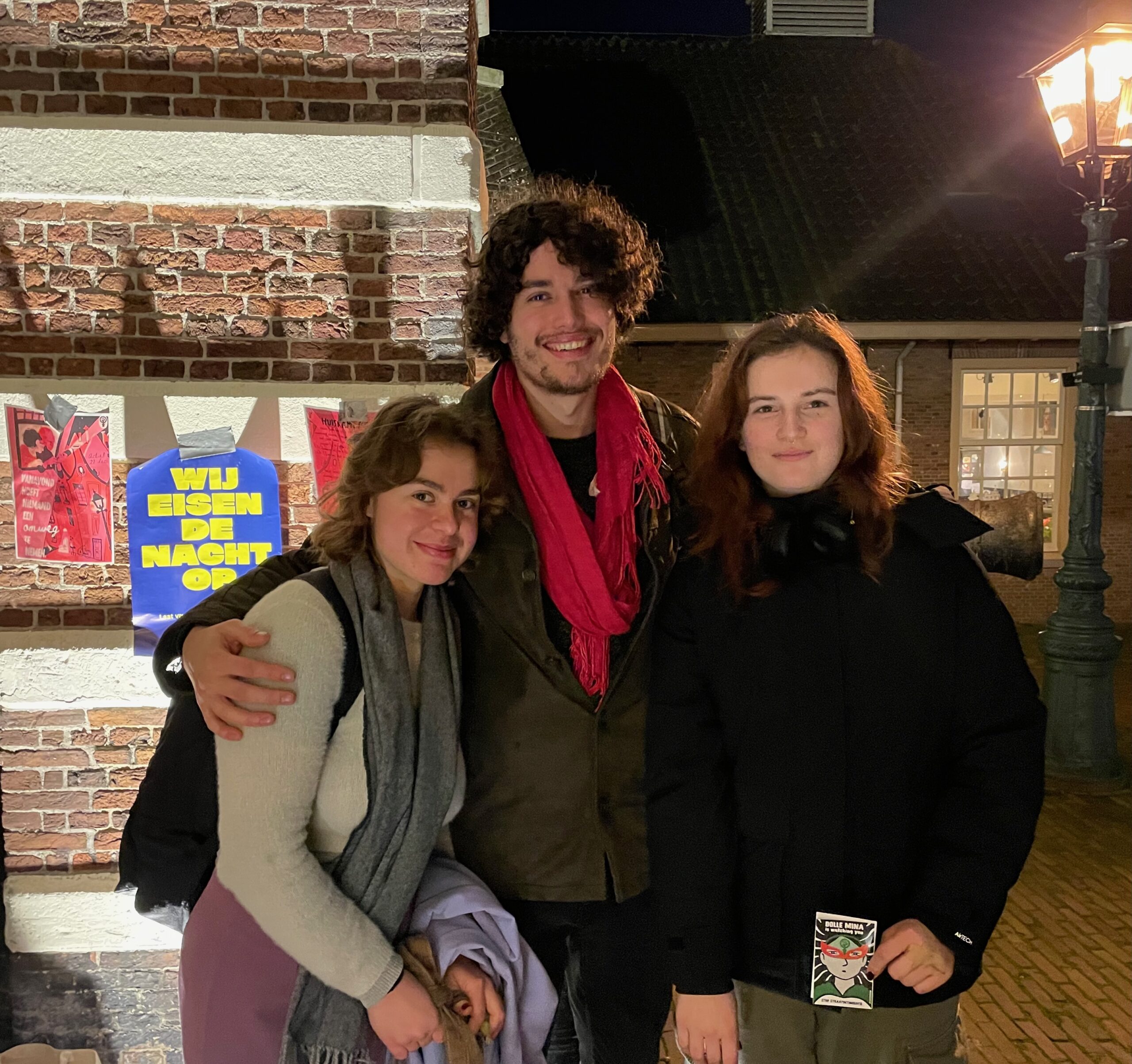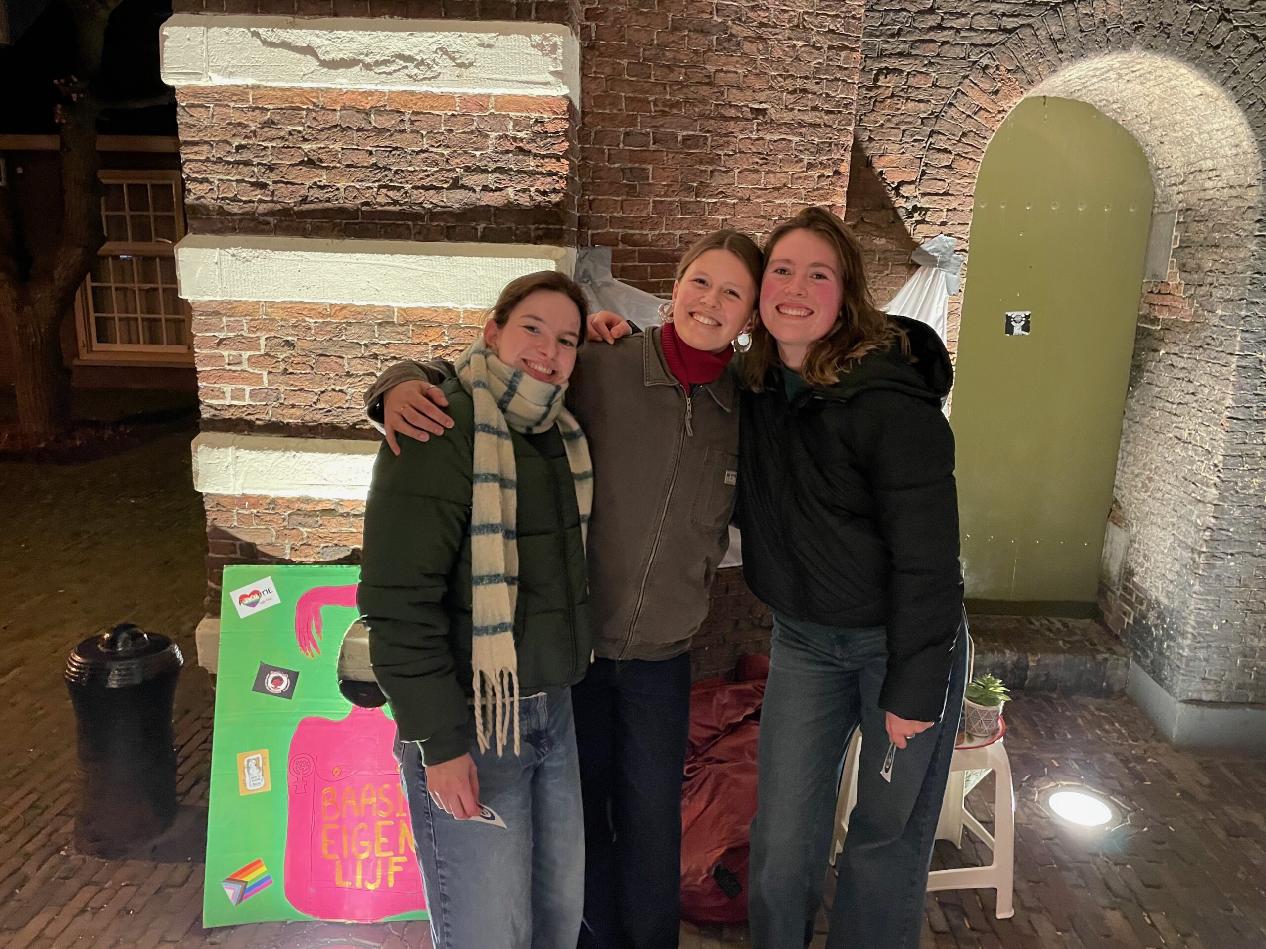 Drie studentes komen ook even langs om steun te betuigen aan de actie. Ze maken foto’s van elkaar met de verschillende borden en nemen graag nog wat extra stickers mee om in hun huis uit te delen.