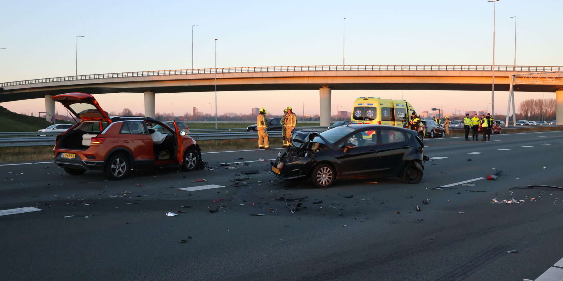 Rond 15.40 uur ging het mis op de hoofdrijbaan richting Leiderdorp. Door nog onbekende oorzaak vonden er kort na elkaar twee aanrijdingen plaats. De hulpdiensten rukten massaal uit. Naast meerdere politie-eenheden en de brandweer kwamen er vier ambulances ter plaatse om hulp te verlenen.