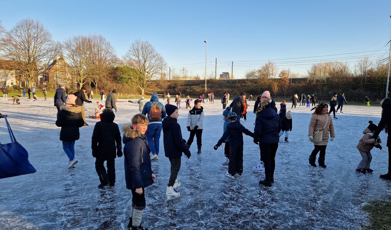 De skeelerbaan van de Vereniging IJssport Leiderdorp is vorige week onder water gezet. Er ligt inmiddels een laag ijs op bijna de hele baan, maar die is nog niet dik genoeg om op te kunnen schaatsen. De vereniging durft nog niet te voorspellen wanneer er wel kan worden geschaatst bij het Weteringpark.