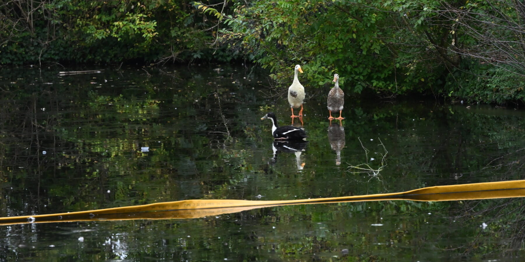 Twee bevriende eenden bleven het slachtoffer steunen. De brandweer legde een lange slang over de vijver en zo lukte het het dier los te maken.