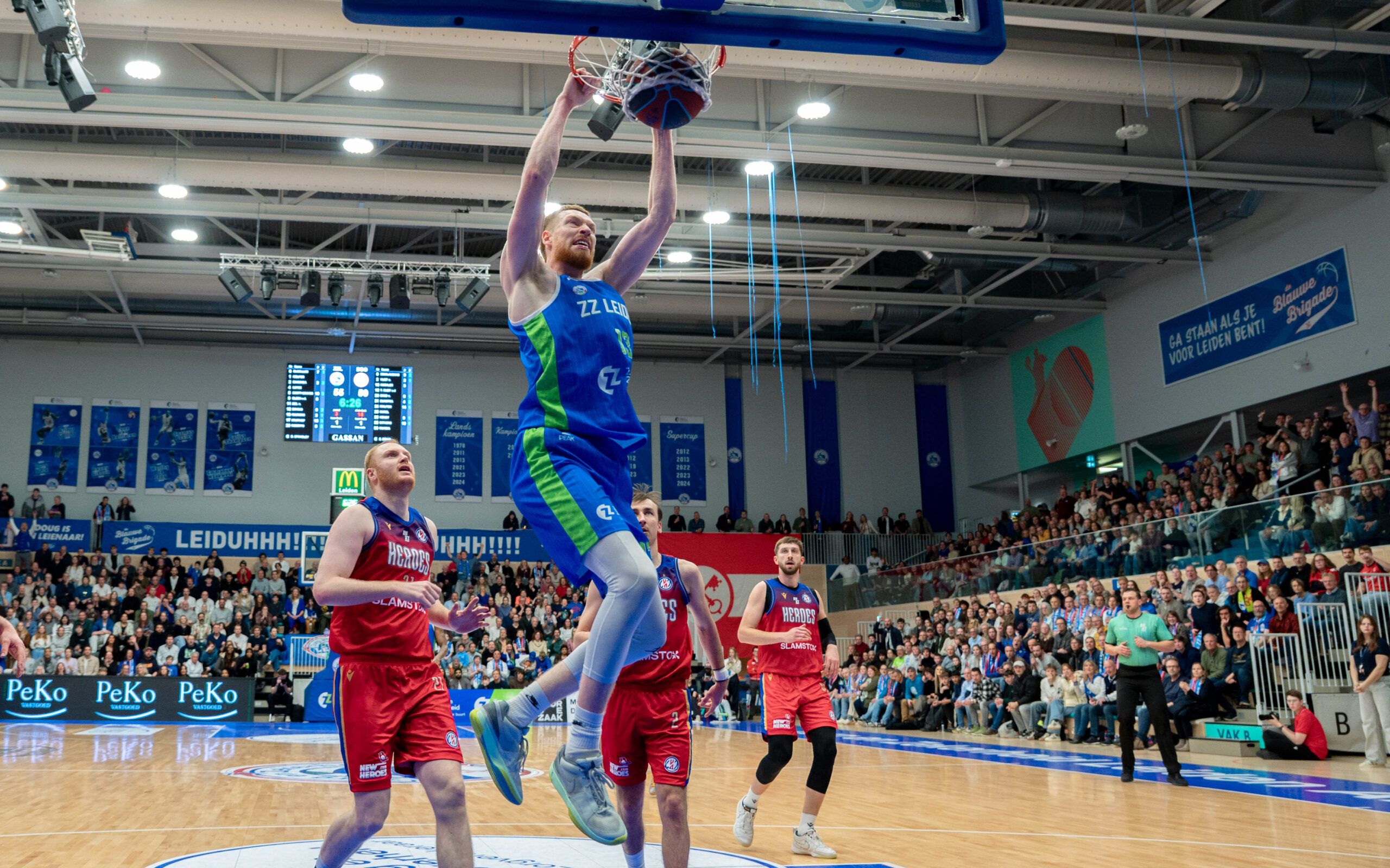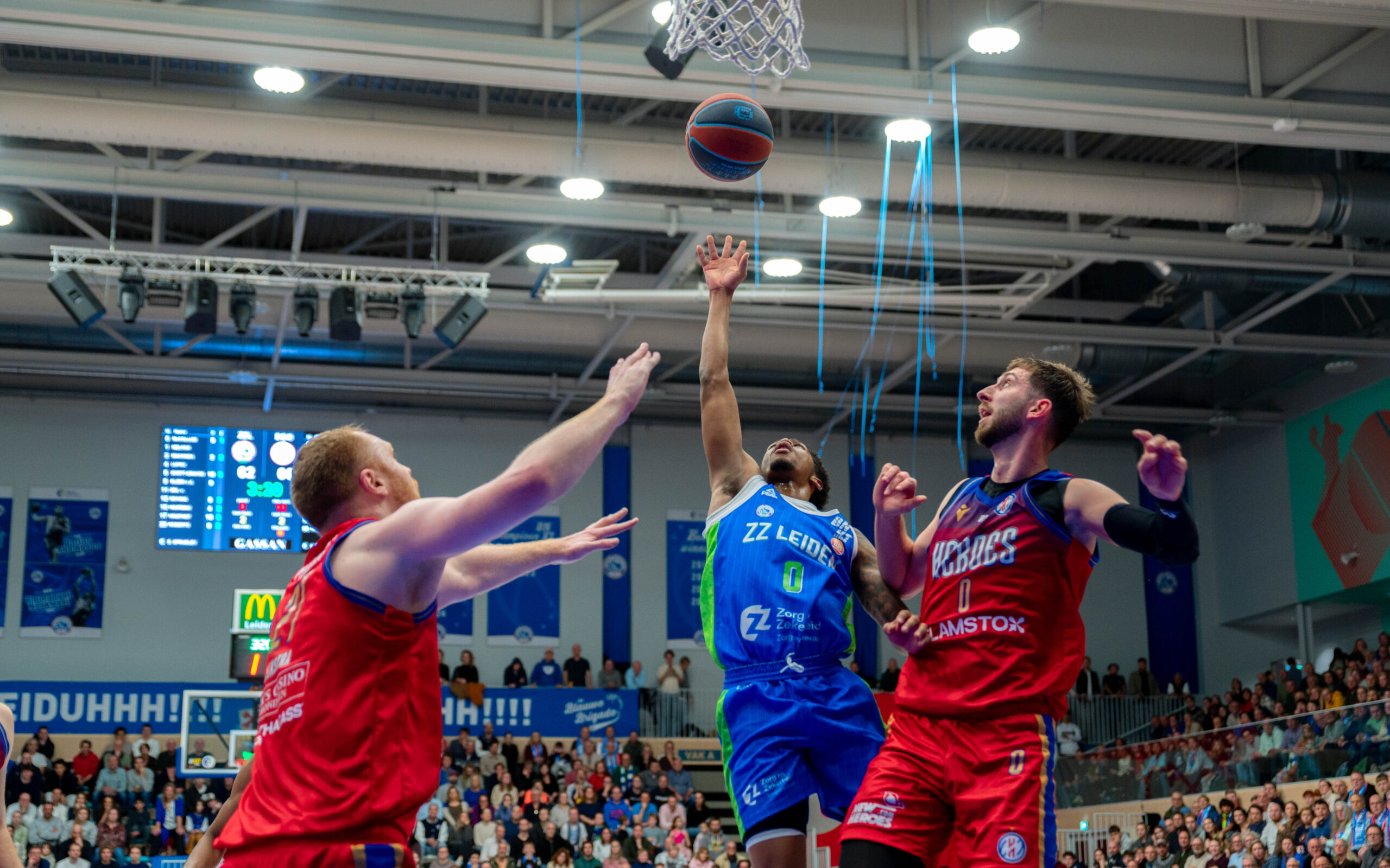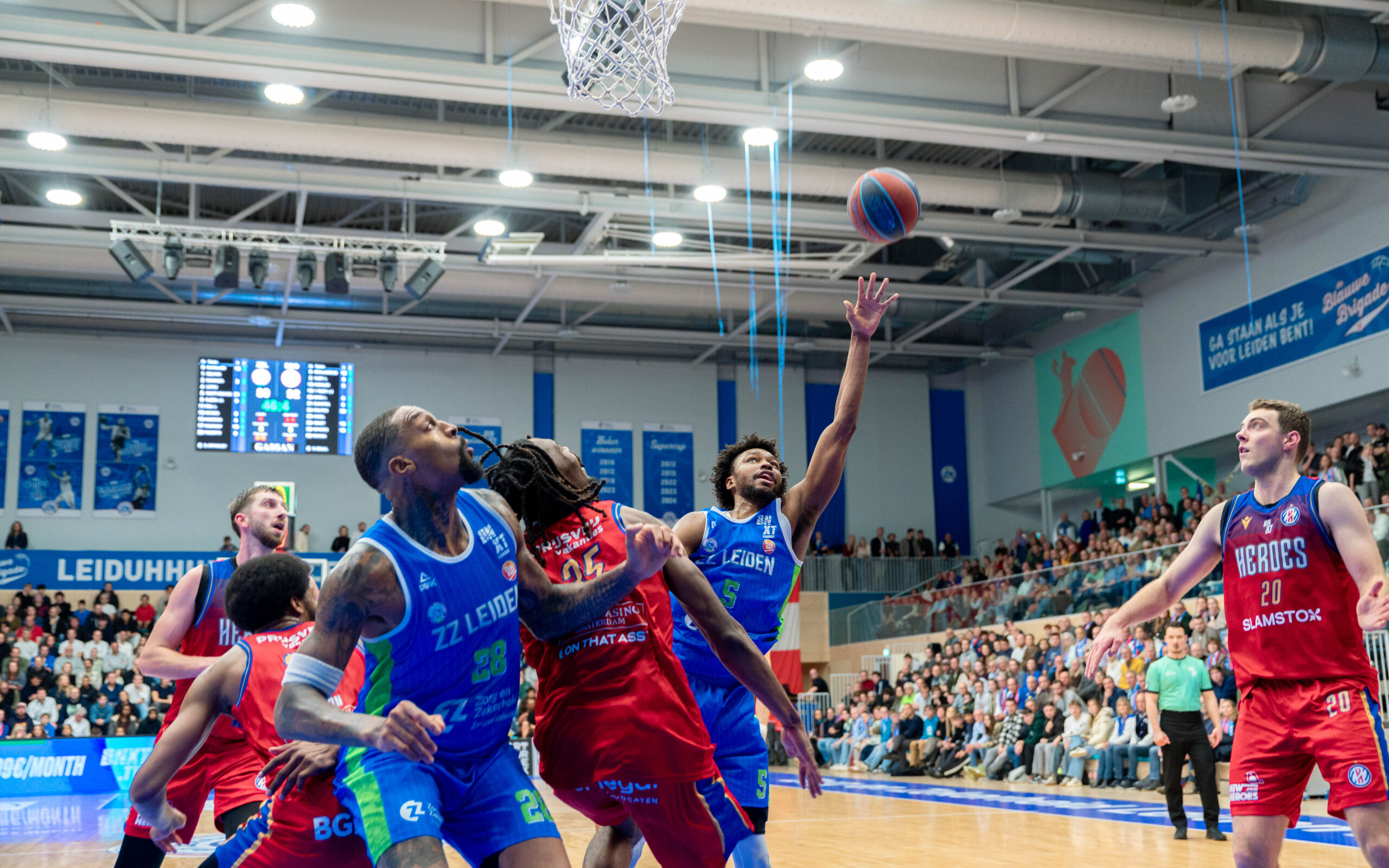 Zorg en Zekerheid Leiden heeft het jaar in een uitverkochte Arena 1574 enigszins in mineur afgesloten. Tegen aartsrivaal Heroes Den Bosch moest de Leidse formatie vooral in het tweede kwart passen. Dat ging met 18-35 verloren, waardoor ZZ Leiden bij rust tegen een achterstand van 12 punten aankeek: 45-57.