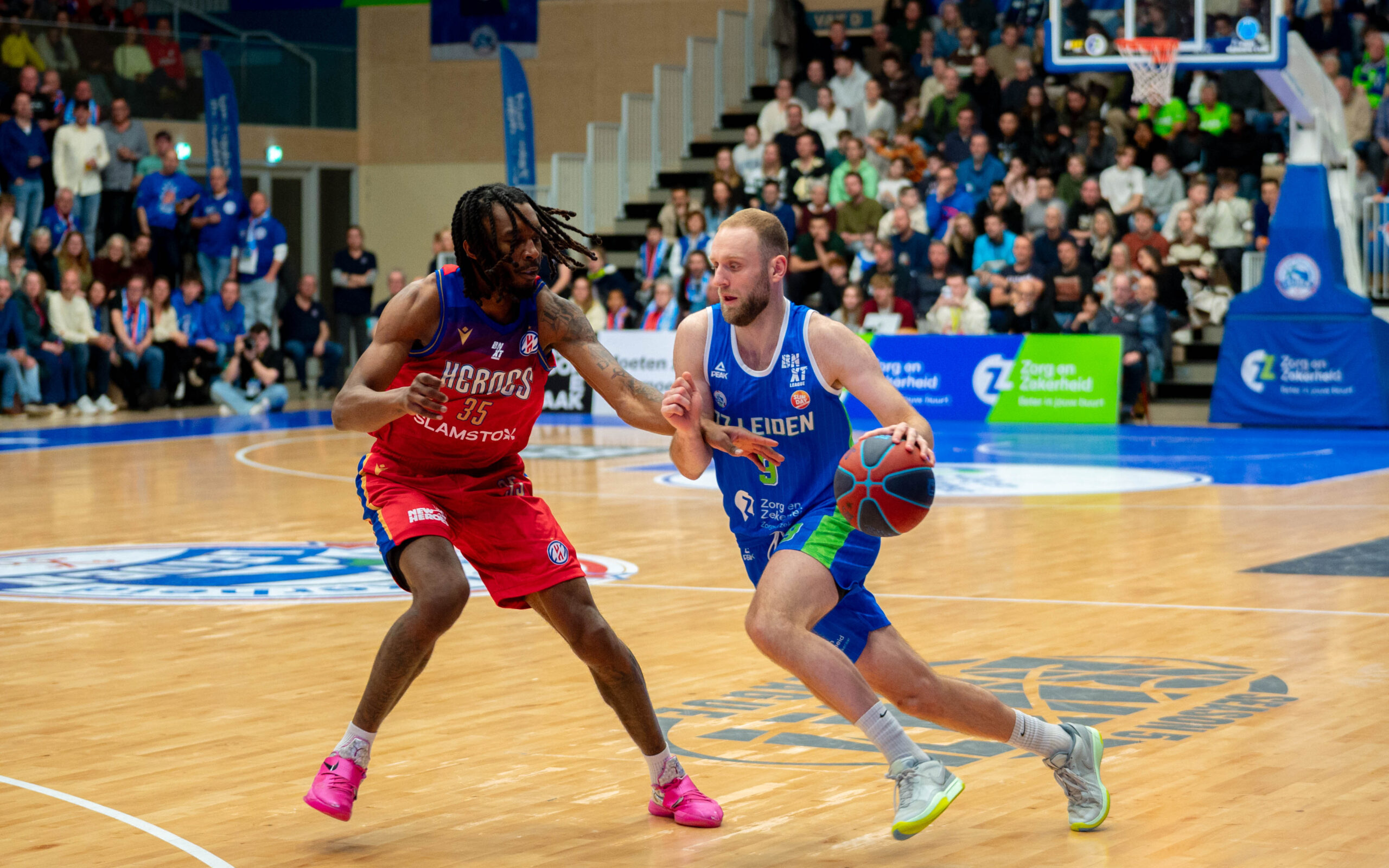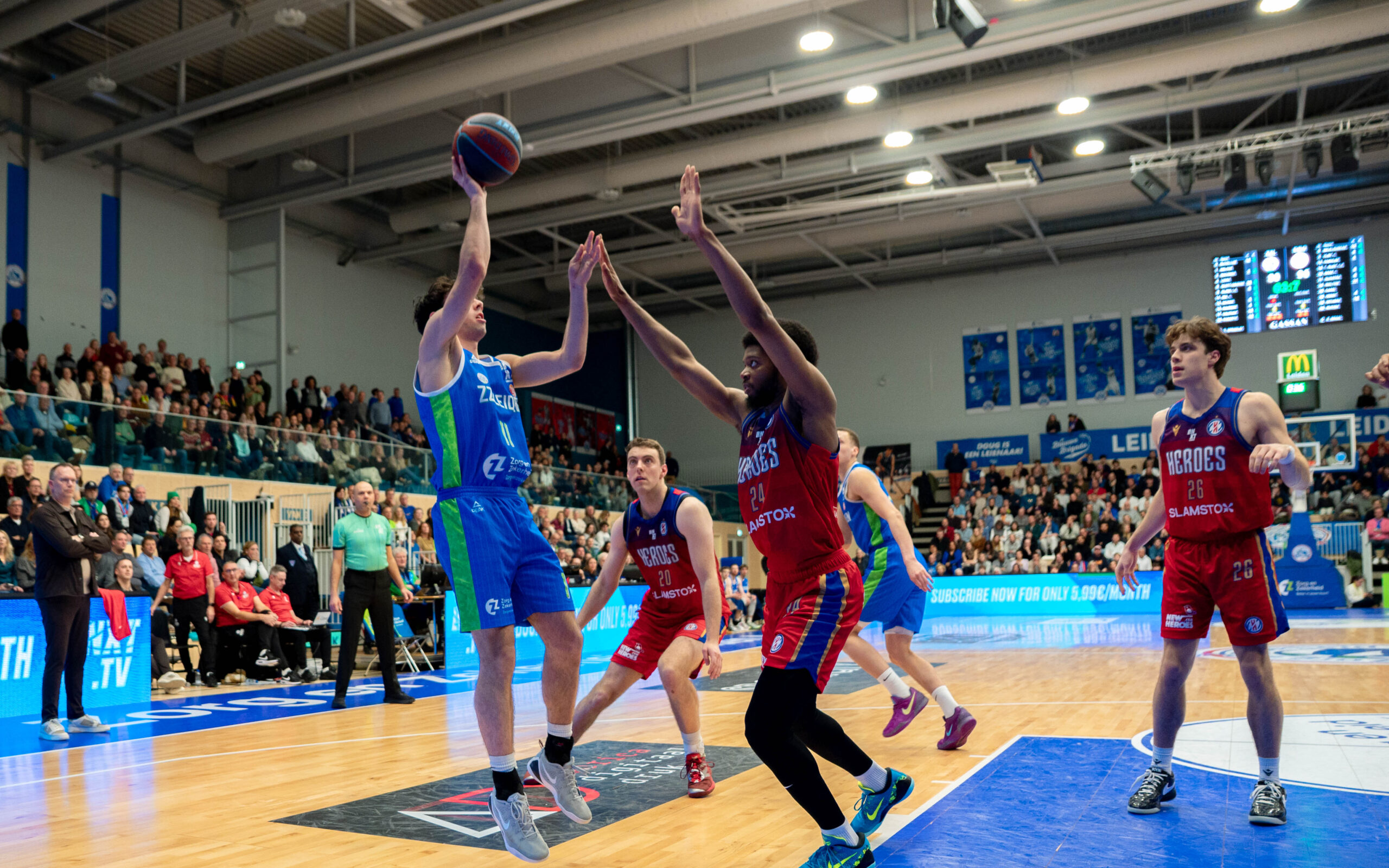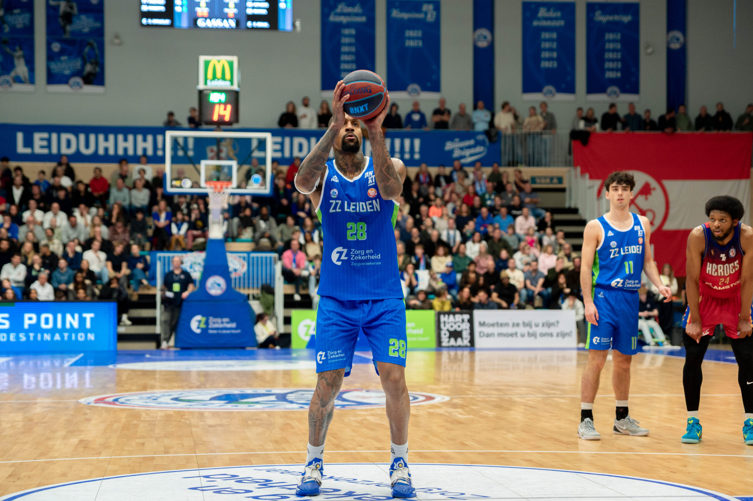 Zorg en Zekerheid Leiden heeft het jaar in een uitverkochte Arena 1574 enigszins in mineur afgesloten. Tegen aartsrivaal Heroes Den Bosch moest de Leidse formatie vooral in het tweede kwart passen. Dat ging met 18-35 verloren, waardoor ZZ Leiden bij rust tegen een achterstand van 12 punten aankeek: 45-57.