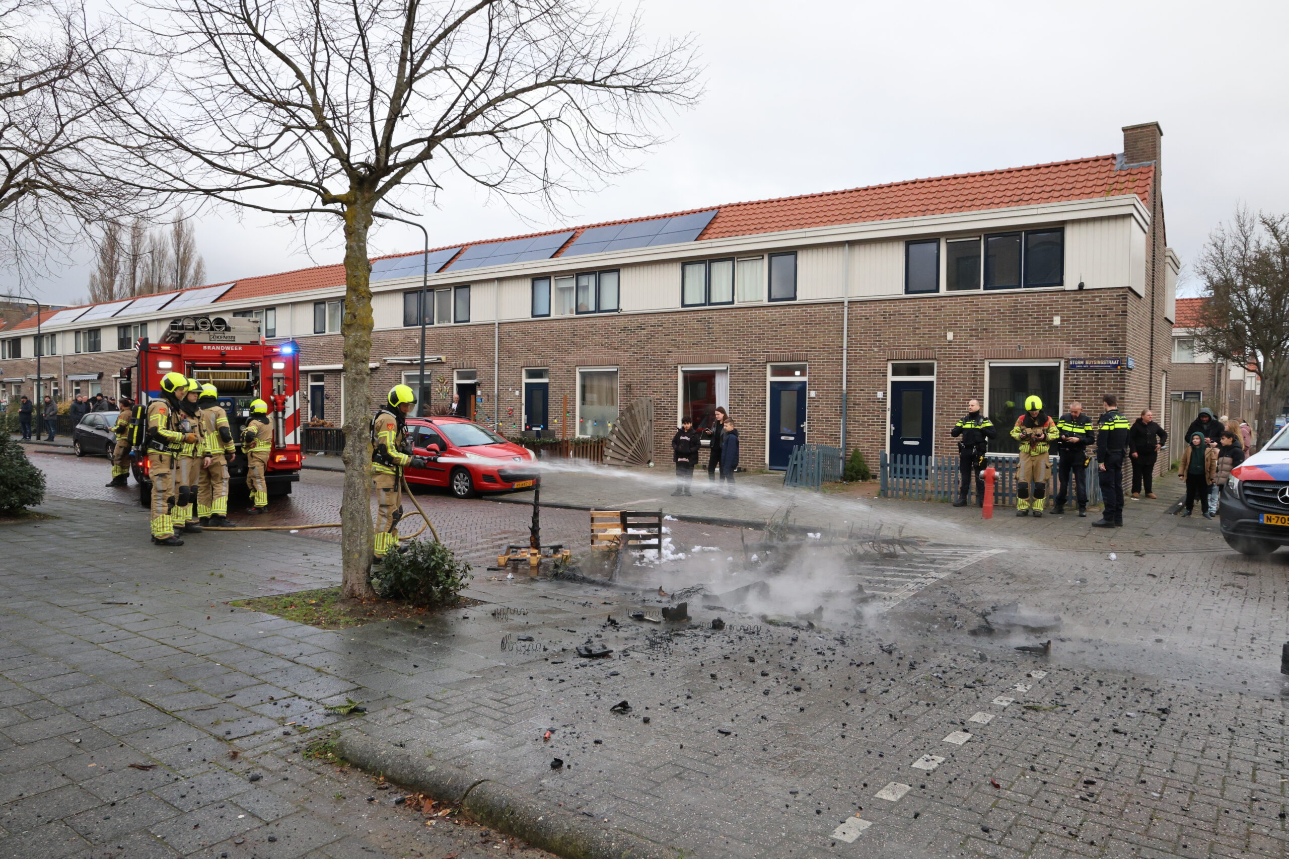 Op oudejaarsmiddag werden rond 14.00 uur enkele pallets en kerstbomen op straat in brand gestoken. Dat gebeurde in de Storm Buysingstraat in Leiden. De brandweer heeft de boel geblust. (Foto: Regio15)