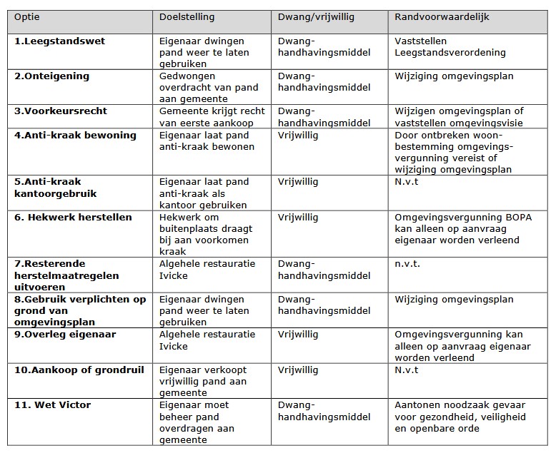 De elf opties bestaan uit vrijwillige maatregelen die de medewerking van Van de Putte vereisen, maar ook dwangmiddelen zoals onteigening en een algeheel herstel. Bij de dwangmiddelen dreigen hoge kosten en langdurige procedures. “Bekend is dat Van de Putte doorgaans geen rechtsmiddel onbenut laat”, zo schrijft het college aan de raad. Er zouden momenteel overigens ‘constructieve gesprekken’ worden gevoerd met de krottenkoning over realistische en uitvoerbare plannen voor de restauratie, herstel en de ingebruikname van Huize Ivicke.