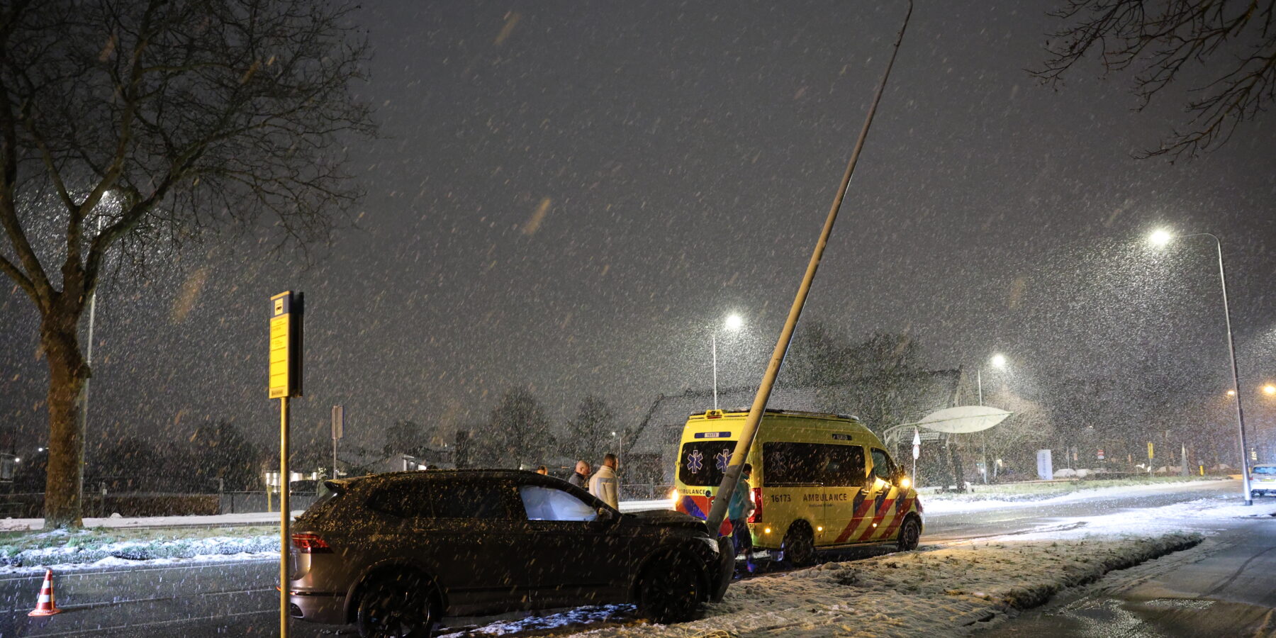 De schade aan de auto en de lantaarnpaal is aanzienlijk. De oorzaak van het ongeval is de gladheid door de besneeuwde weg. De politie doet nog nader onderzoek naar de toedracht.