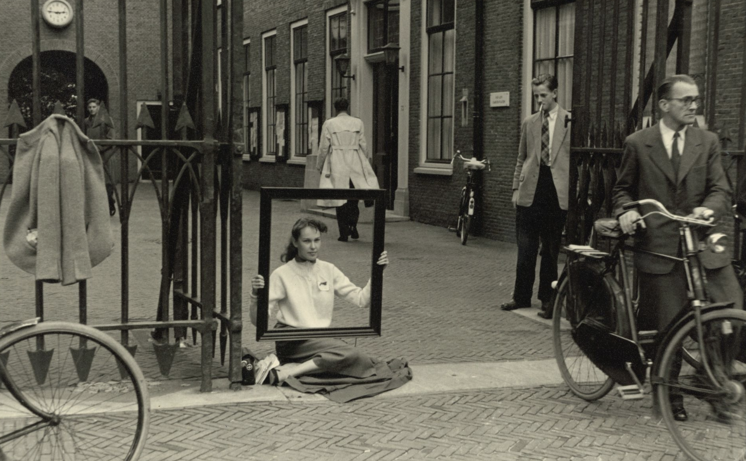 De Universiteit Leiden is op zoek naar de identiteit van een student die in 1955 met een grote zwarte fotolijst om haar hoofd voor het Academiegebouw zat. De foto werd onlangs gevonden in oude fotomappen op de zolder van het gebouw.