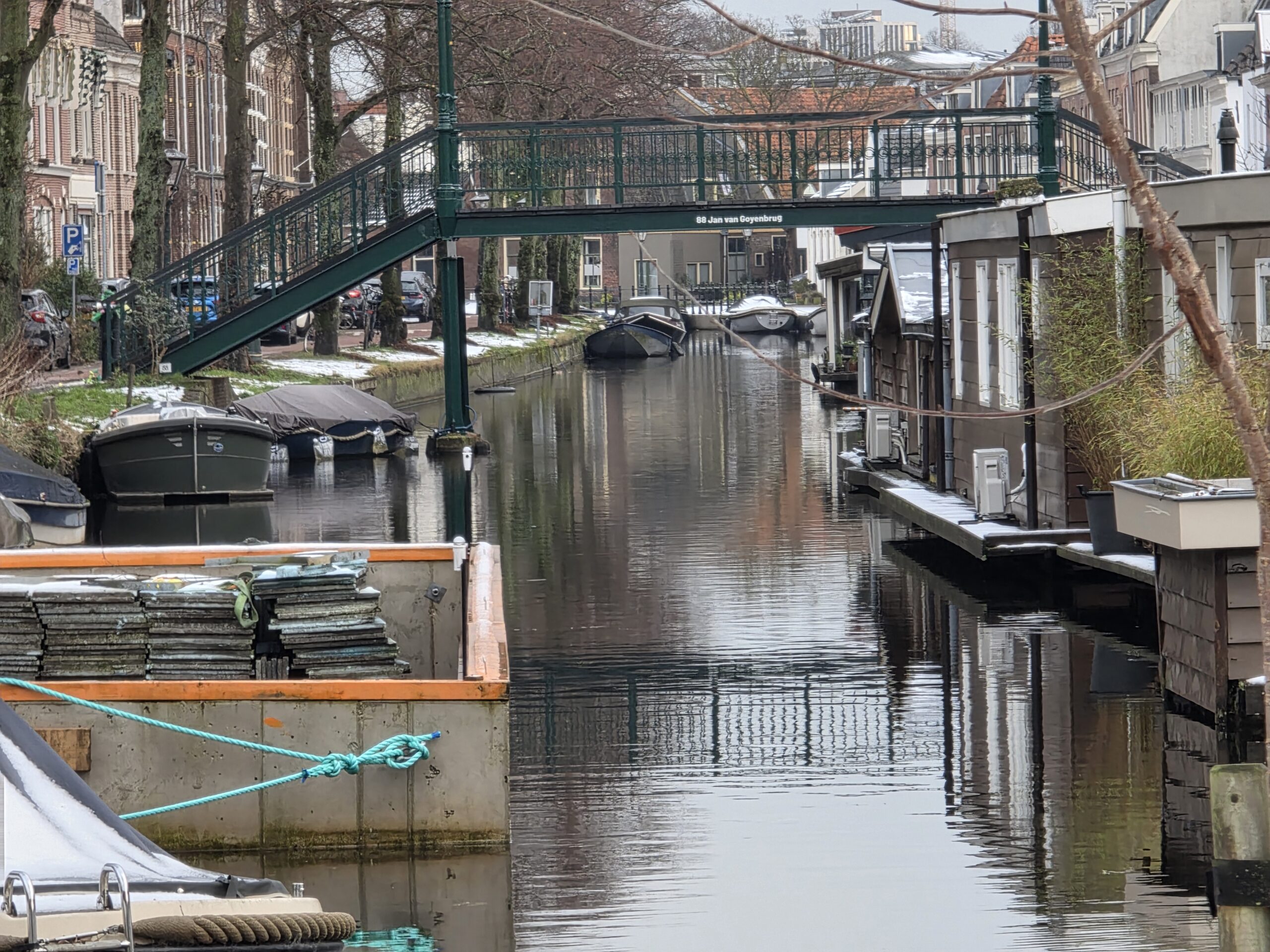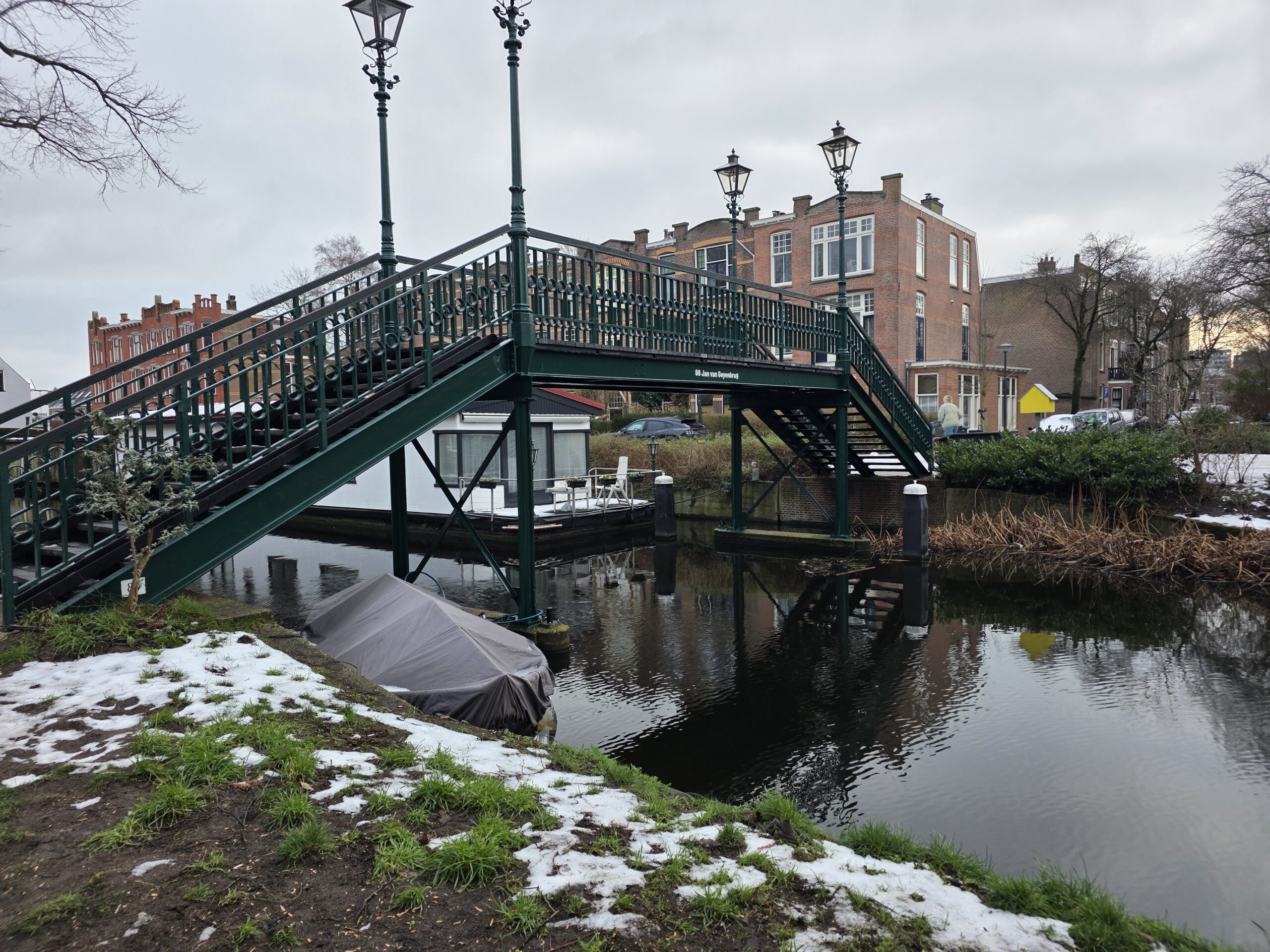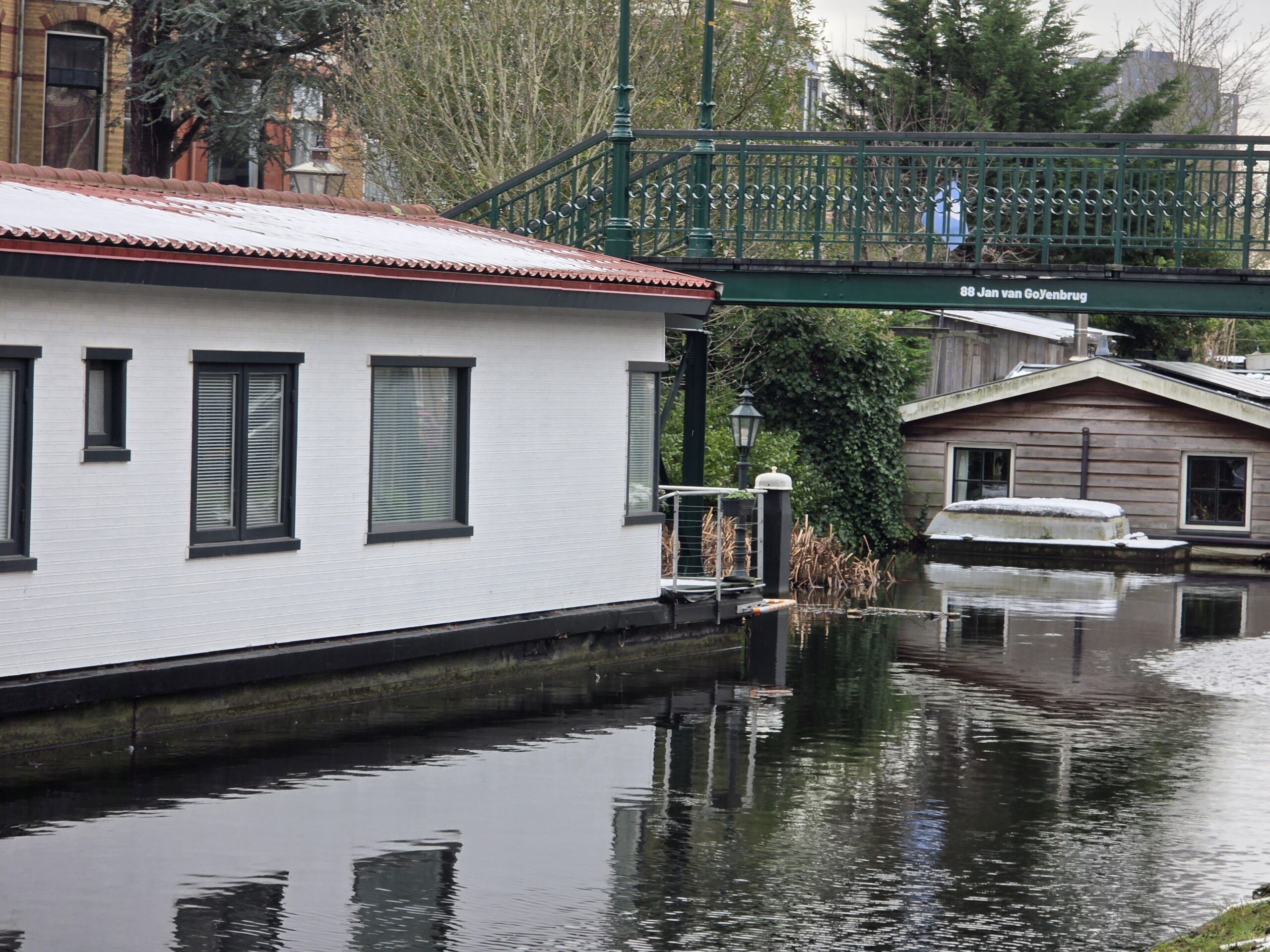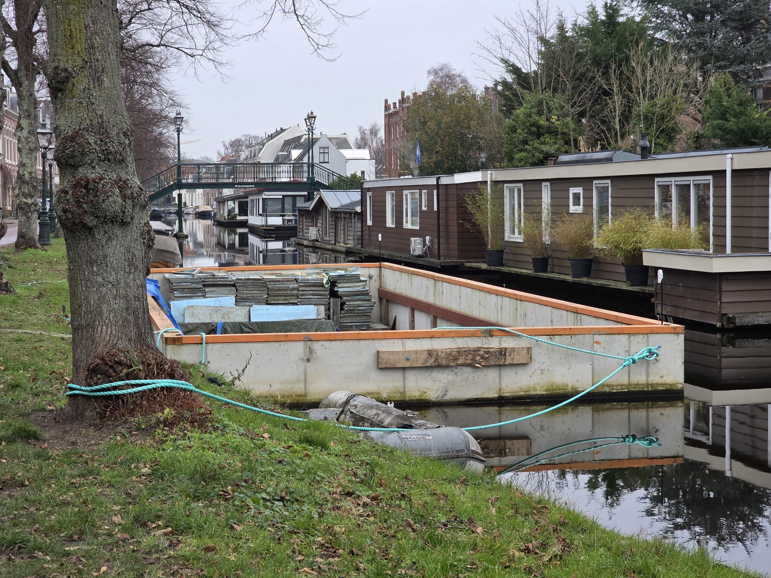 De betonnen bak waarop de nieuwe woonboot gebouwd gaat worden werd een paar maanden geleden naar Leiden gevaren. Bijna op de plek van bestemming liep het project voorlopig vast. De boot ligt afgemeerd bij de Jan van Goyenbrug waar hij net niet tussen de pijlers door kan. Of eigenlijk net wel, maar dan moet wel zijn hoogbejaarde buurvrouw met haar woonark tijdelijk van haar plek om die doorvaart mogelijk te maken. En daar had de 92-jarige geen zin in. Voornamelijk uit angst voor schade.