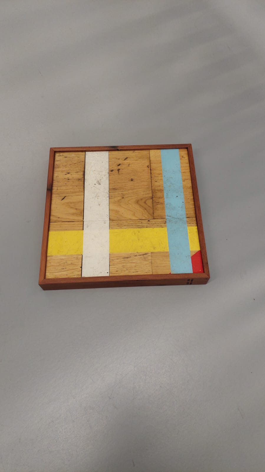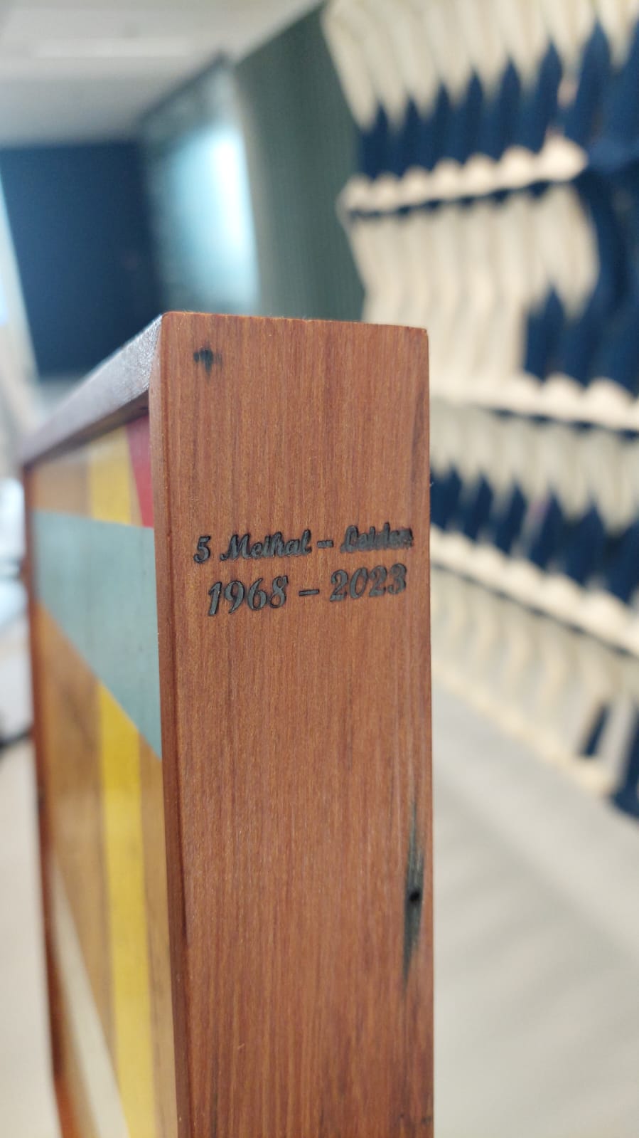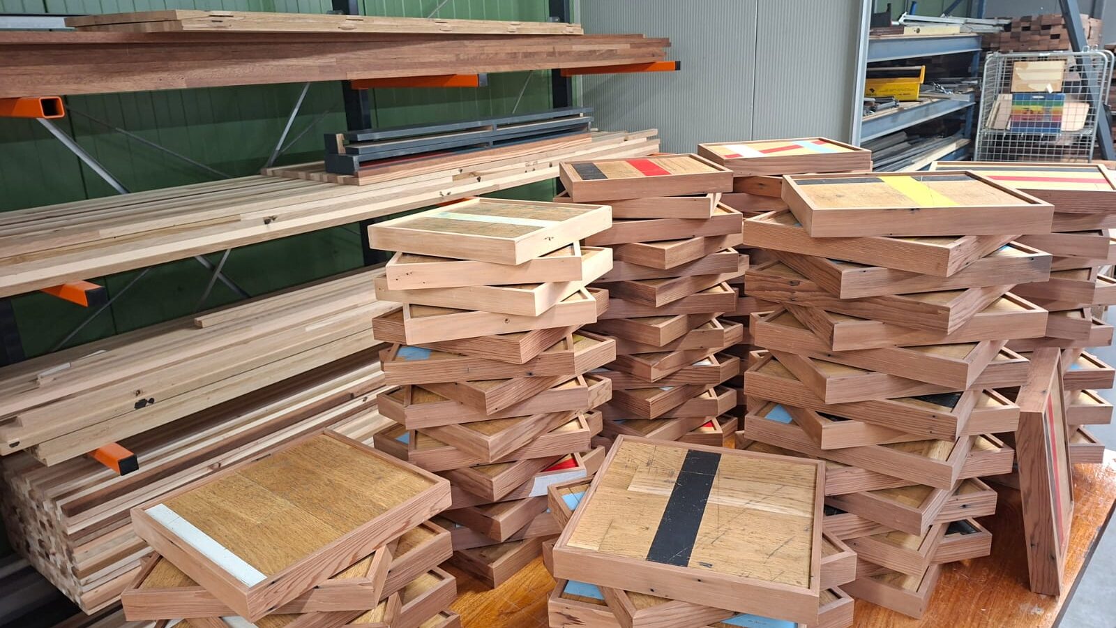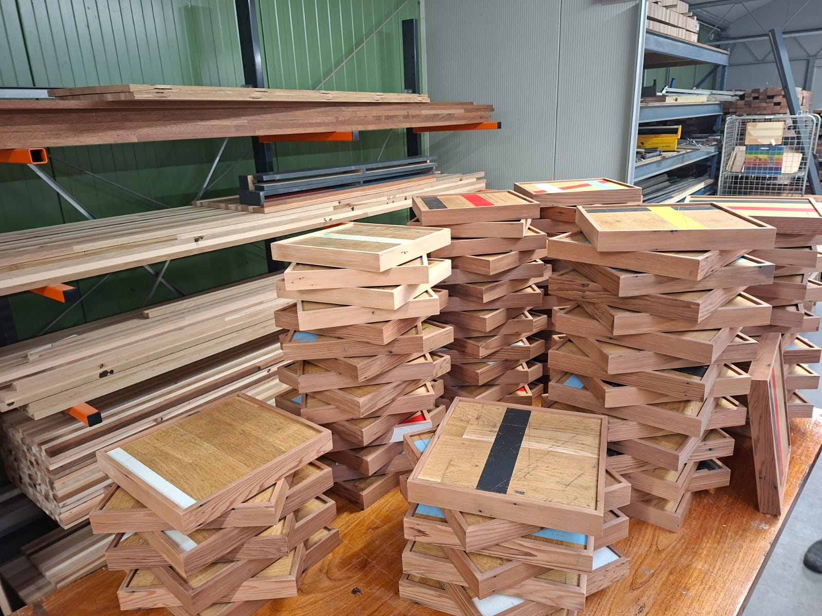 Ongeveer vijf maanden geleden tijdens het leeghalen zijn stukken van de vloer naar De Zijlbedrijven (DZB) gestuurd. Daar zijn ze in stukken van dertig bij dertig centimeter gezaagd en vervolgens ingelijst. Op de houten lijst staat ‘5 Meihal – Leiden 1968 – 2023’ gebrandmerkt.