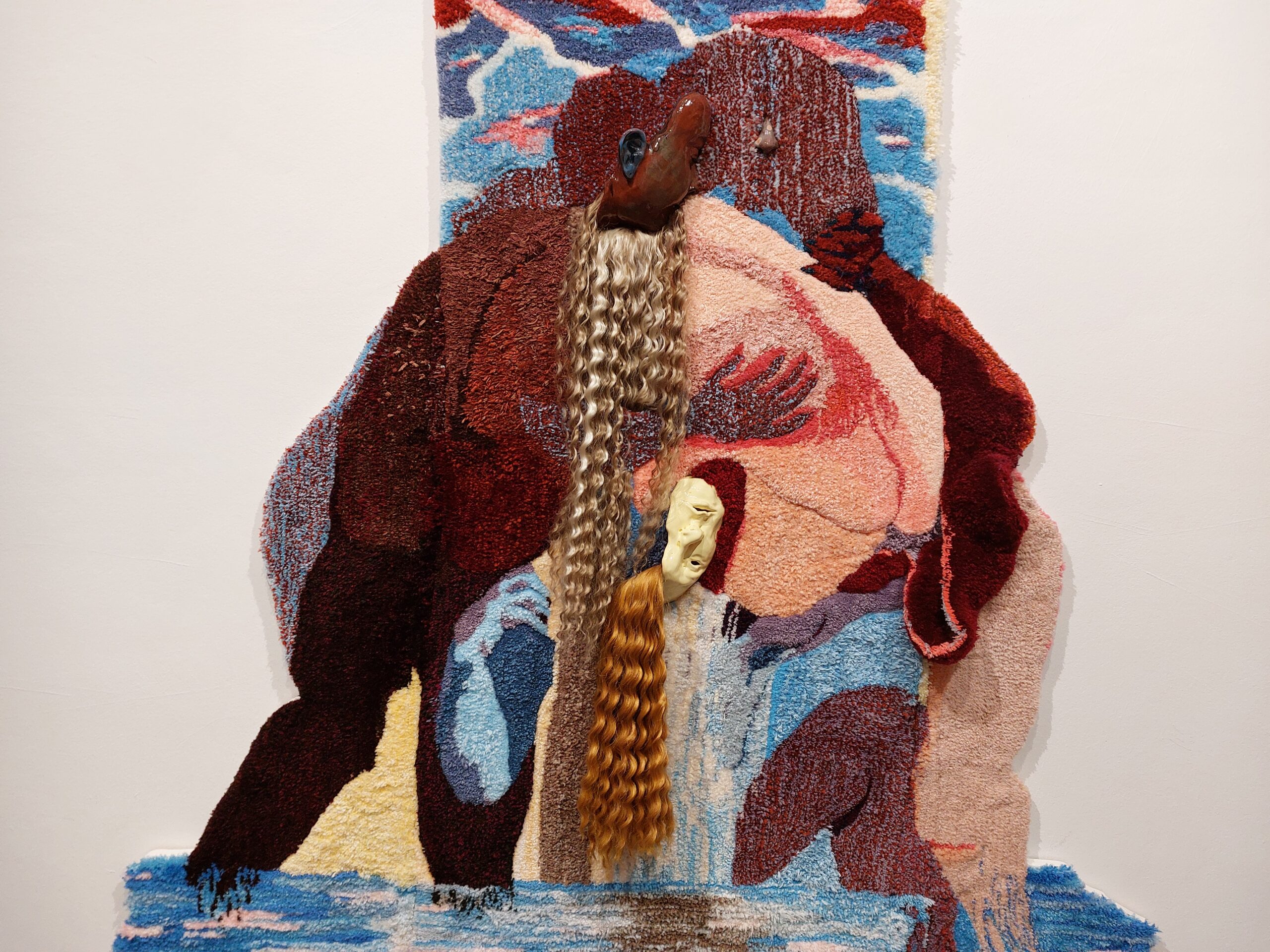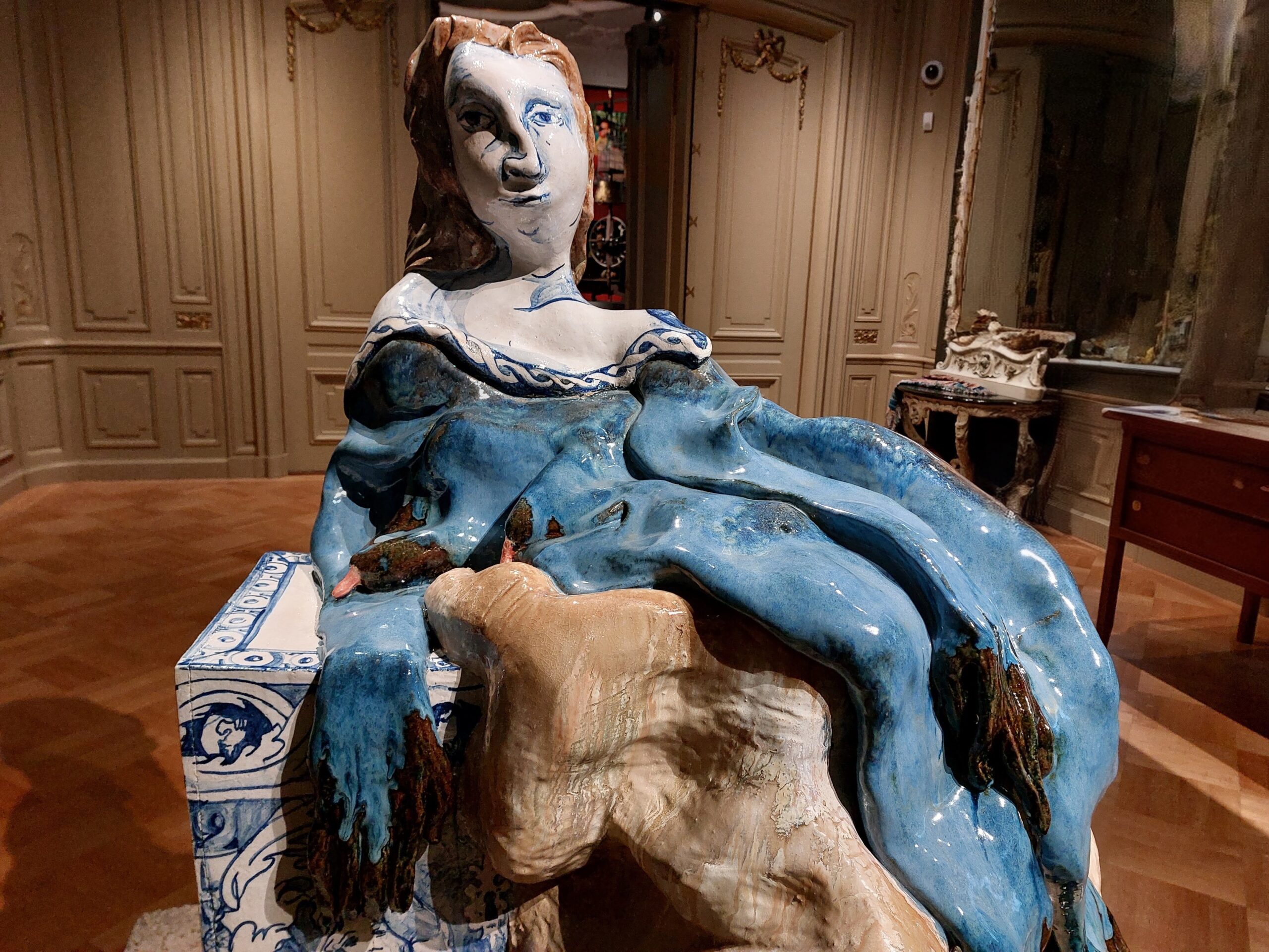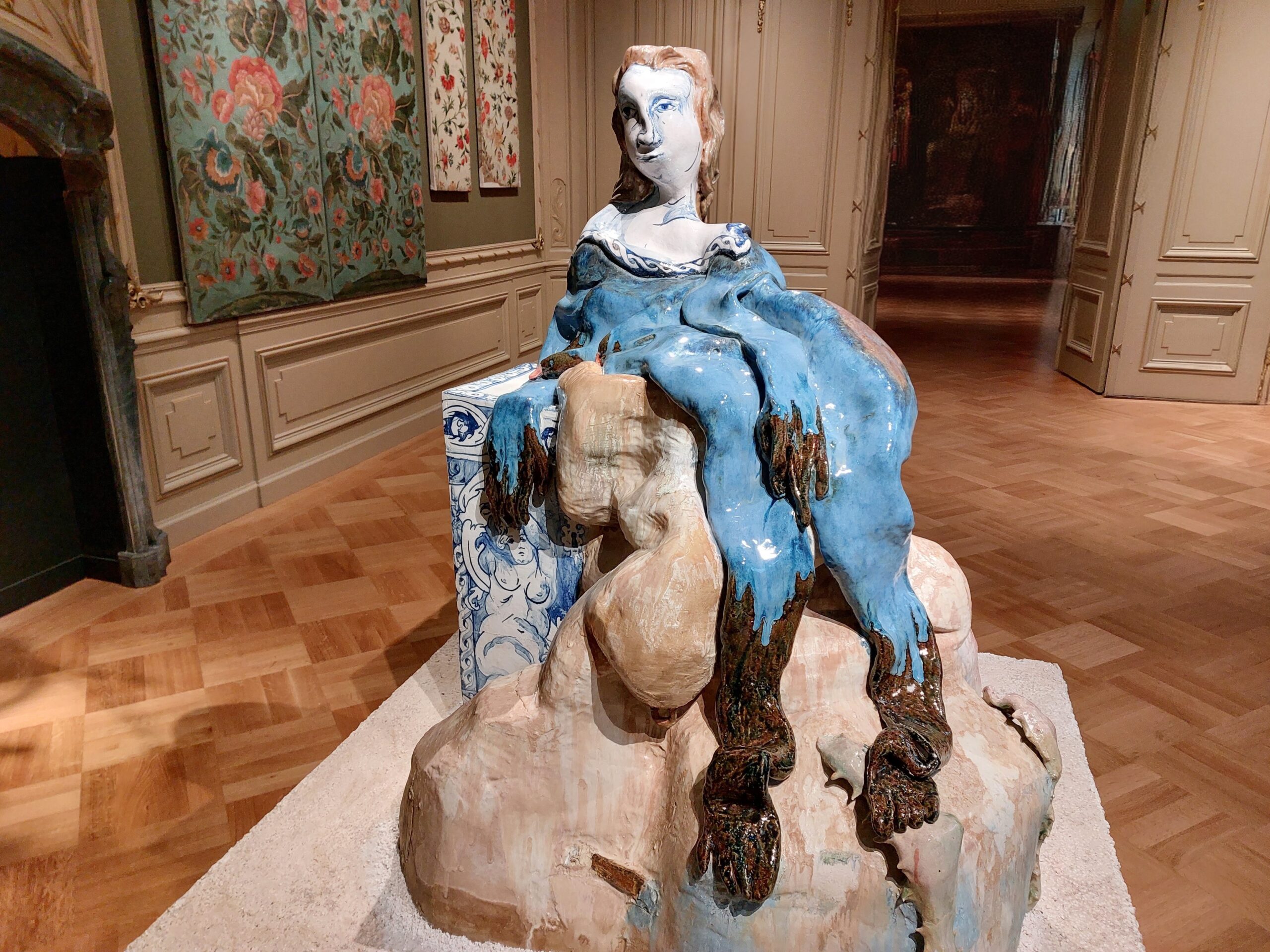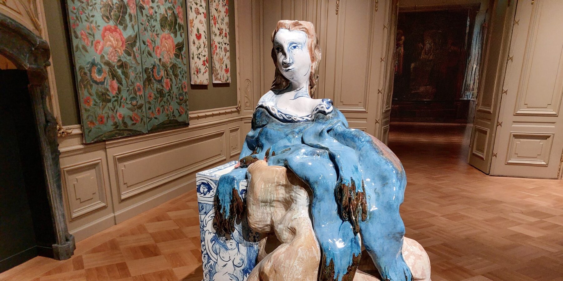 Voor de competitie heeft Esvelt, evenals de andere twee genomineerden, meerdere werken ingediend. Het meest prominent is haar keramische sculptuur van een achteroverleunende onderuitgezakte vrouwenfiguur op een pilaar bekleed met tegeltjes. “Die tegeltjes vormden eigenlijk het begin van deze sculptuur”, herinnert Esvelt zich. “Ik was al langer geïnteresseerd in Portugese Azulejo tegels, waar ik al in mijn kinderjaren kennis meemaakte omdat mijn vader Angolees-Portugees is. Bij het Europees Keramisch Werkcentrum heb ik in 2023 een residentie van drie maanden gedaan om te leren hoe ik tegels met die kenmerkende beschilderingen zou kunnen maken. Ben toen ook heel goed naar die tegels gaan kijken, waarin onder andere een connectie met het koloniaal- en slavernijverleden van Portugal te ontdekken is. Maar wat wilde ik er nou eigenlijk mee? Dat was een uitputtingsslag, maar ook de inspiratie voor dit beeld dat een soort luxueuze moeheid toont.”
