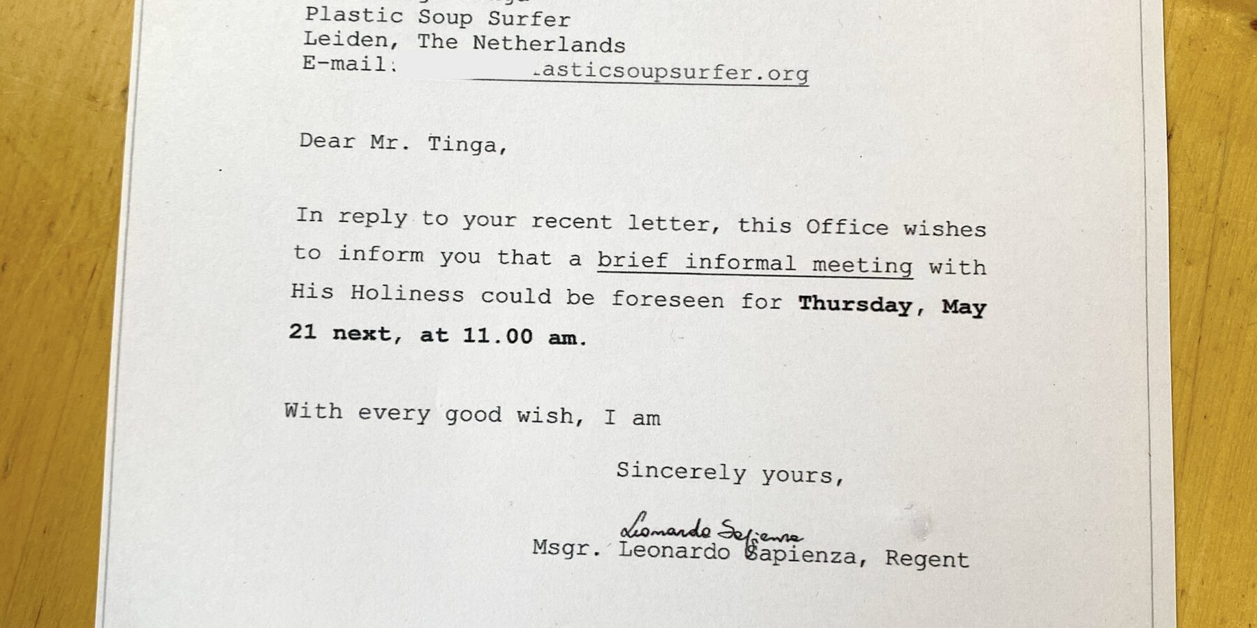 De Leidse Plastic Soup Surfer Merijn Tinga is uitgenodigd voor een ontmoeting met Paus Leo XIV. Dat laat het team achter de Plastic Soup Surfer weten.