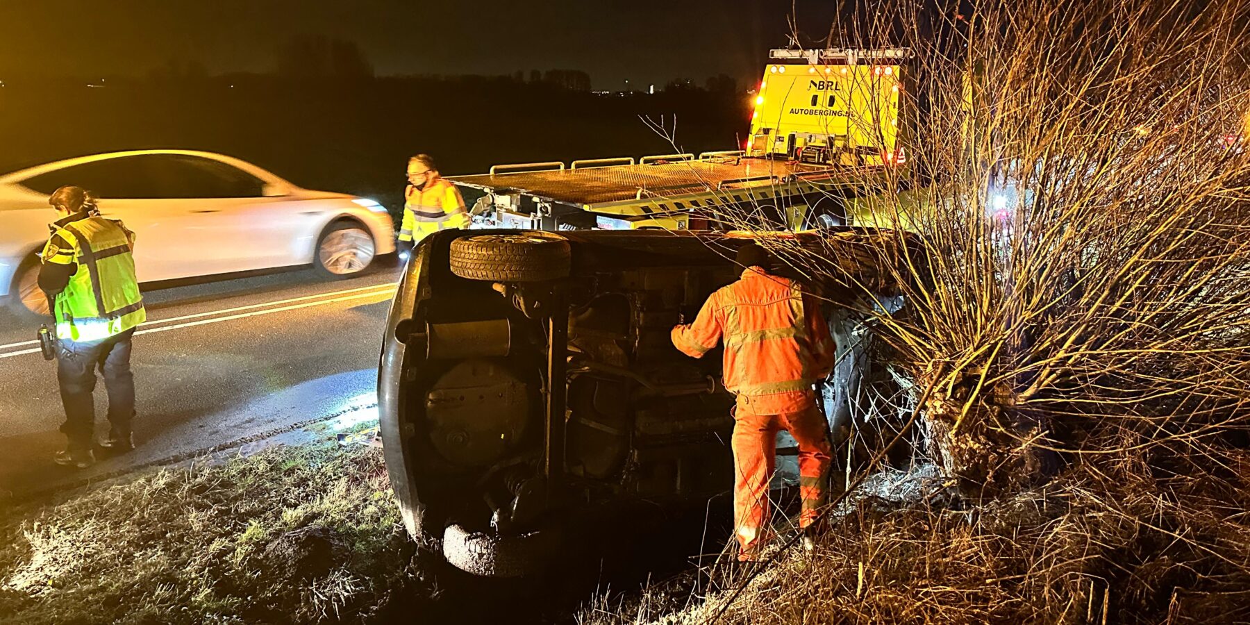 Langs de N206 bij Zoeterwoude is een auto op zijn kant in de berm terechtgekomen. Hulpdiensten kwamen snel ter plaatse. Een ambulance controleerde de bestuurder.
