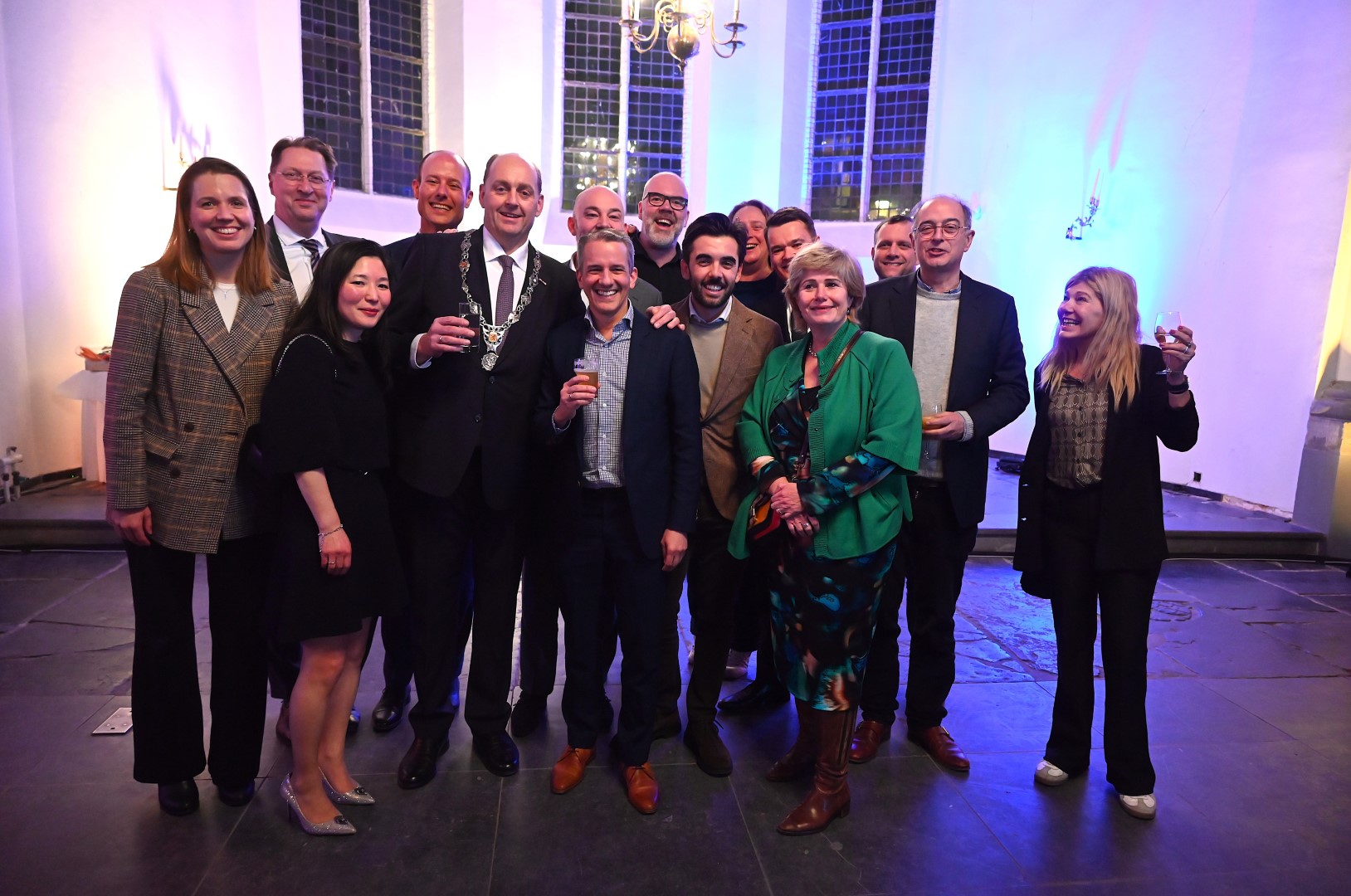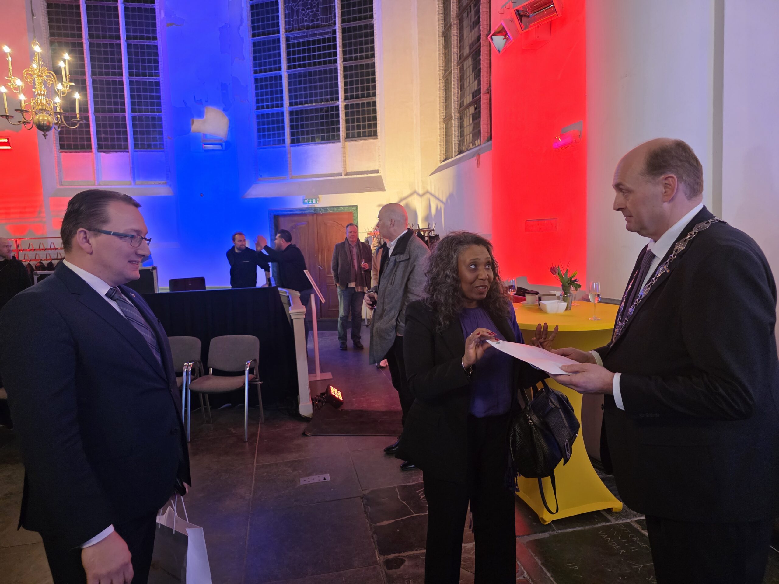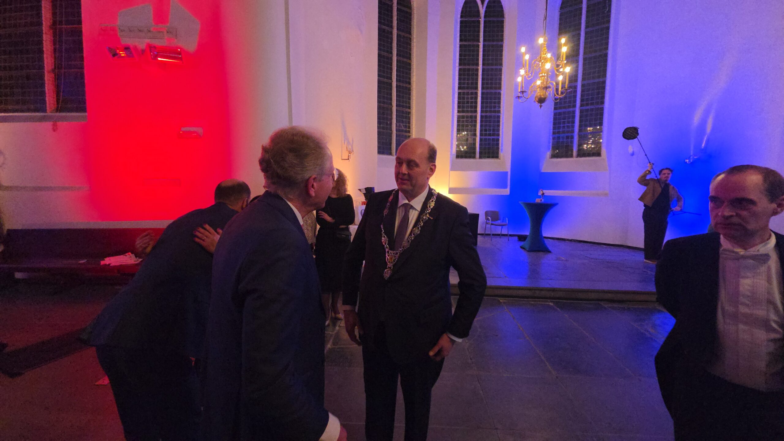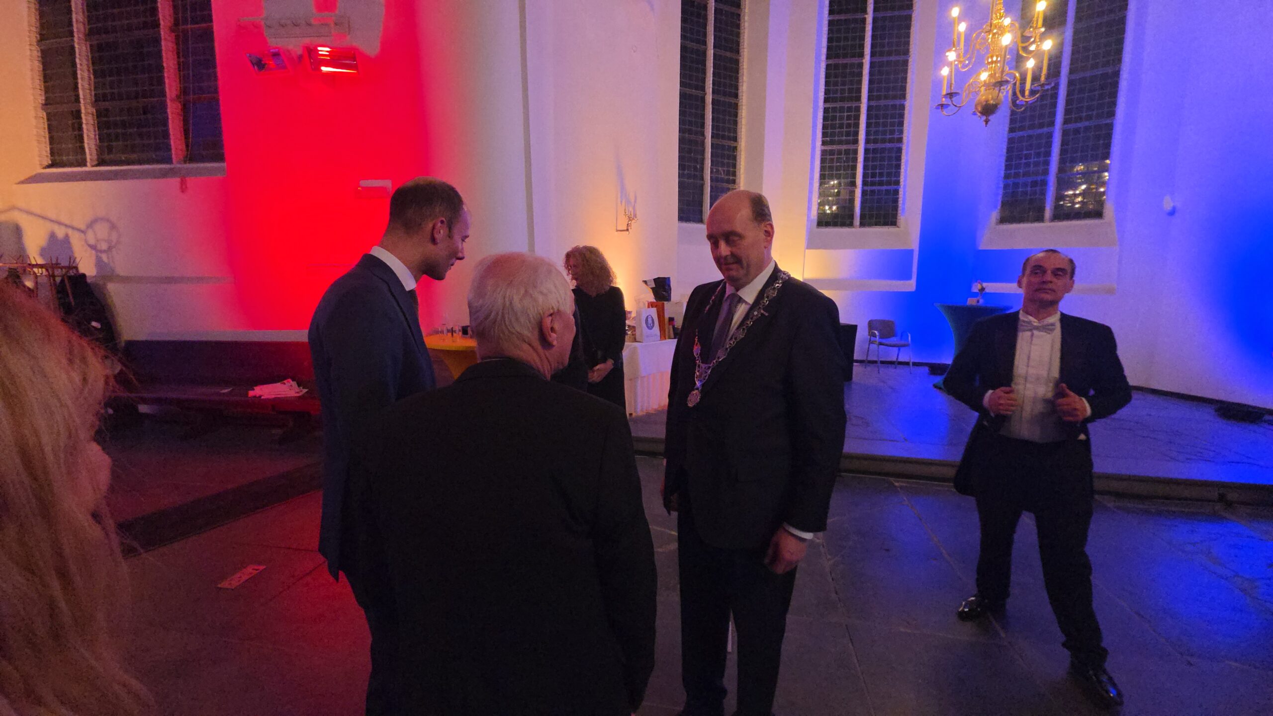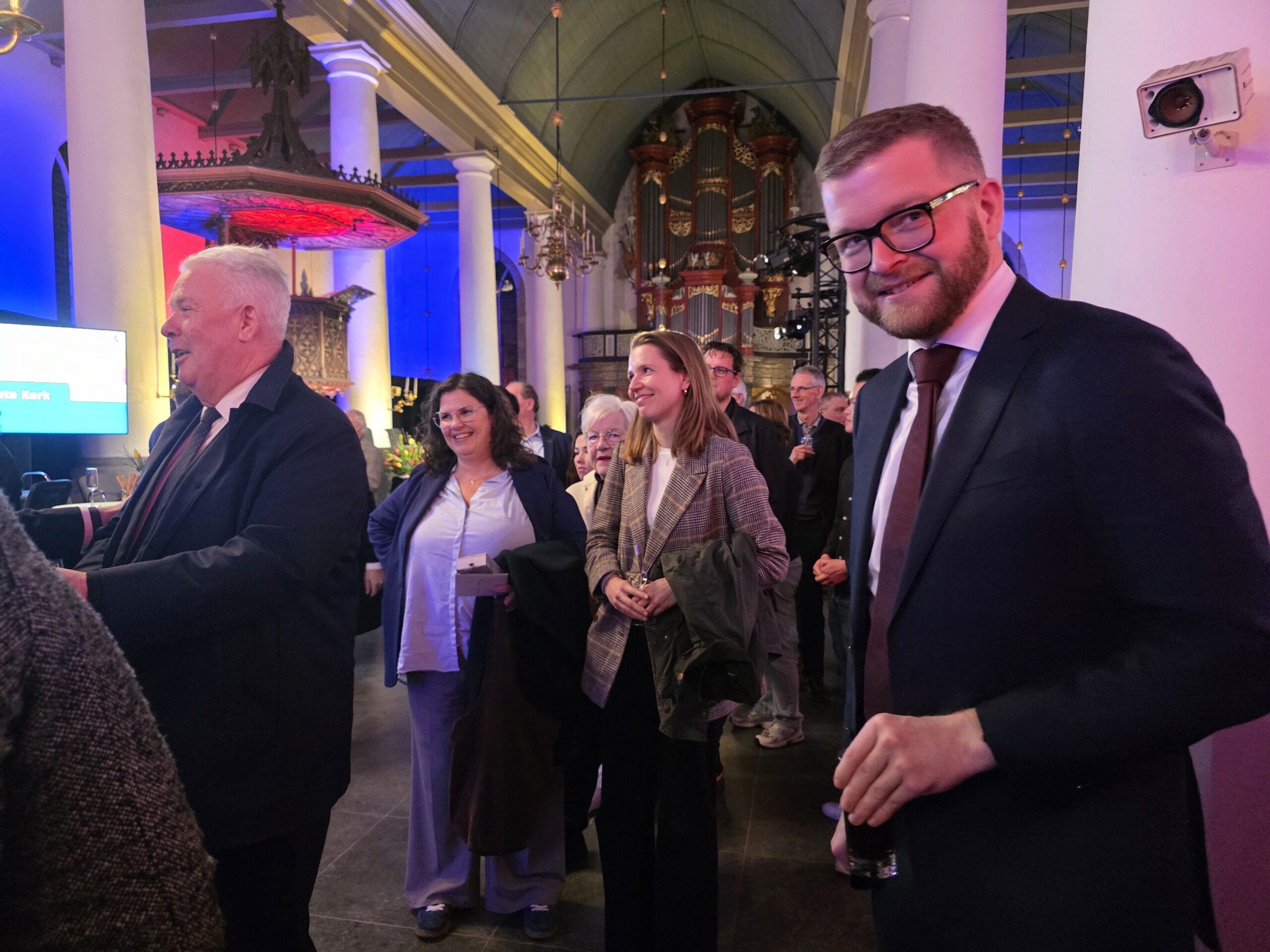 Om de bijzondere gebeurtenis bij te wonen was een hele delegatie uit Leiden afgereisd naar Vlaardingen. Daaronder en flink deel van de VVD-fractie, oud-wethouders Paul Laudy en Rogier van der Sande en ook oud-wethouder Yvonne van Delft die sinds begin deze maand directeur is van Stroomopwaarts. Dat is het reïntegratiebedrijf van onder andere Vlaardingen.